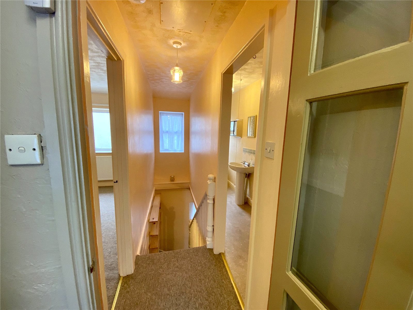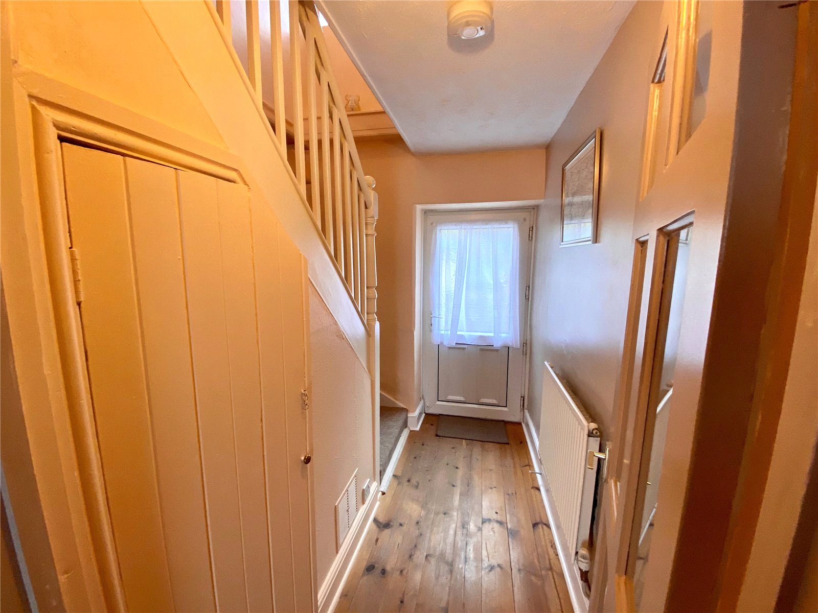 uPVC double-glazed rear entrance door, wooden flooring, radiator, lighting and stairway access to;