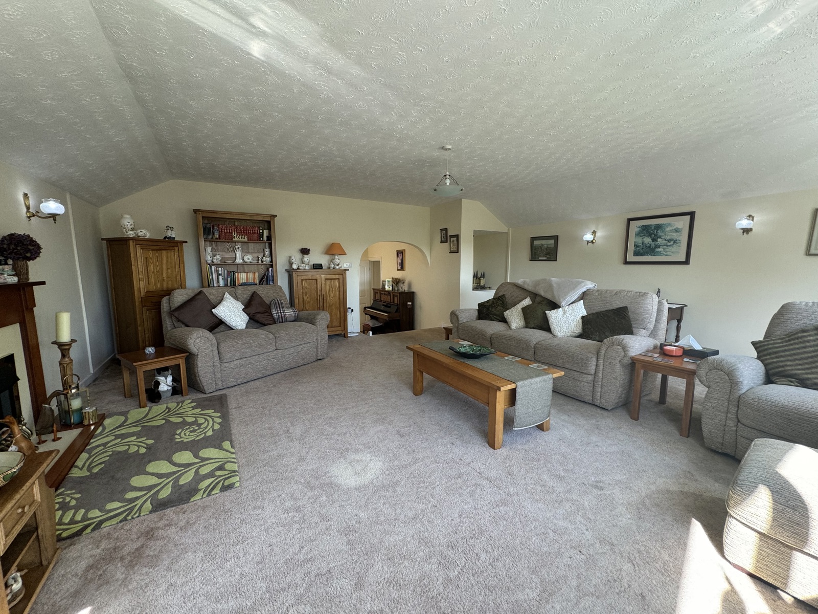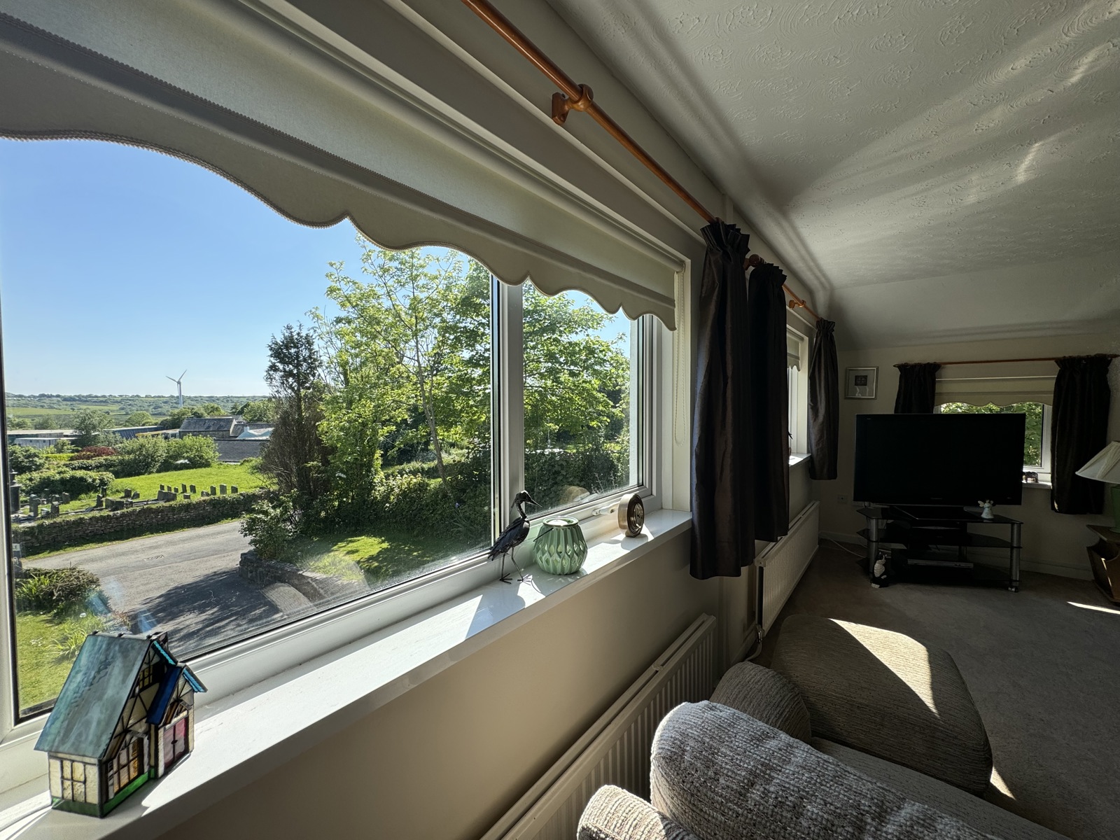 A bright and spacious room with rural views, fitted carpet, ceiling light, radiator x 3, feature timber fireplace with coal effect electric fire.