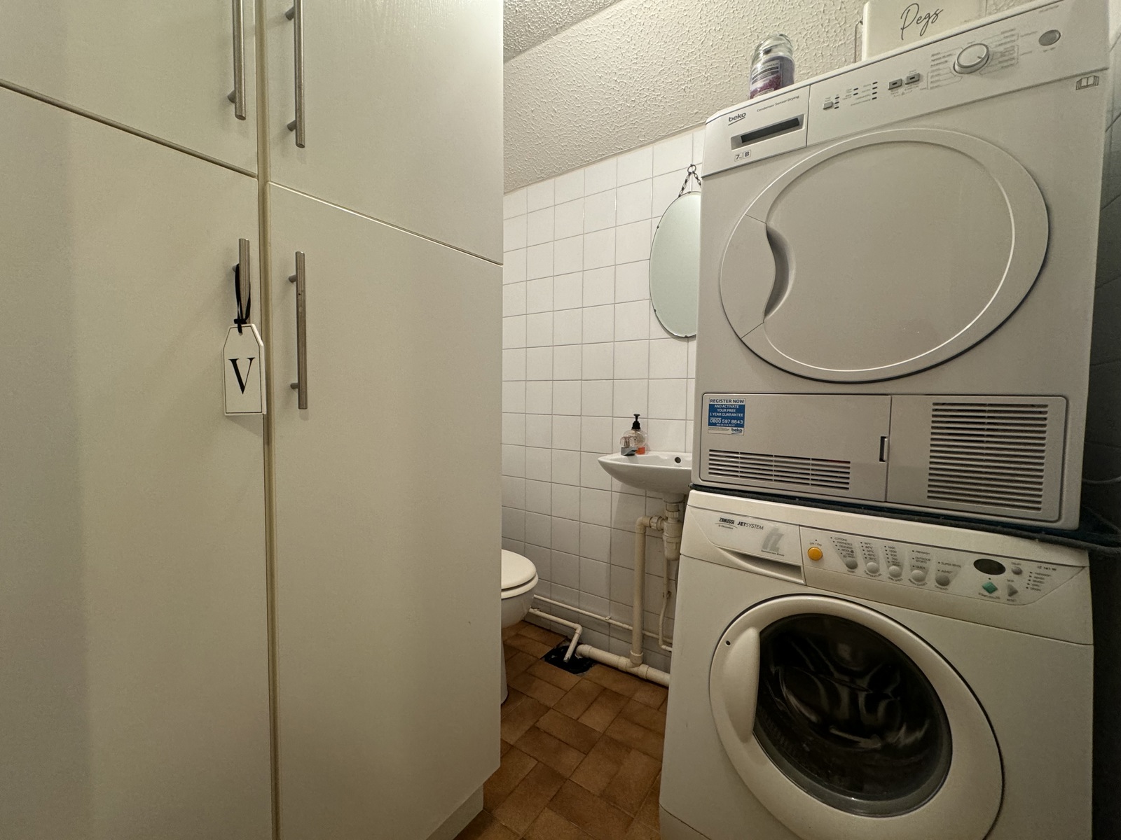 Tiled floor, ceiling light, plumbing for automatic washing machine