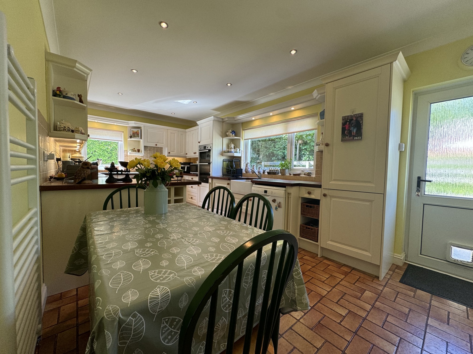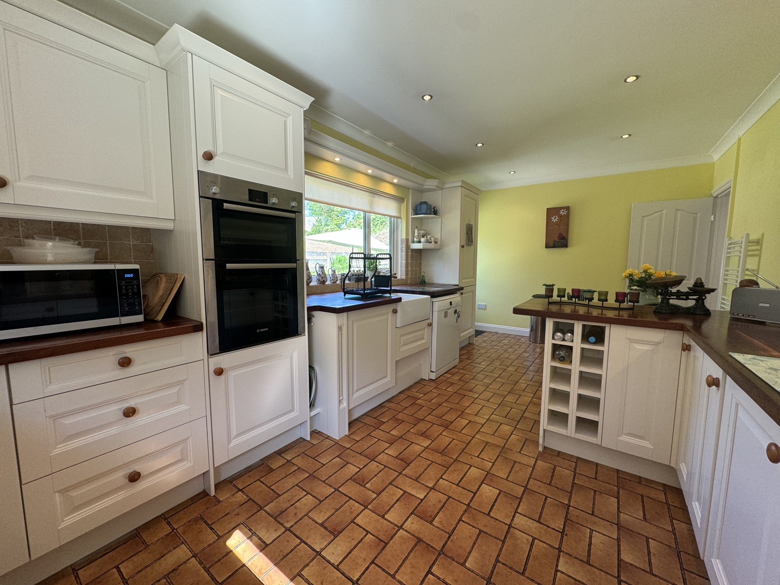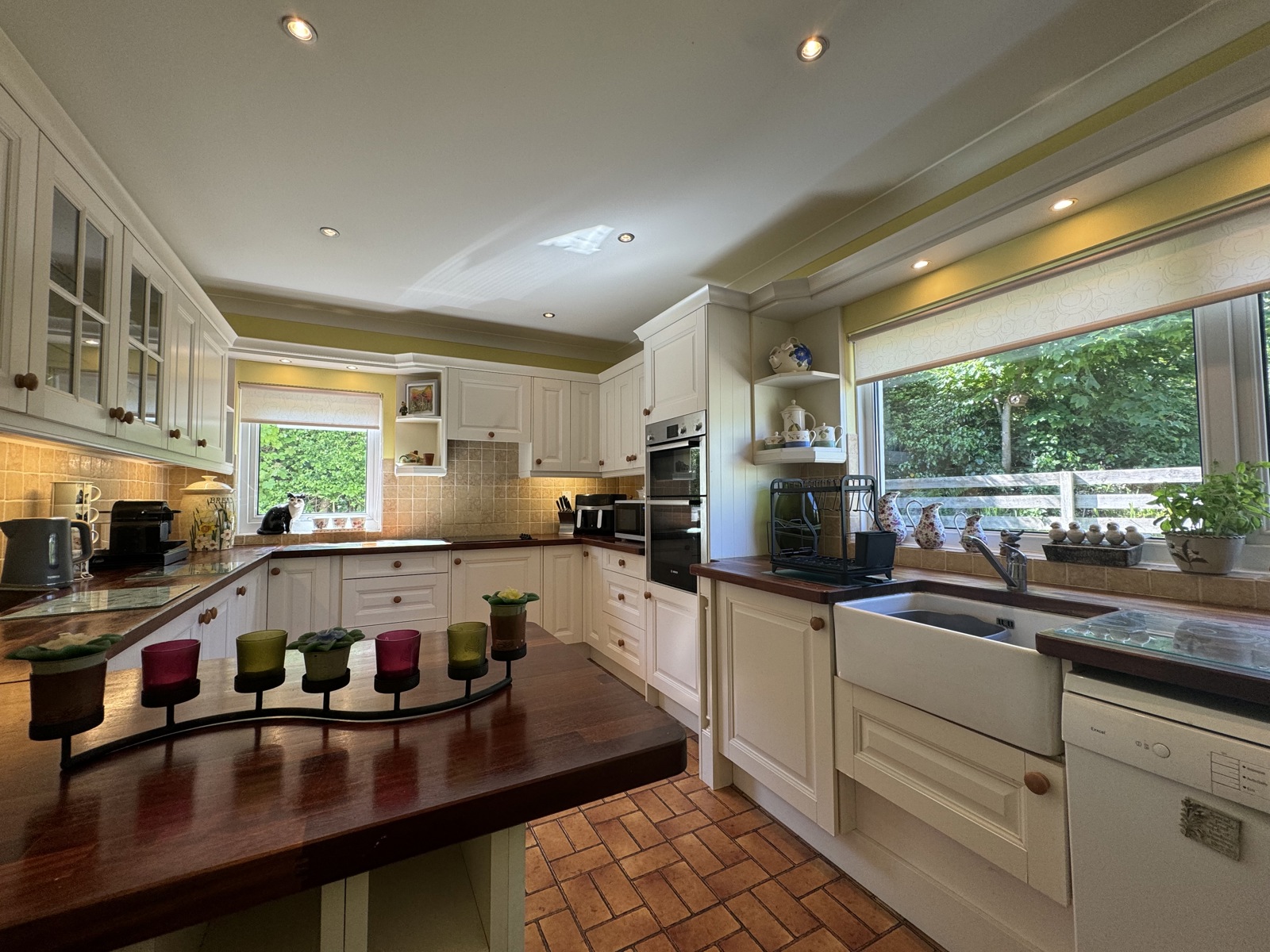 Tiled floor, recessed ceiling lights, ladder style radiator, double glazed window overlooks rear garden, further double glazed window to side, range of wall and base units with worktop over leading to breakfast bar, Belfast sink, integrated double electric oven, 4 ring electric hob with extractor over, plumbing for dishwasher, built in fridge/freezer, external double glazed door to rear