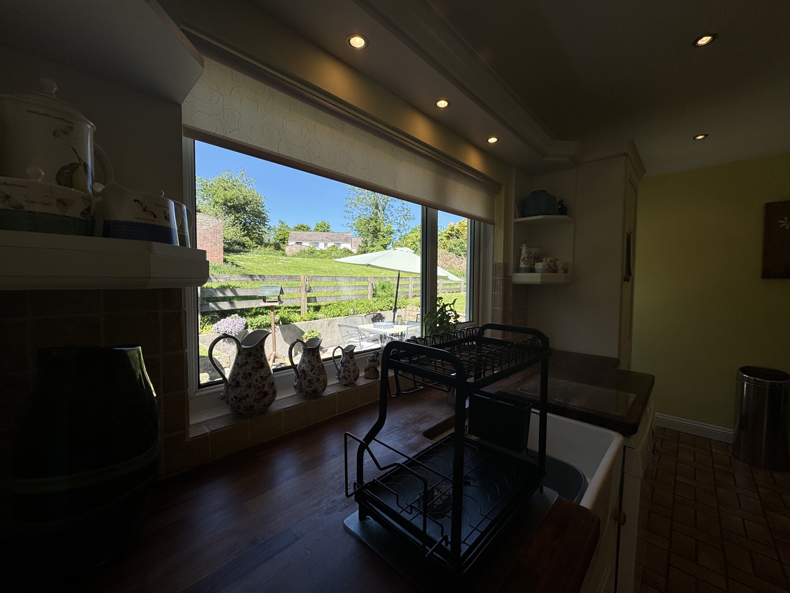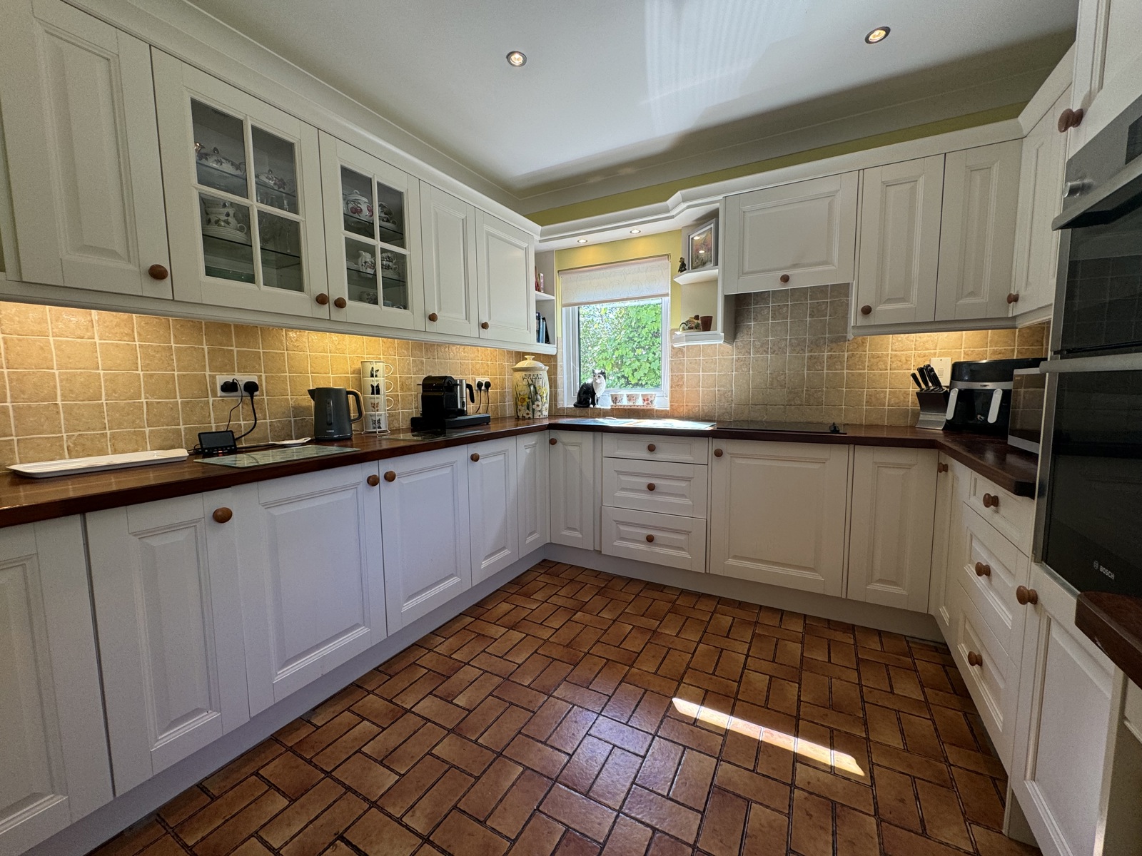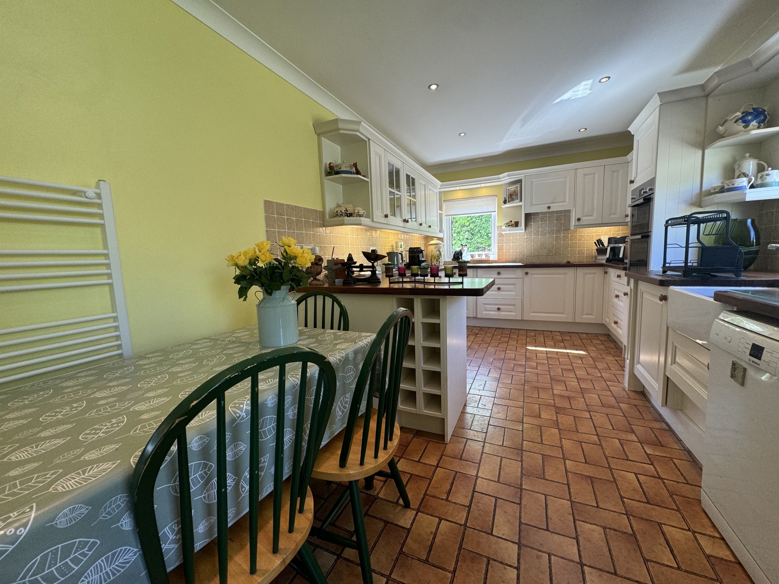 Tiled floor, recessed ceiling lights, ladder style radiator, double glazed window overlooks rear garden, further double glazed window to side, range of wall and base units with worktop over leading to breakfast bar, Belfast sink, integrated double electric oven, 4 ring electric hob with extractor over, plumbing for dishwasher, built in fridge/freezer, external double glazed door to rear