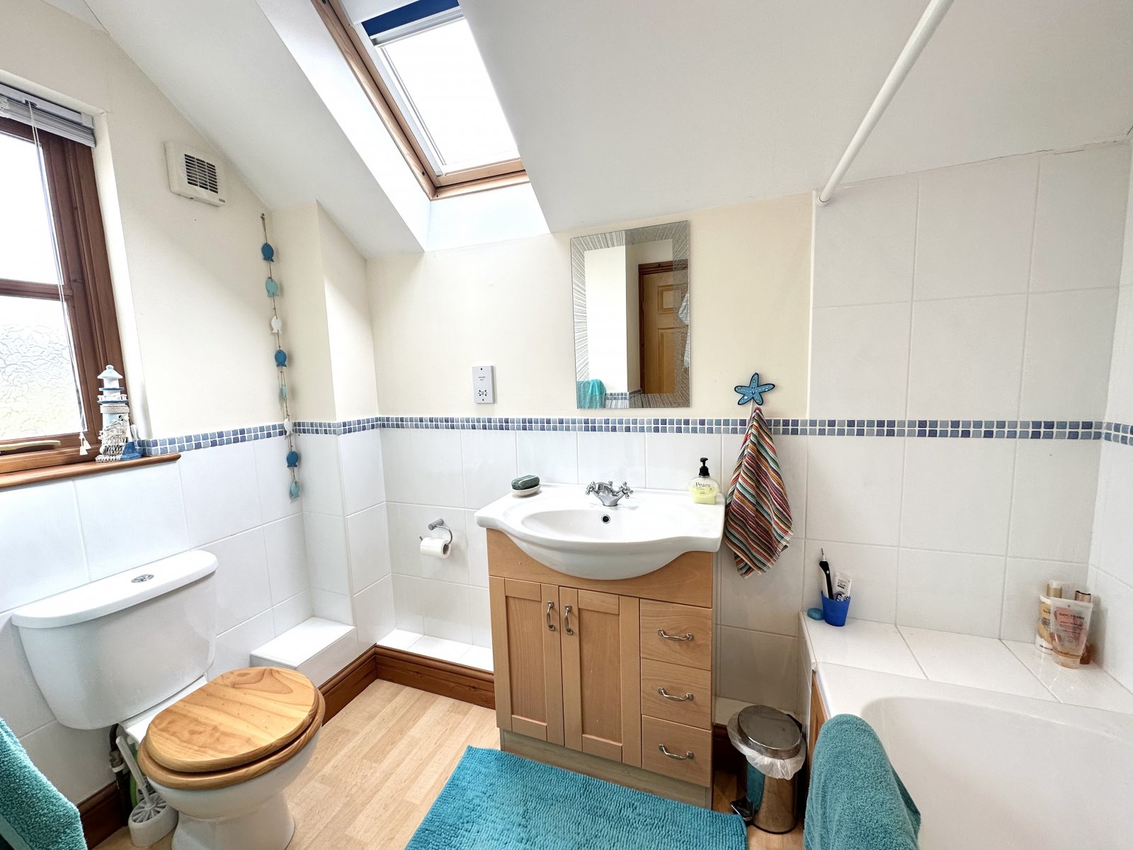 Vinyl floor, fully tiled bath with shower over, WC, wash hand basin, obscure glass double glazed window to side, velux, radiator.