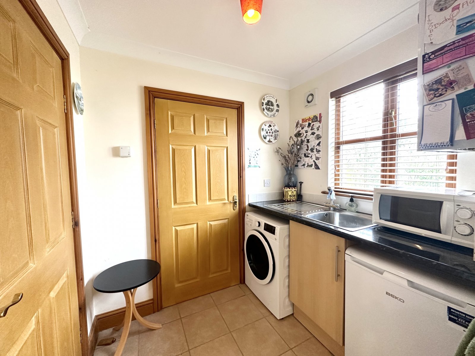 Tiled floor, base unit, sink and drainer, space for white goods, double glazed window to rear.