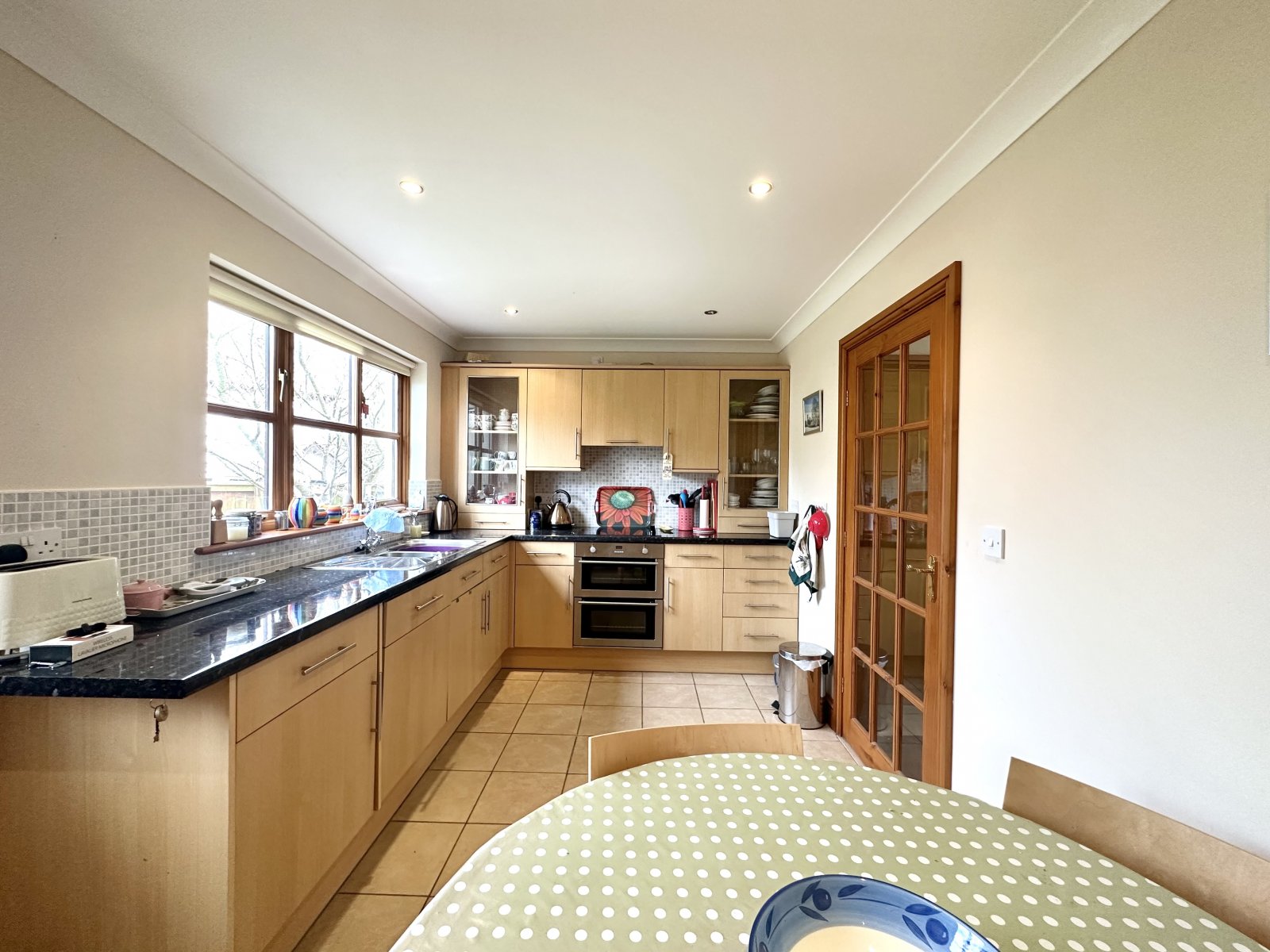 Tiled floor, range of base and eye level units, sink and drainer, electric hob and oven, integrated dishwasher and fridge,tile splashback, double glazed window and door to rear, radiator.