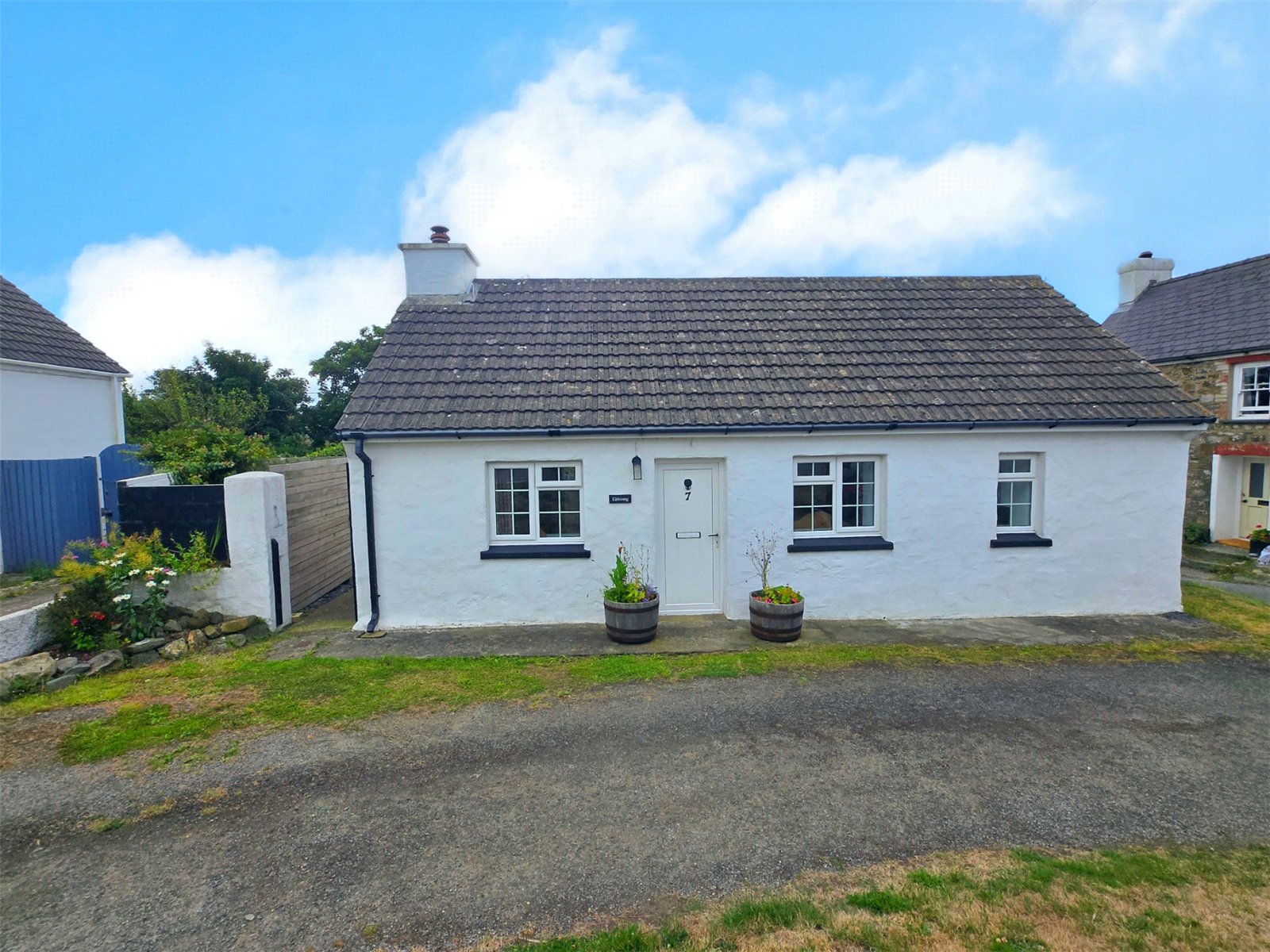 This charming cottage-style property offers a delightful blend of rustic character and well-maintained outdoor spaces. The front of the house features a clean, white-rendered facade with a classic gray tiled roof. The property has a generous gravel area, providing ample off-road parking. The entrance is a white door, framed by two decorative potted plants, and is flanked by two large windows, ensuring the interior is filled with light.