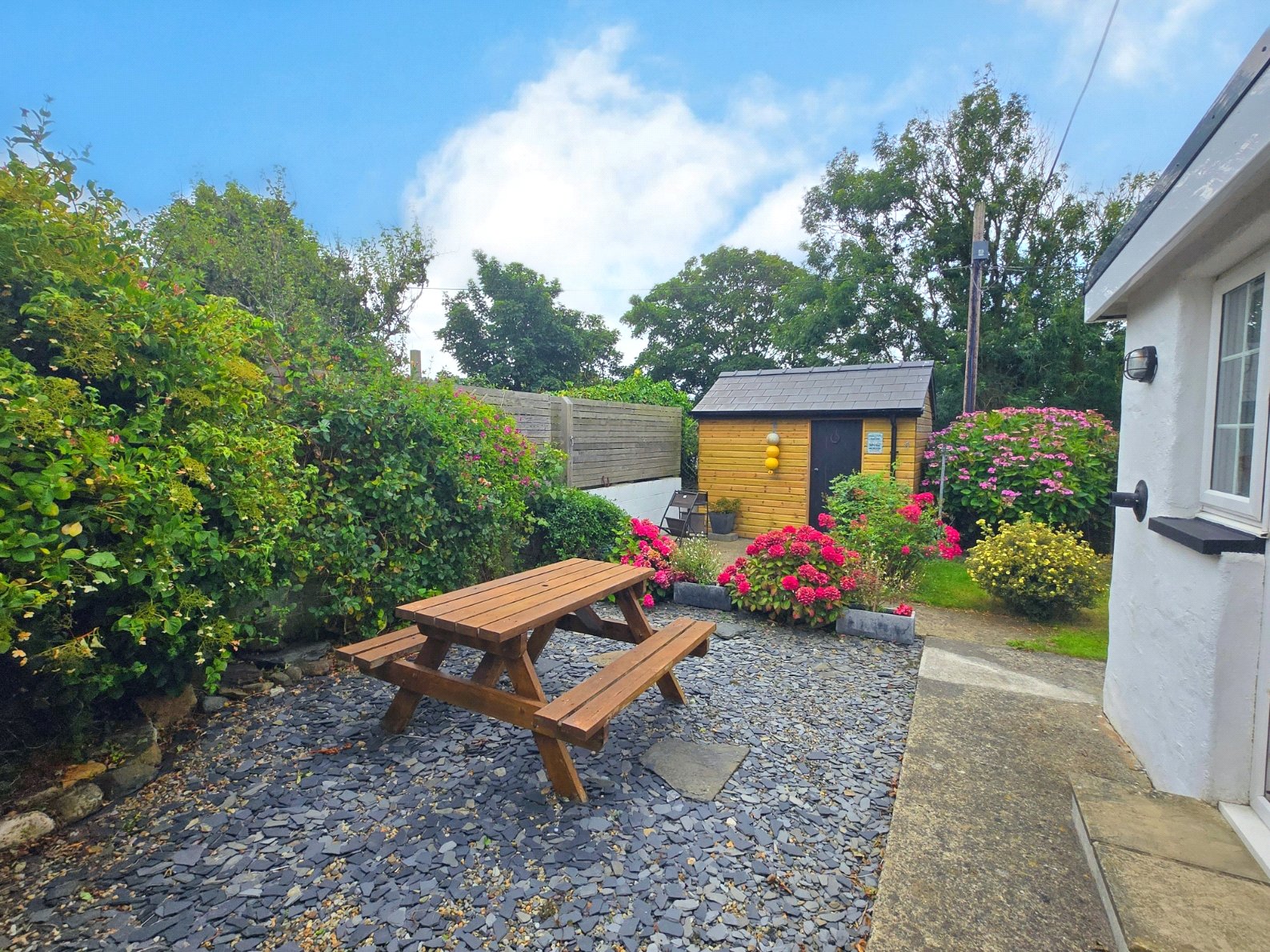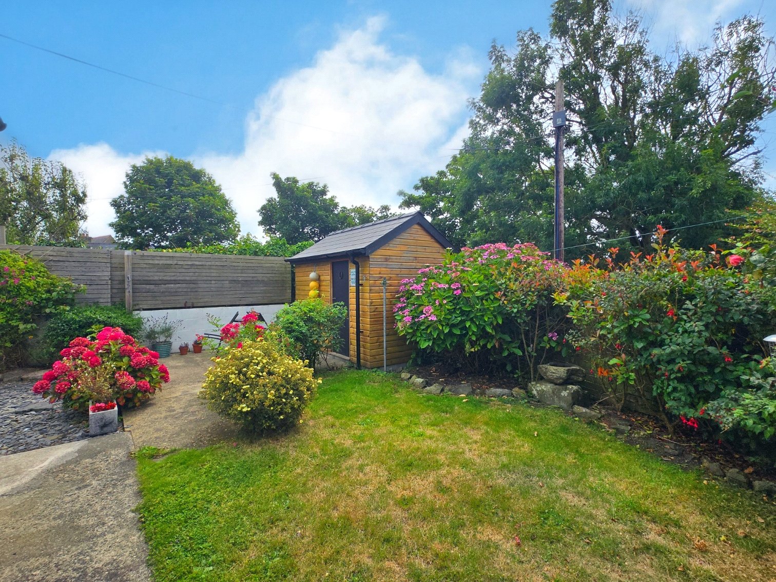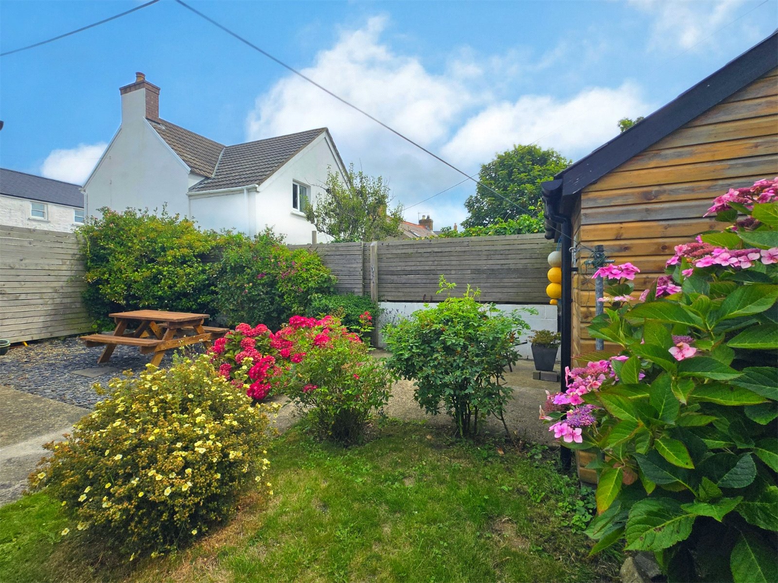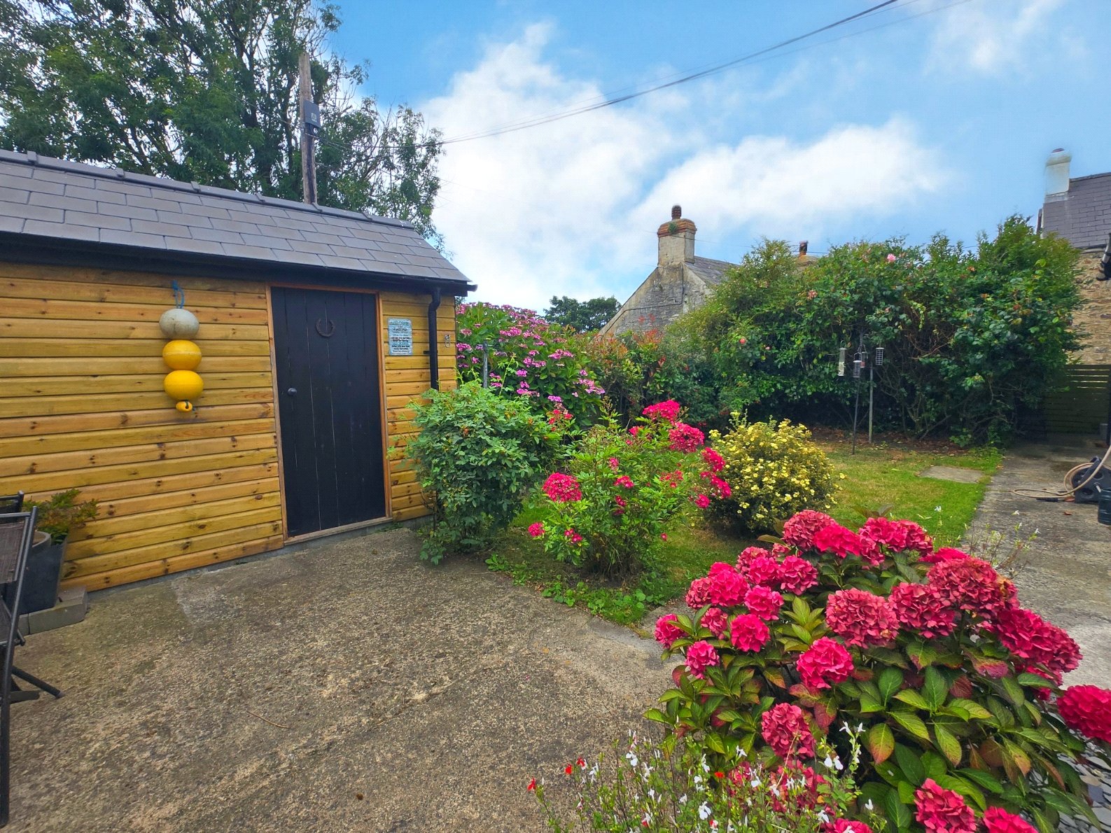 Beyond this area, the garden transitions into a lush lawn surrounded by vibrant, mature flower beds. The beds are bursting with color, featuring large, impressive pink hydrangeas and other flowering shrubs. A well-maintained wooden shed provides excellent storage. The garden is enclosed by a combination of low walls and wooden fencing, offering a sense of privacy and seclusion. The property's exterior and garden are perfect for those who appreciate a blend of traditional charm and practical, beautiful outdoor living.