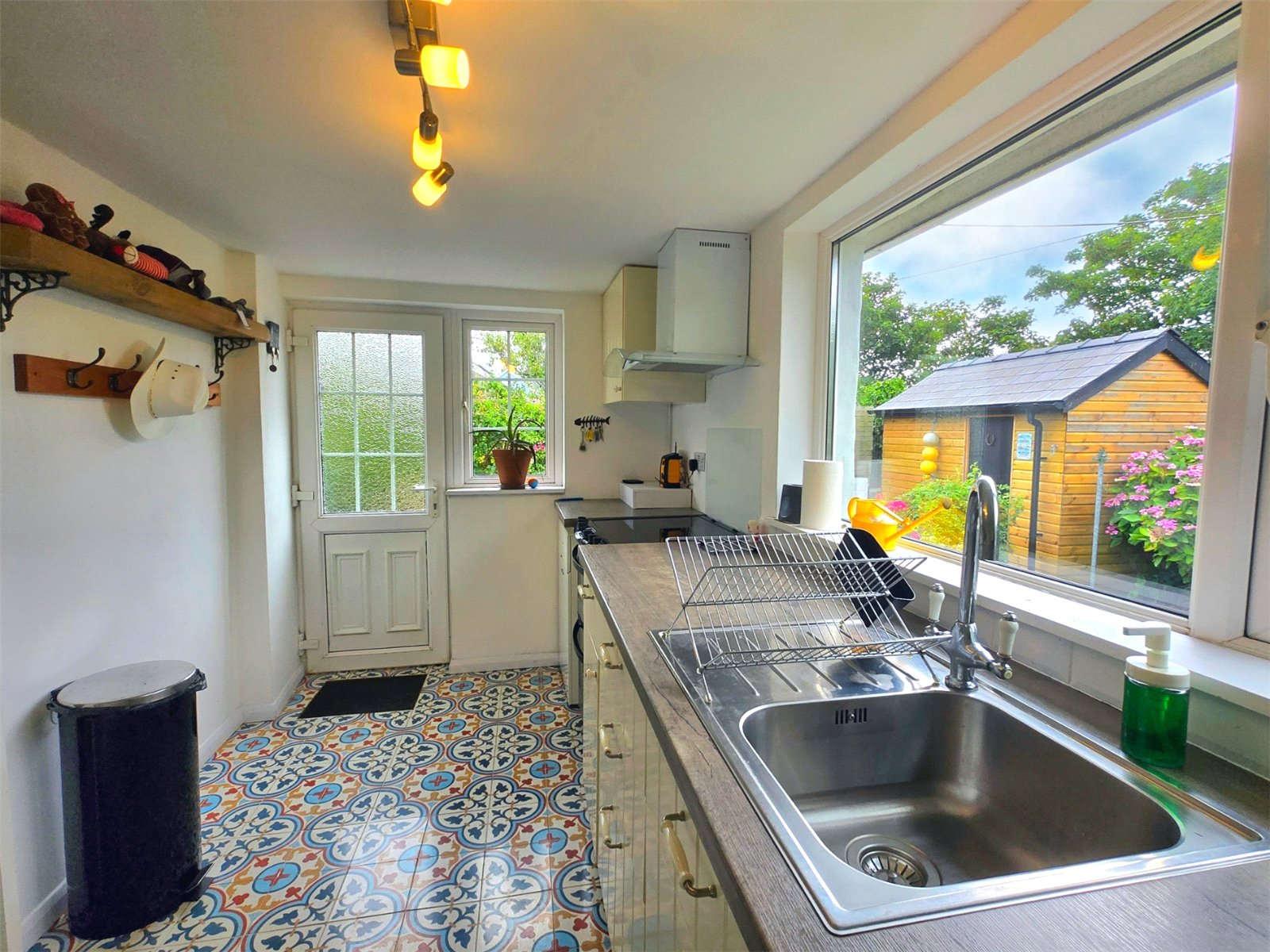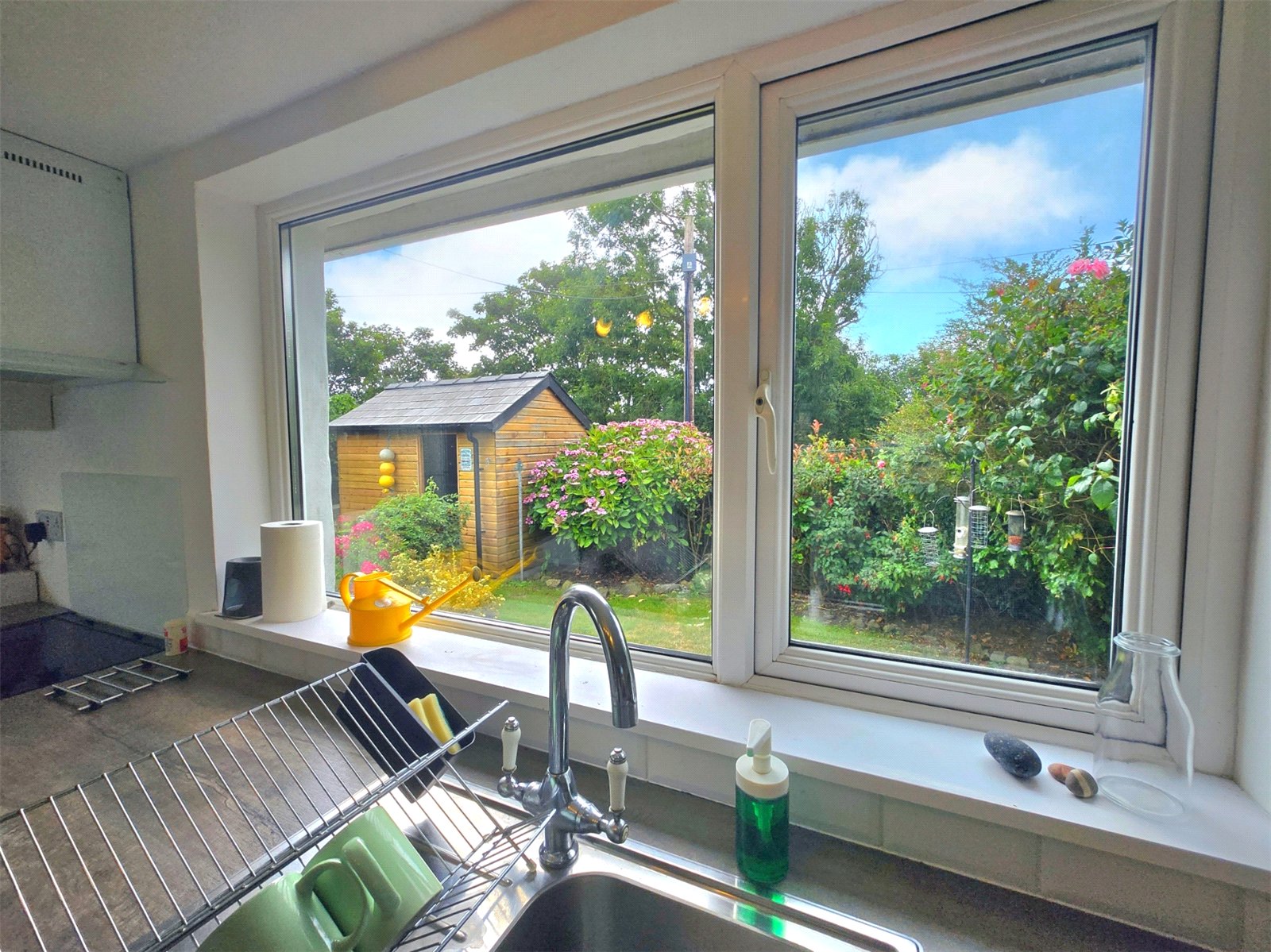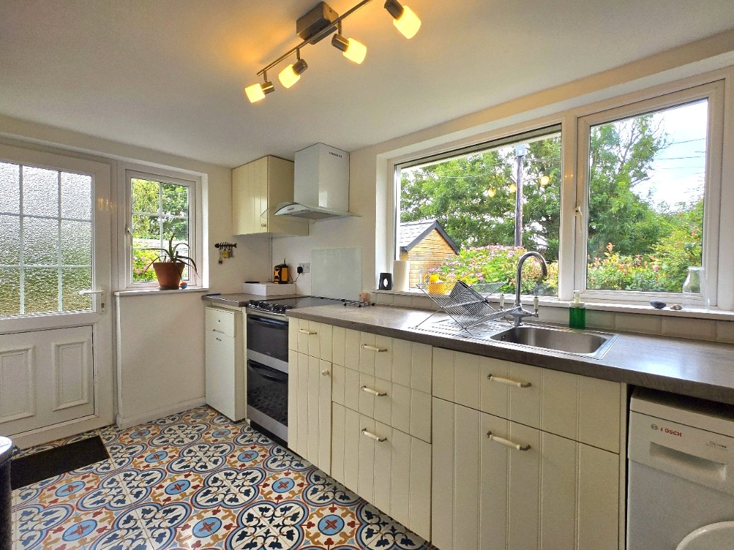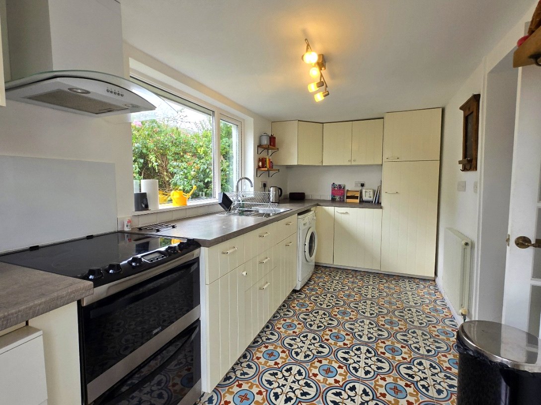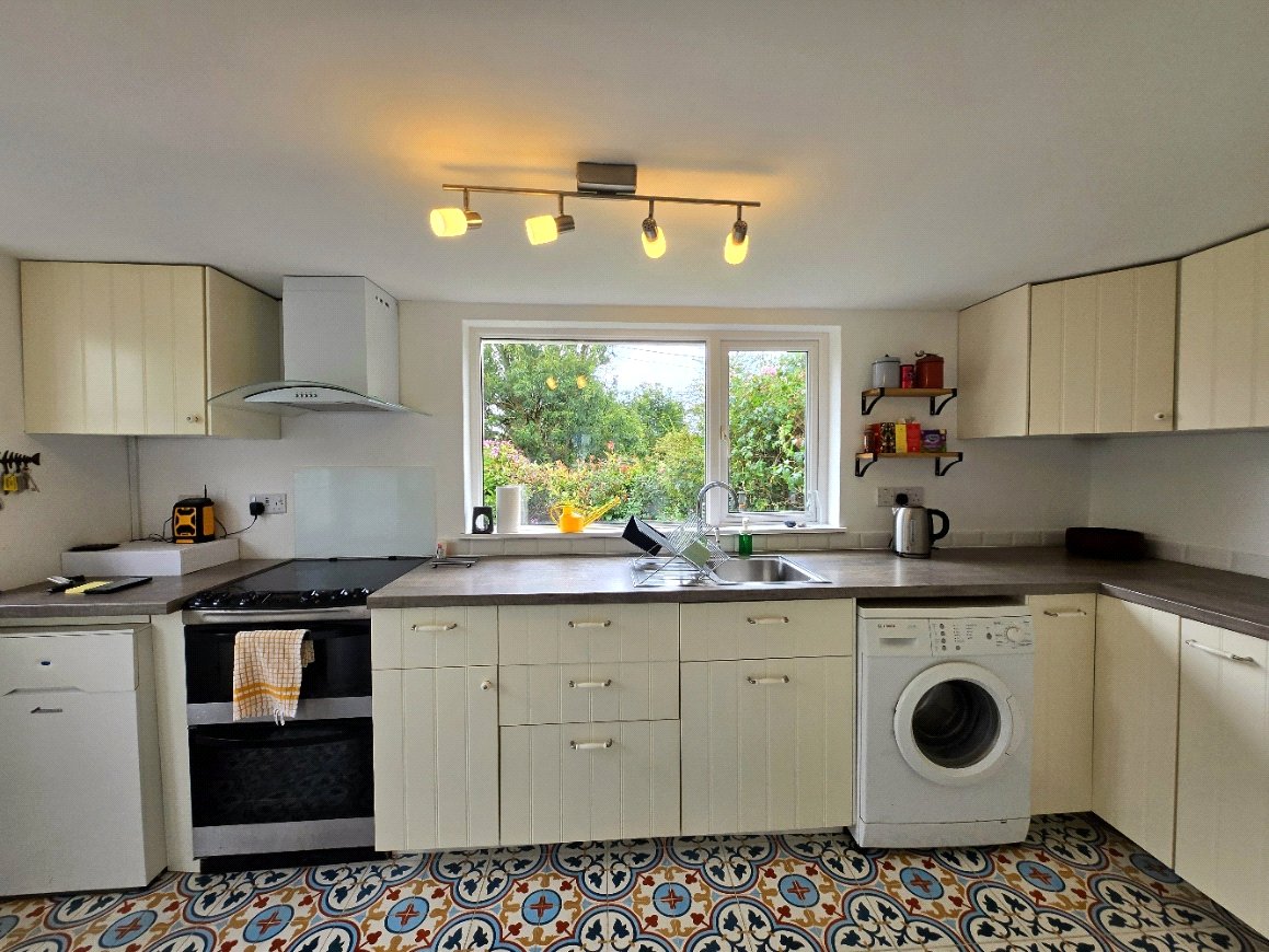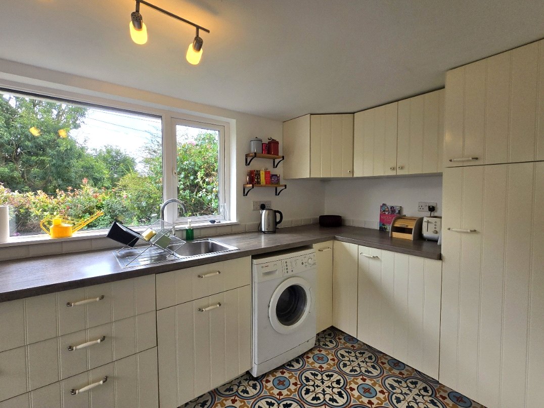 Natural light floods the room through a large window overlooking a lush garden, bringing the outdoors in. The garden view is a lovely backdrop to the kitchen sink area, where the washing machine is neatly integrated below the counter. A four-burner electric hob and oven are located next to the sink, with a contemporary extractor fan overhead.