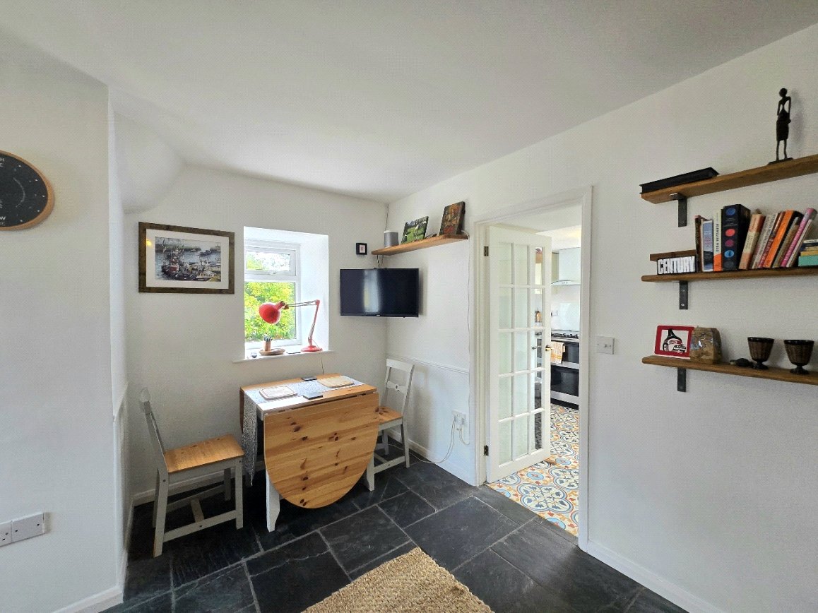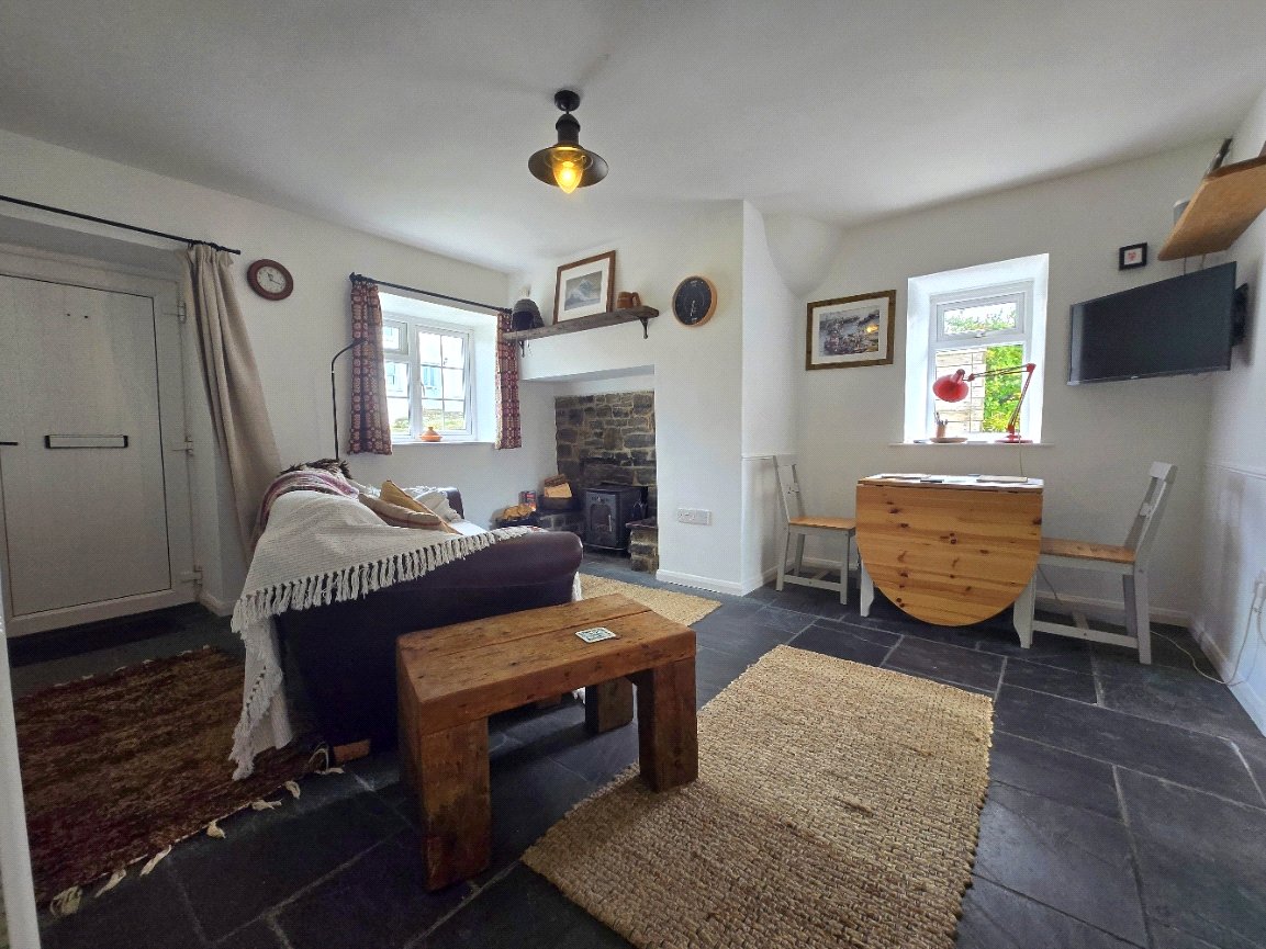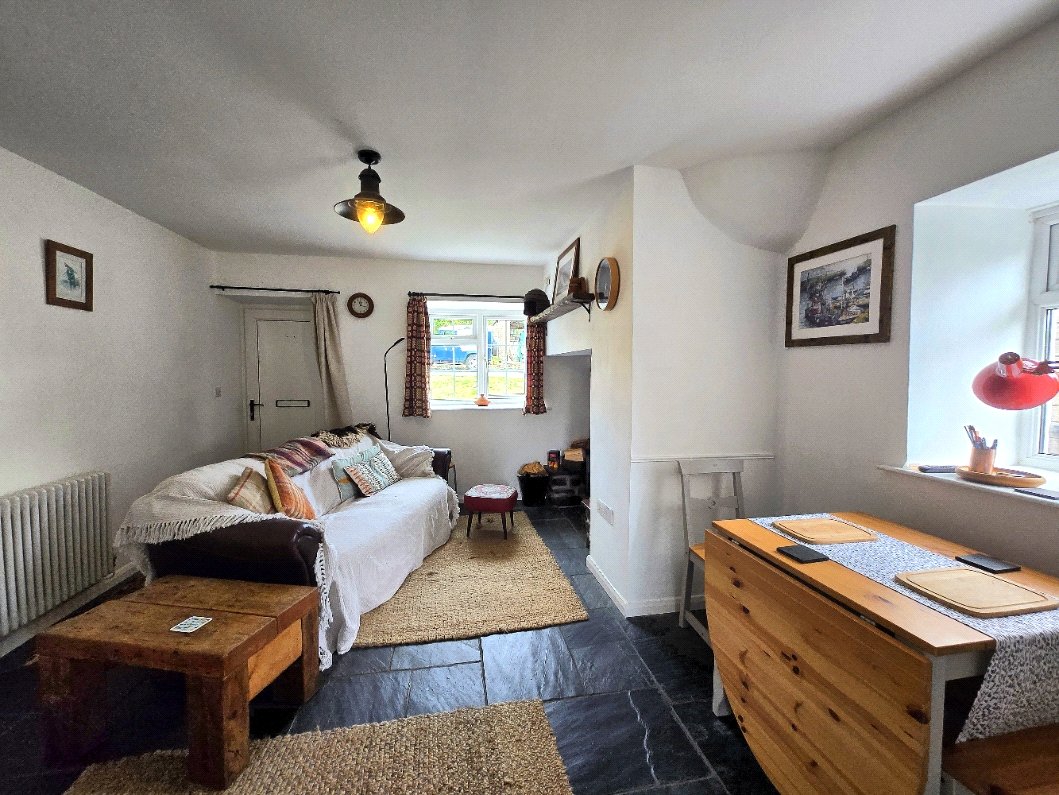 This inviting and character-filled living space offers a perfect blend of rustic charm and modern convenience. The room features a striking dark slate tiled floor that runs throughout, providing a durable and stylish foundation. The walls are a clean, crisp white, enhancing the sense of light and space.