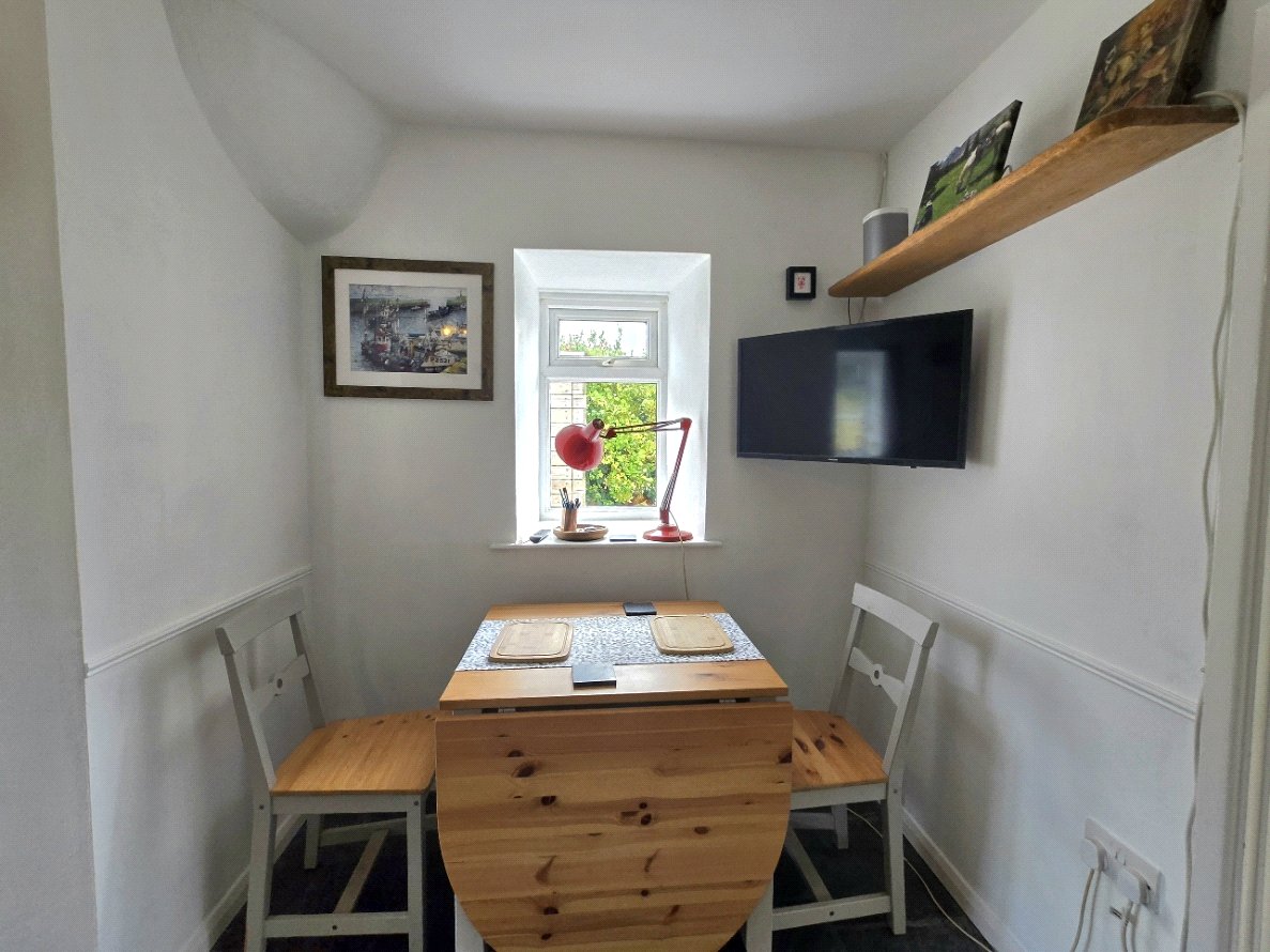 A large, deep-set window allows for plenty of natural light and provides a view of the surrounding area. The window framed by hand made curtains sill offers an ideal spot for plants or decorative items. A second, smaller window is located at the far end of the room, adding to the bright atmosphere.