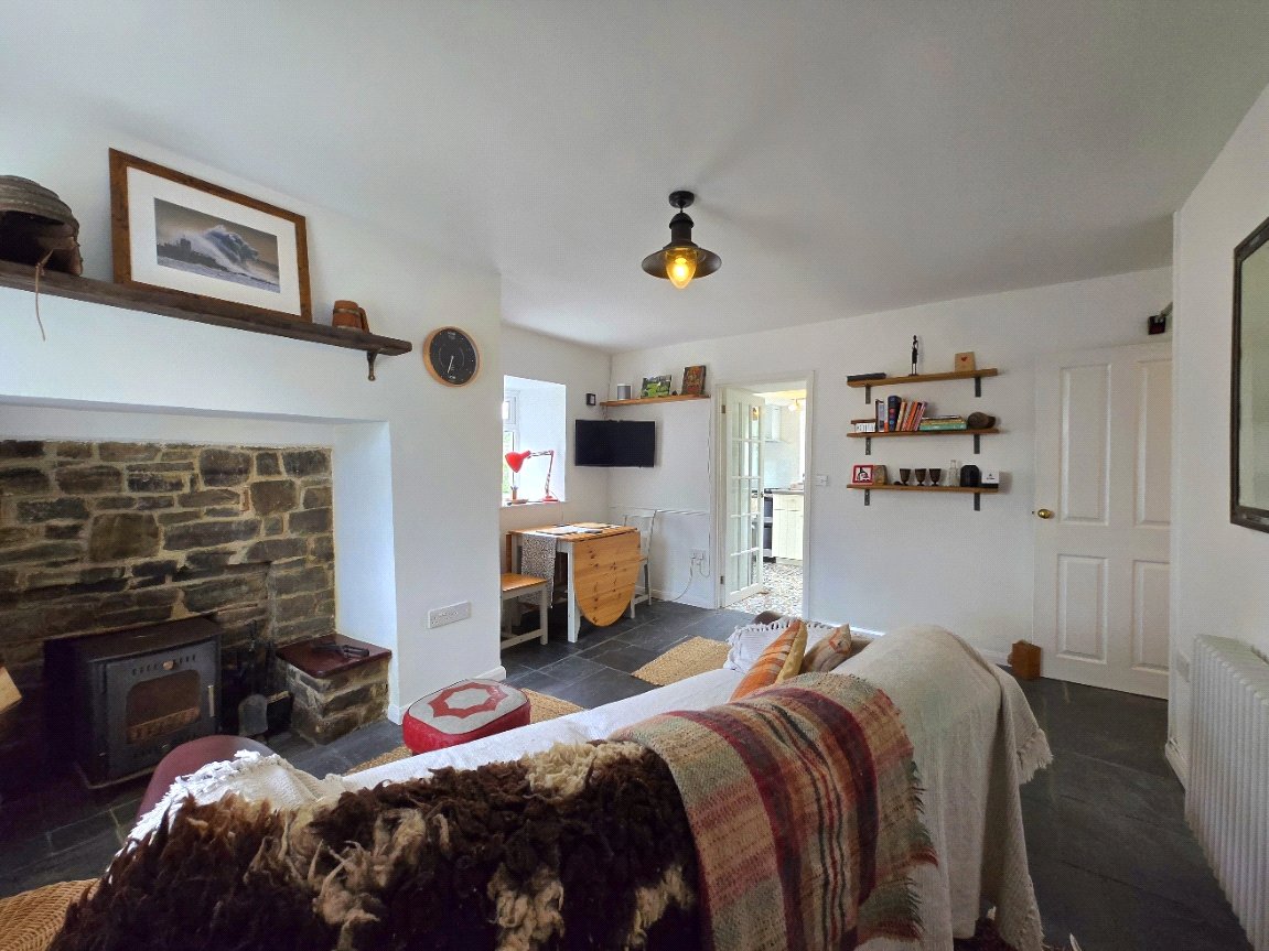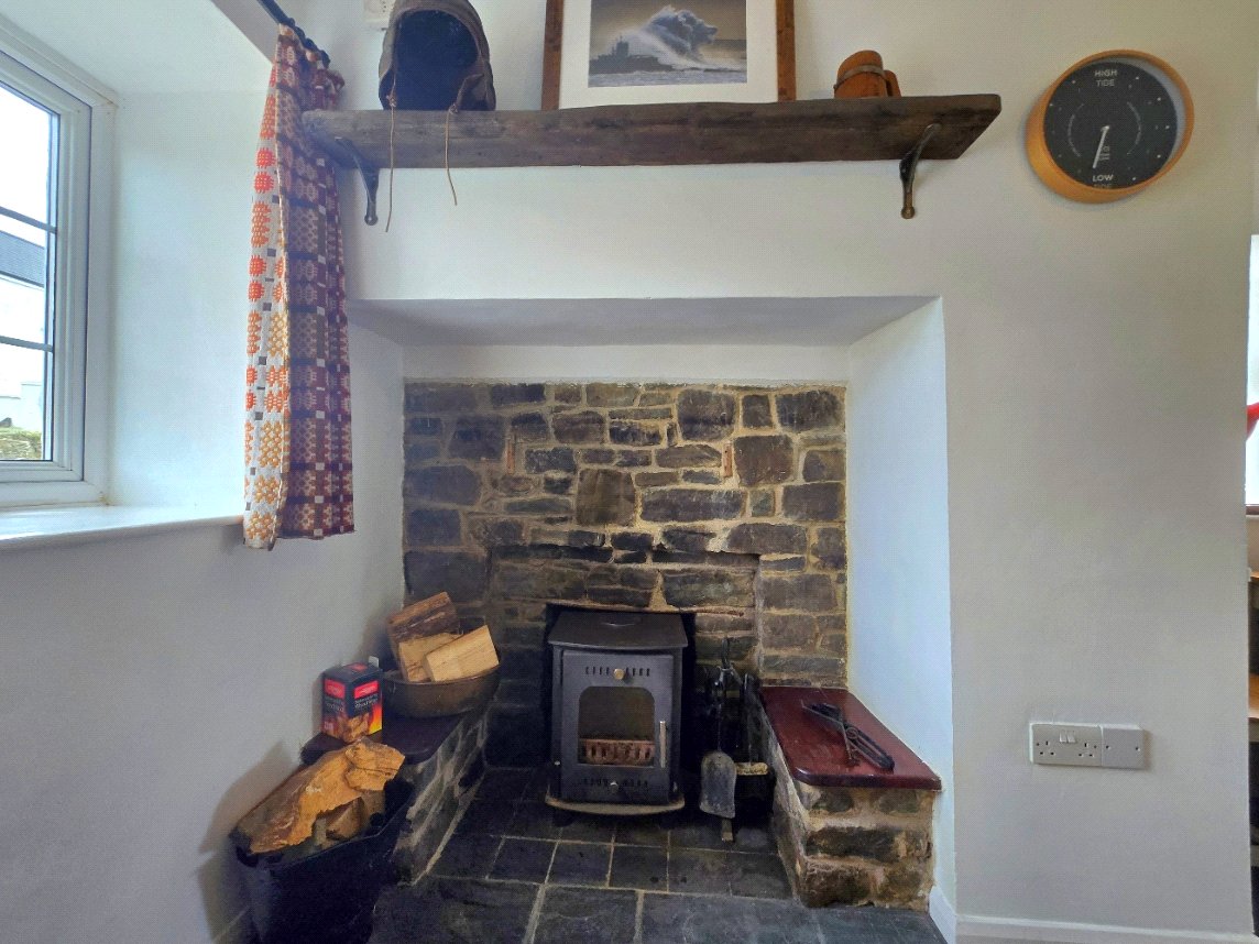 The heart of the room is a beautiful stone fireplace with a multi-fuel burner, creating a cozy focal point for chilly evenings. Above the fireplace, a rustic wooden mantelpiece adds to the room's character. Natural light streams in through the deep-set window.