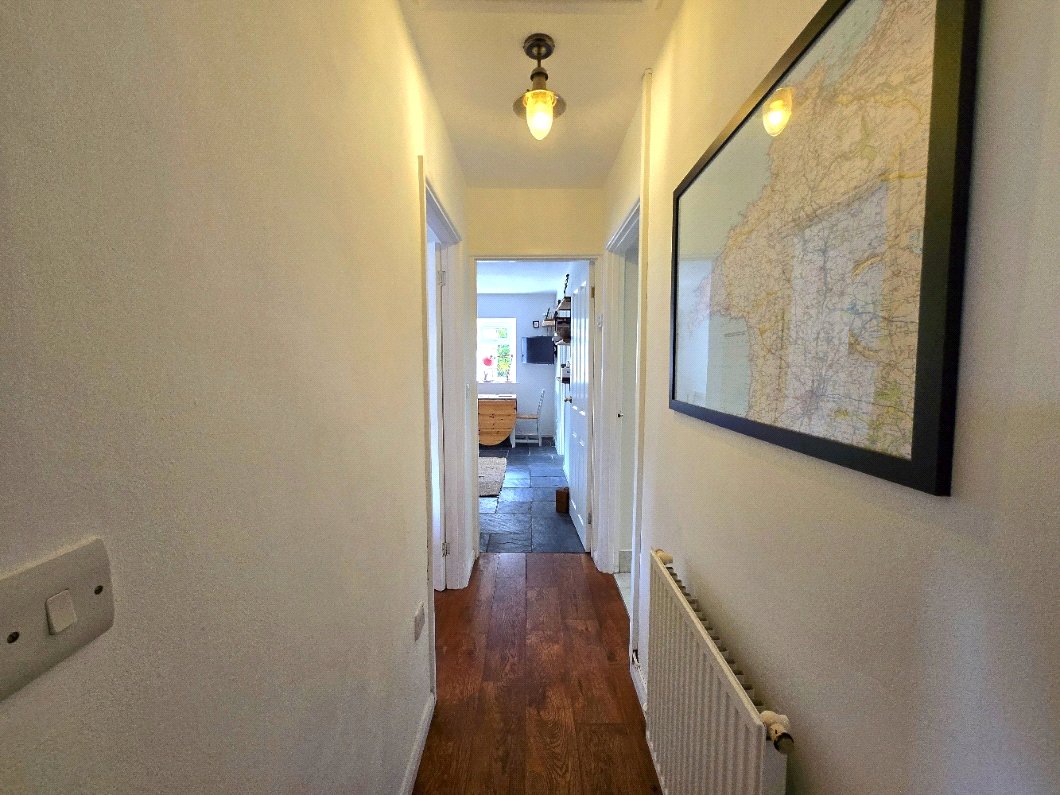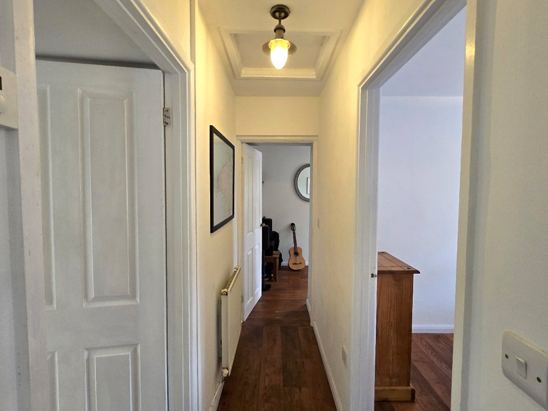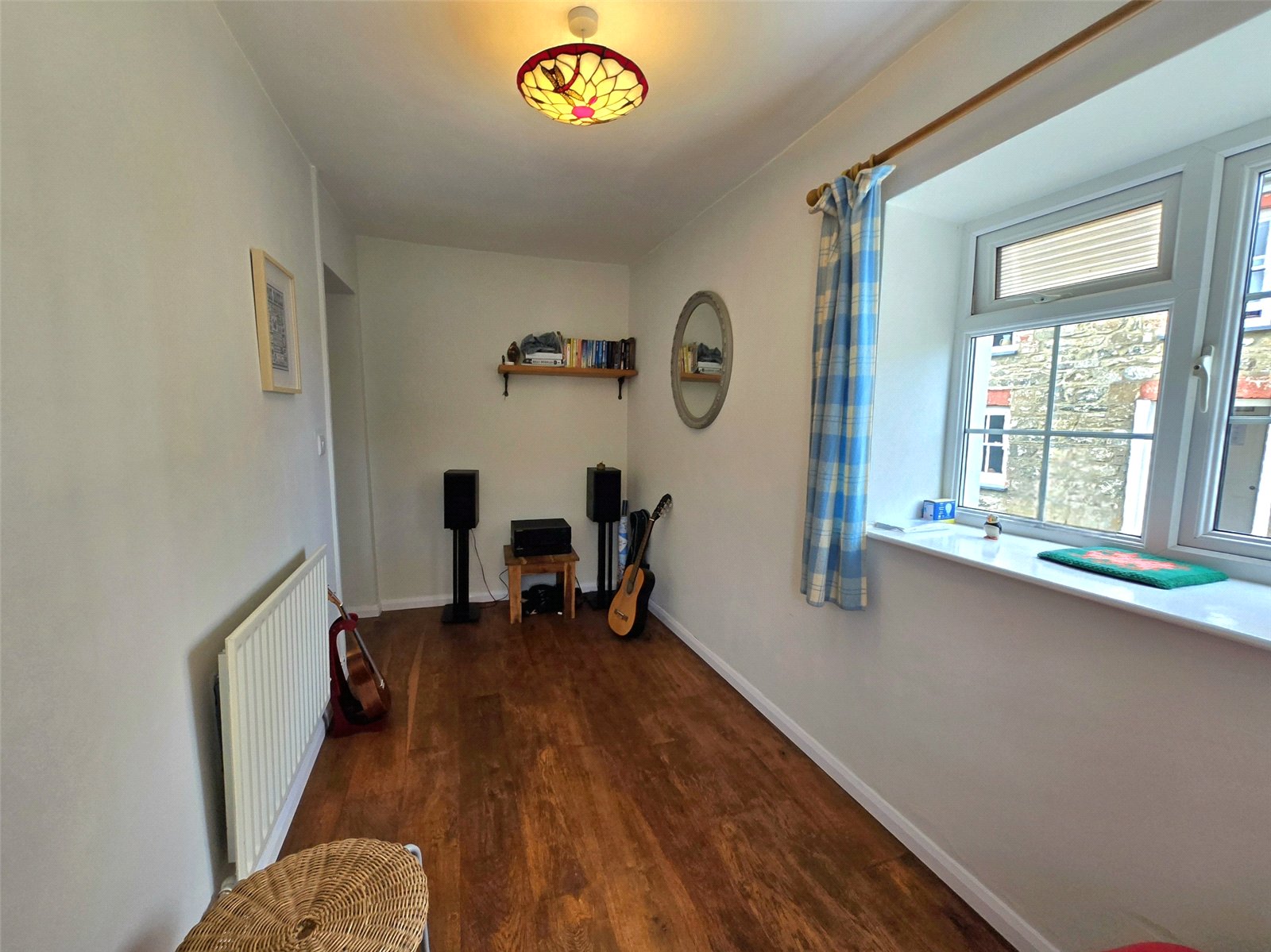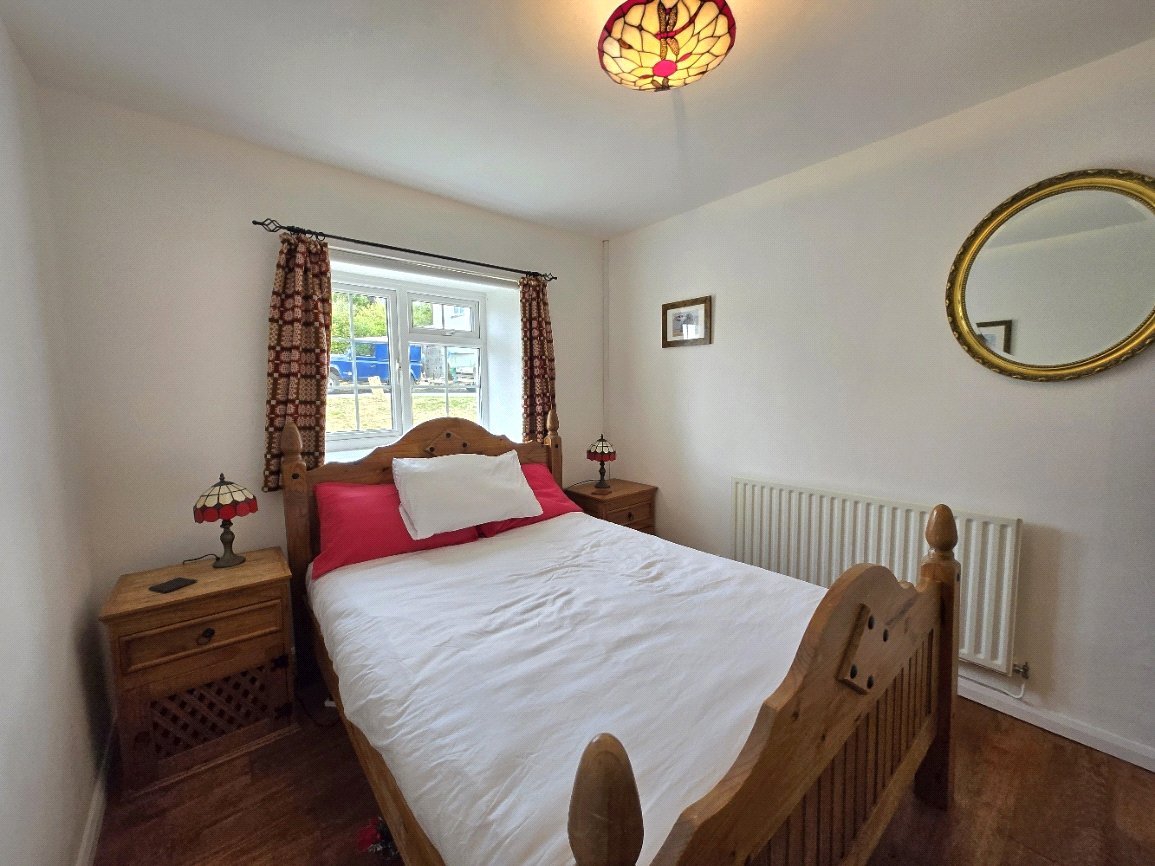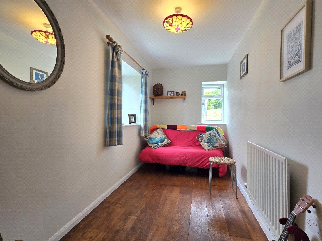 This charming second bedroom is a versatile and light-filled space. The room features warm solid oak flooring that adds a cozy feel, and the walls are painted a clean, neutral white.