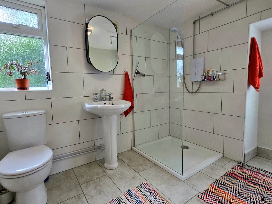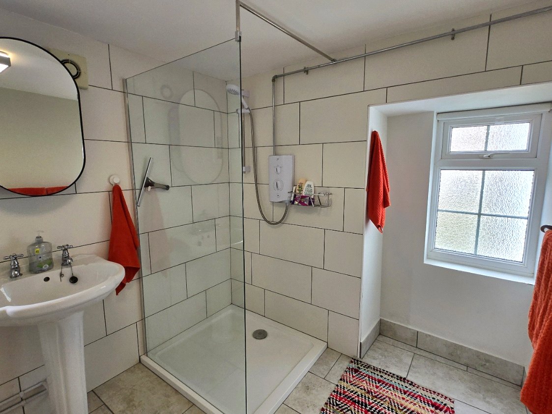 This well-appointed shower room is both stylish and highly practical. The room features a walk-in shower with a glass screen and a modern electric shower unit, all set on a clean, low-profile tray. The walls around the shower are tiled with large, rectangular white tiles with dark grout, creating a contemporary and easy-to-maintain finish. The remainder of the walls are painted a clean white.