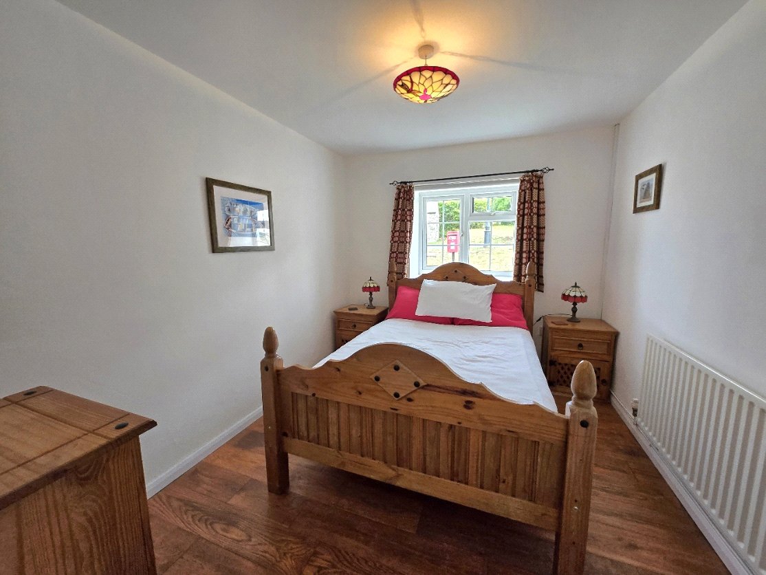 A large, deep-set window allows for plenty of natural light, dressed with hand made patterned red and white curtains that add a touch of color and warmth. The window overlooks the front of the property. The bed is neatly made with crisp white linen. Two bedside lamps with decorative shades sit on the tables, casting a cozy glow.