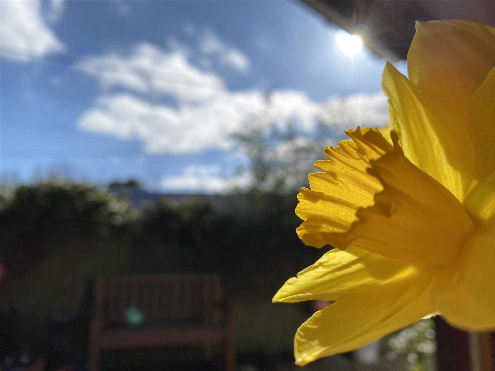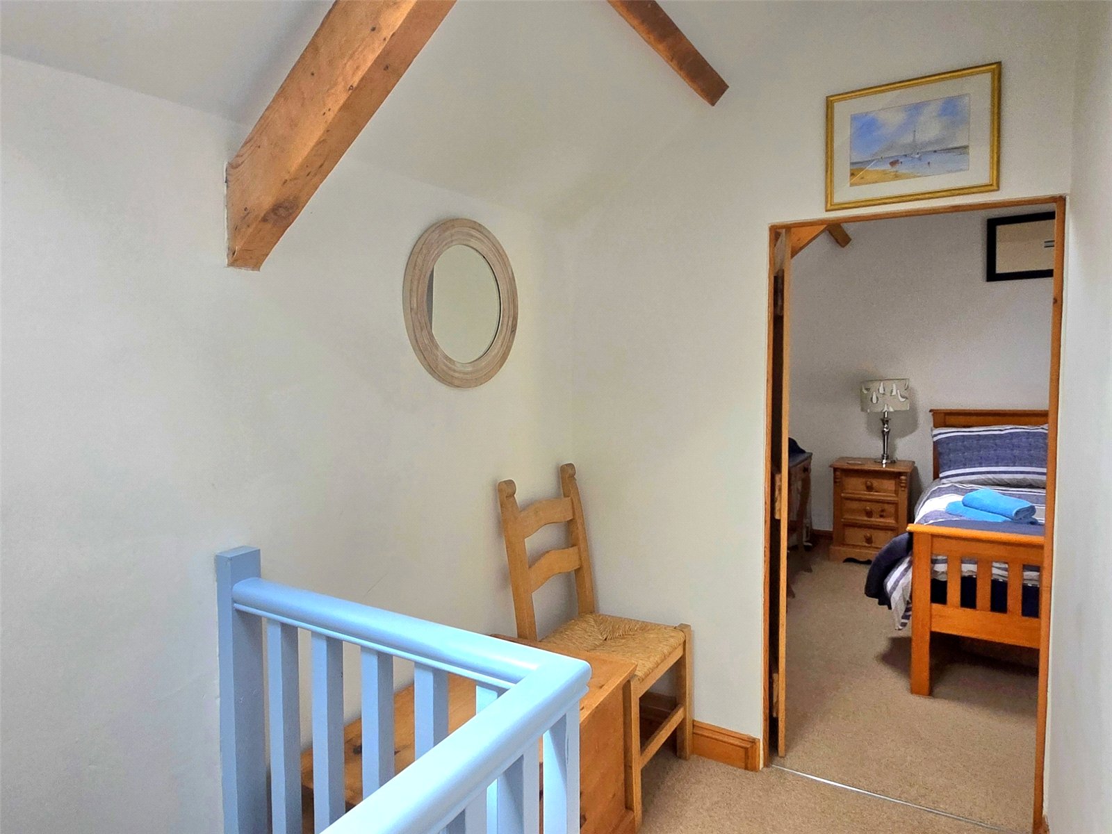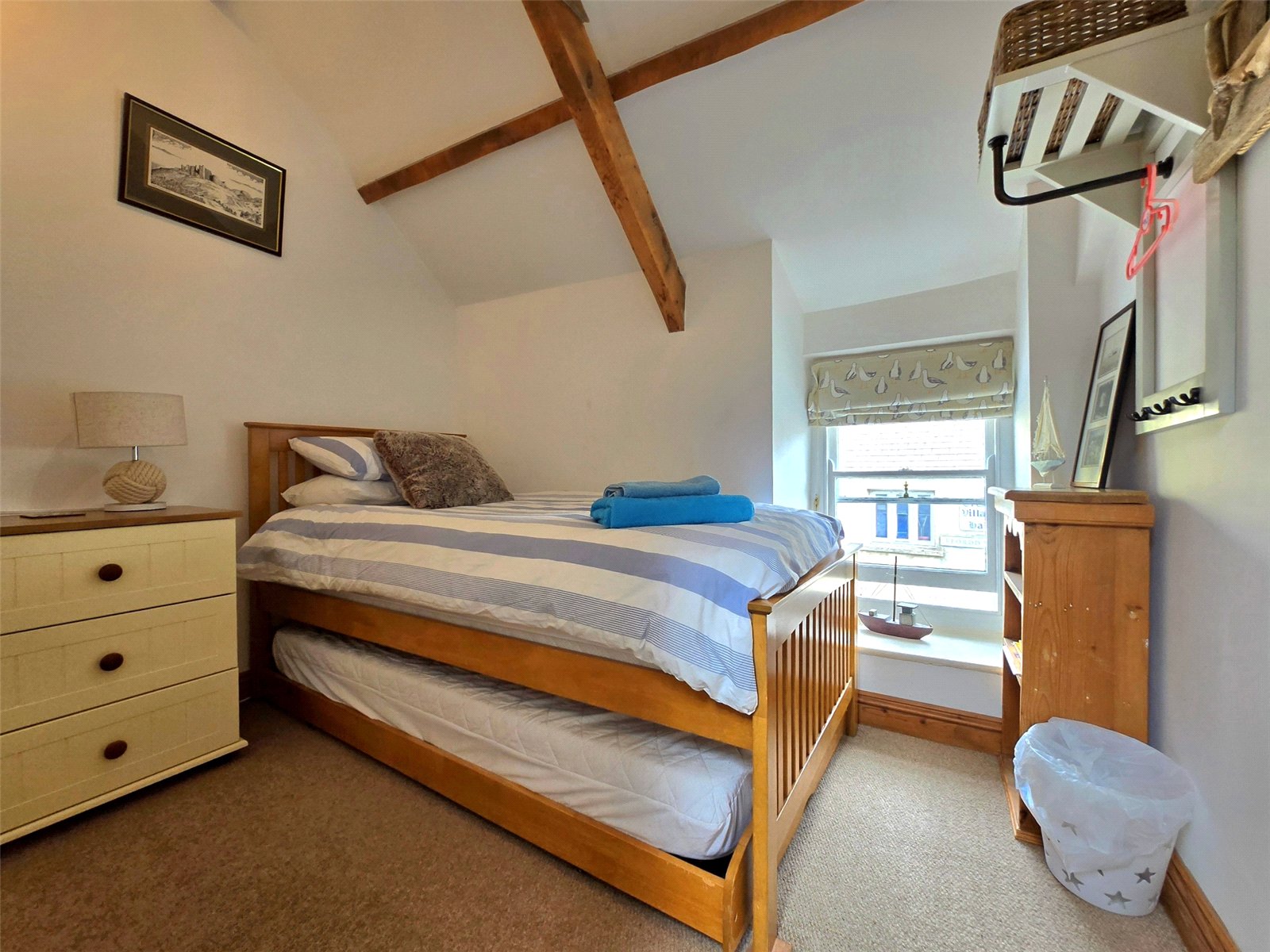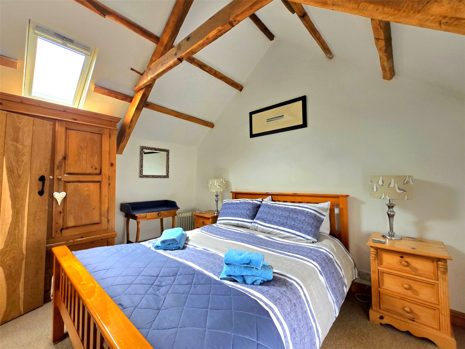Rustic solid wood door, leading into a bright and modern bedroom. Current owners utilise a pull-out trundle bed to allow sleeping for two. Exposed wooden A-framing to the ceiling, with sash window to the front. Carpeted throughout and spotlighted above.