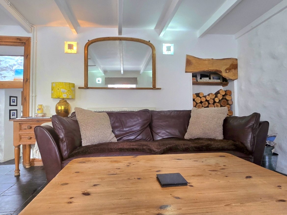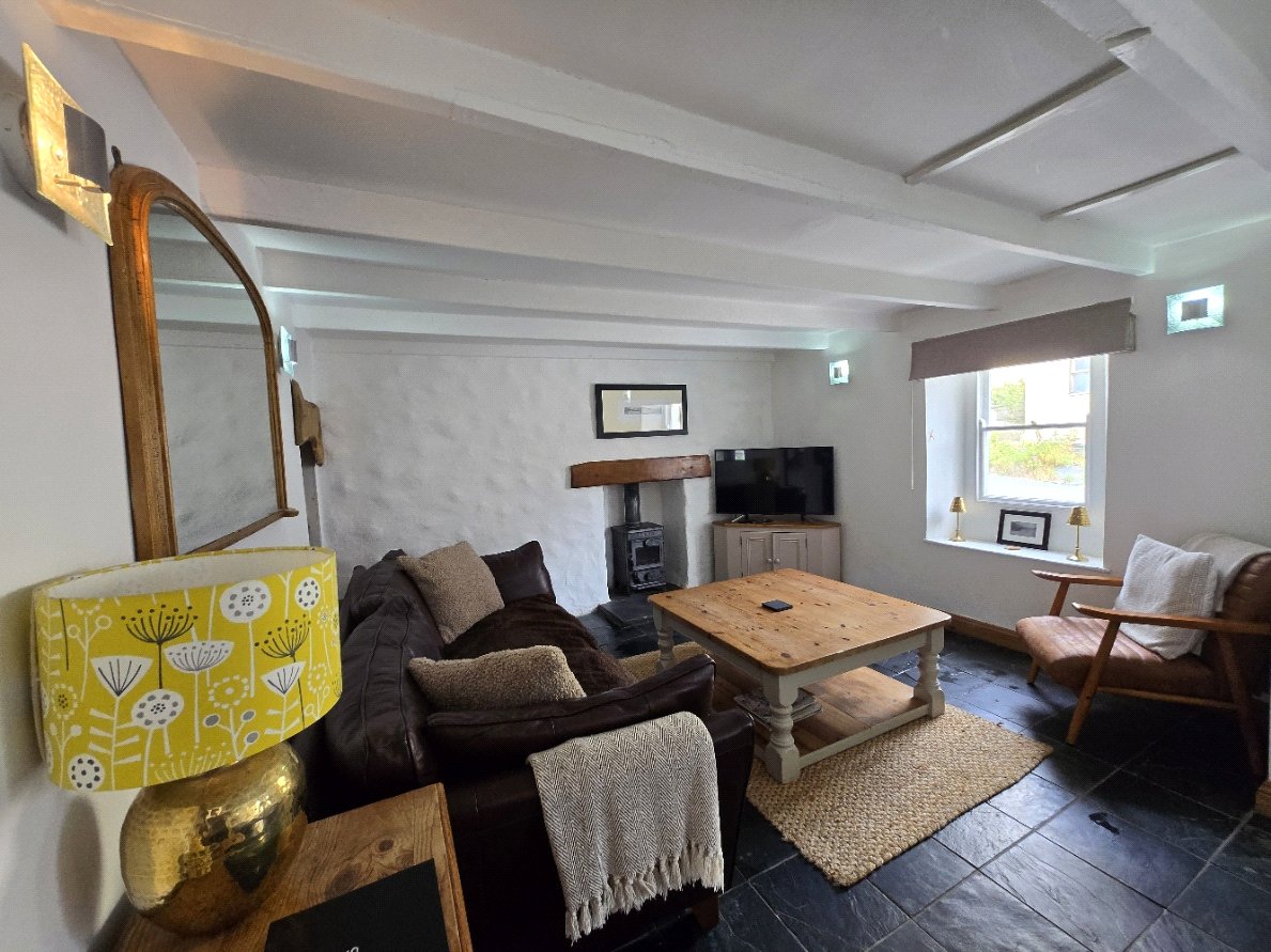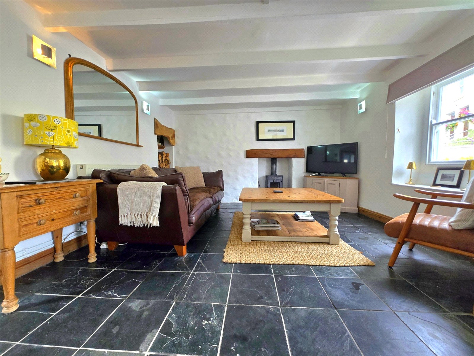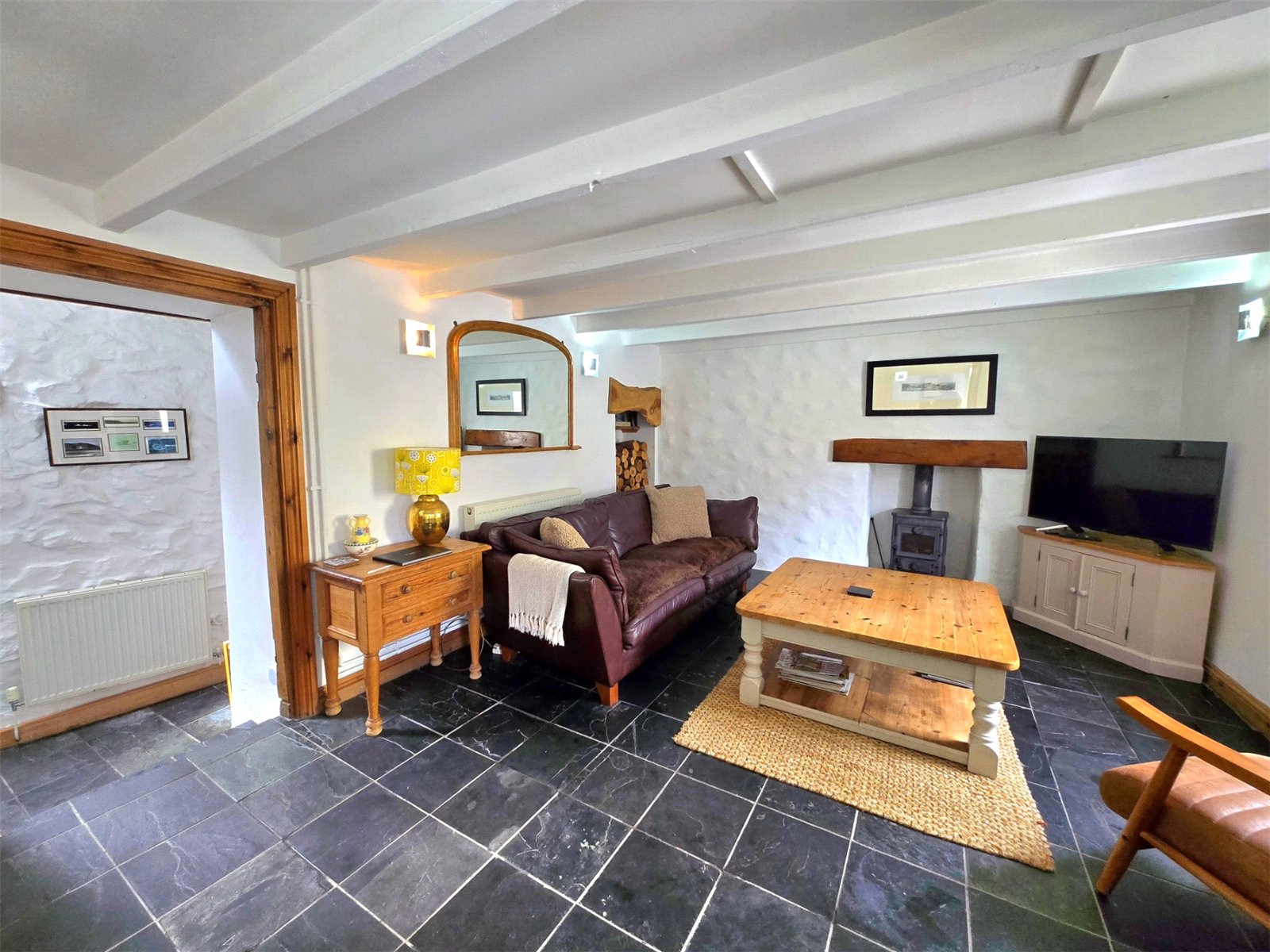 A spacious lounge with a cosy feel. Briefly comprising slate flooring throughout, fire place with slate hearth and oak mantel, wood burner within, as well as recessed wood store, exposed wooden beams to ceiling, sash windows overlooking the front elevation, feature wall with quality render finish over original stone.