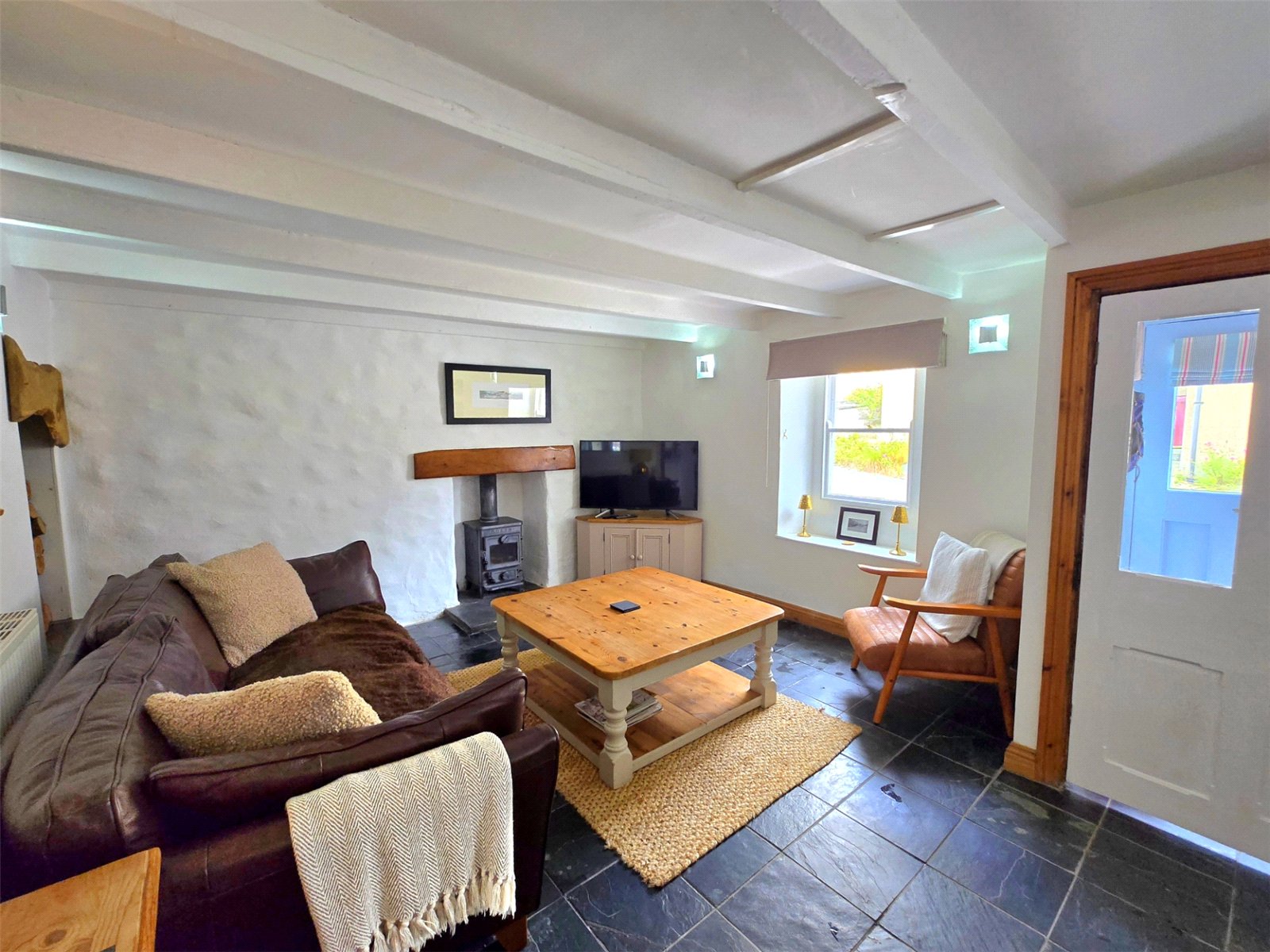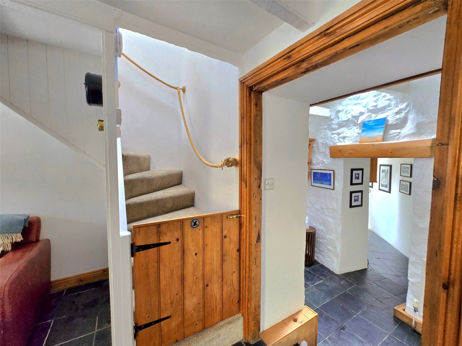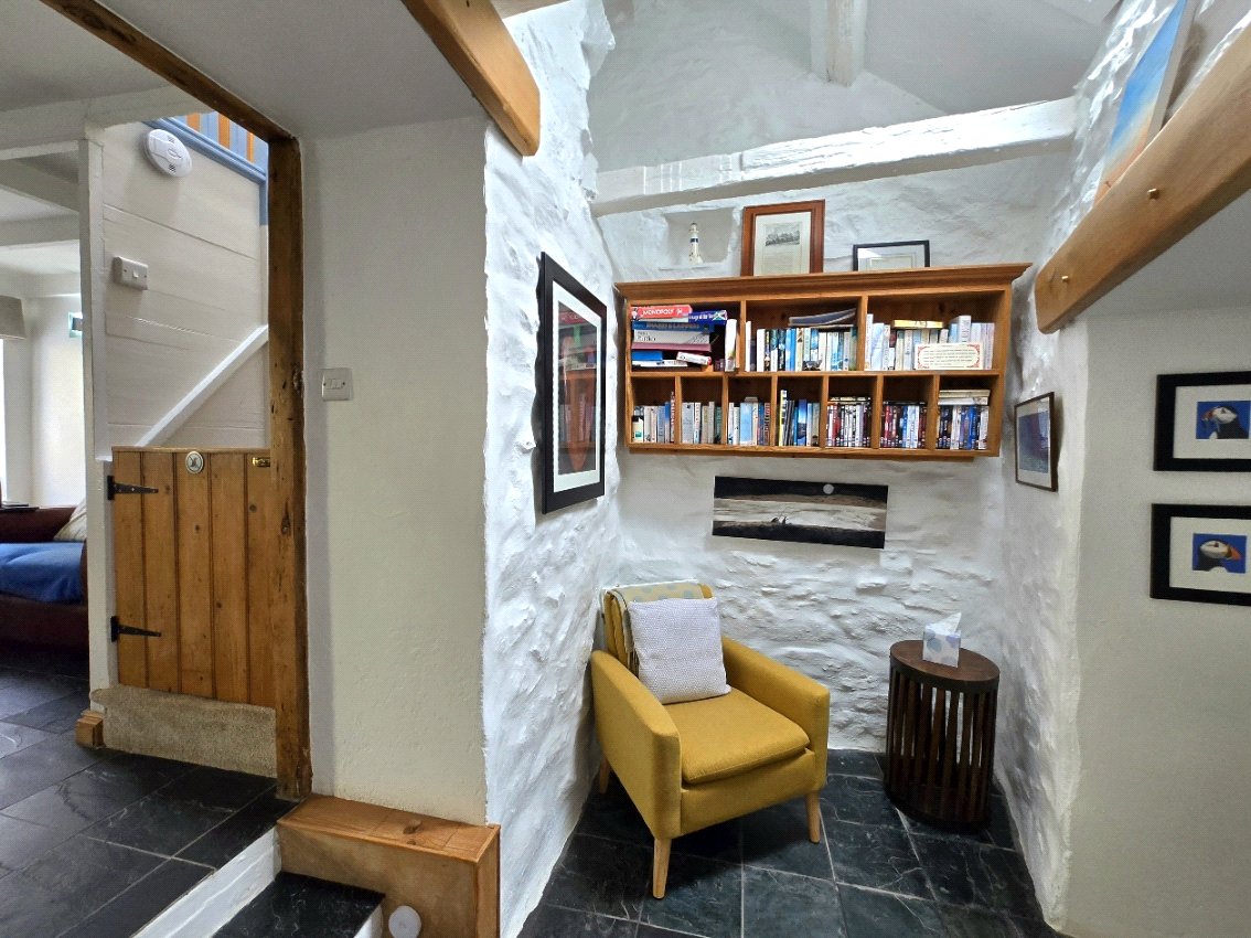 Library cove, exposed oak beams obove, natural slate flooring, double-glazed velux skylight, double-glazed window to rear elevation, recessed storage cupboard with eave storage above, quality render finish over original stone walls. Furnished with eye-level bookshelf.
