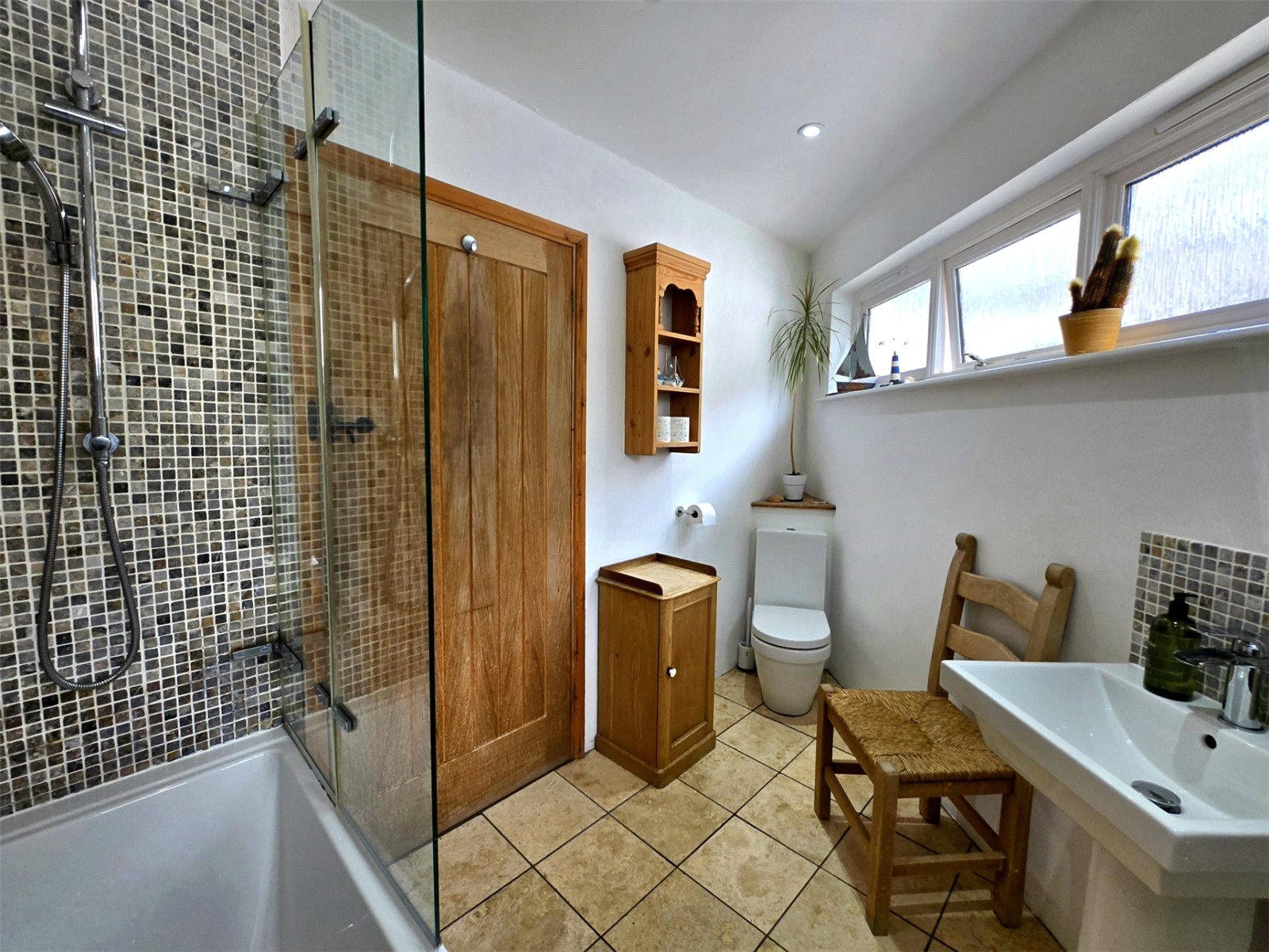 Modern bathroom, with bath & overhead shower, tiled surround, wash basin with waterfall mixer tap, close-coupled w/c, tiled flooring, spotlighting and heated towel rail.