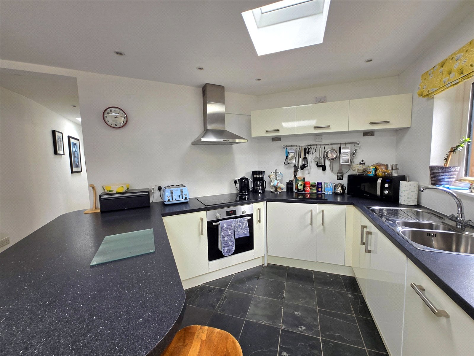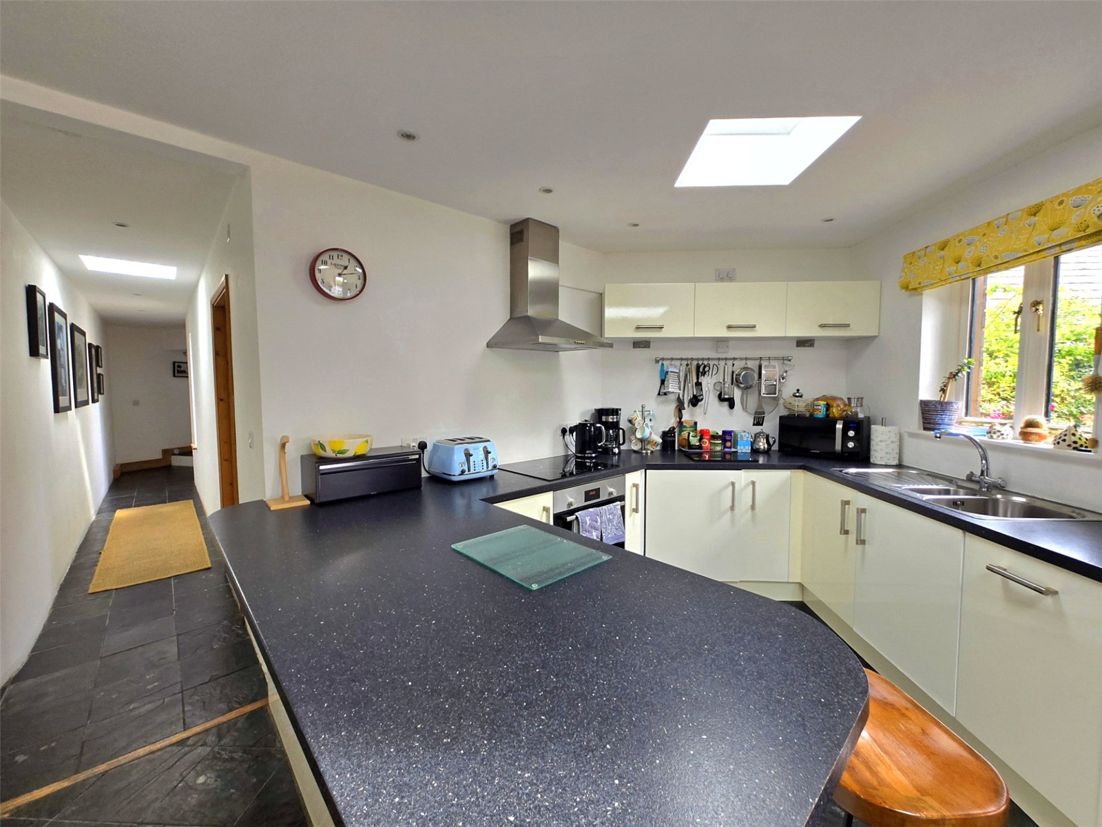 Spacious kitchen/diner, with the kitchen area comprising a range of modern base & wall units, breakfast bar, integrated dishwasher, oven & ceramic hob unit with overhead stainless steel extractor hood. Stainless steel sink and drainer with mixer tap. Base unit space and plumbing for washing machine.