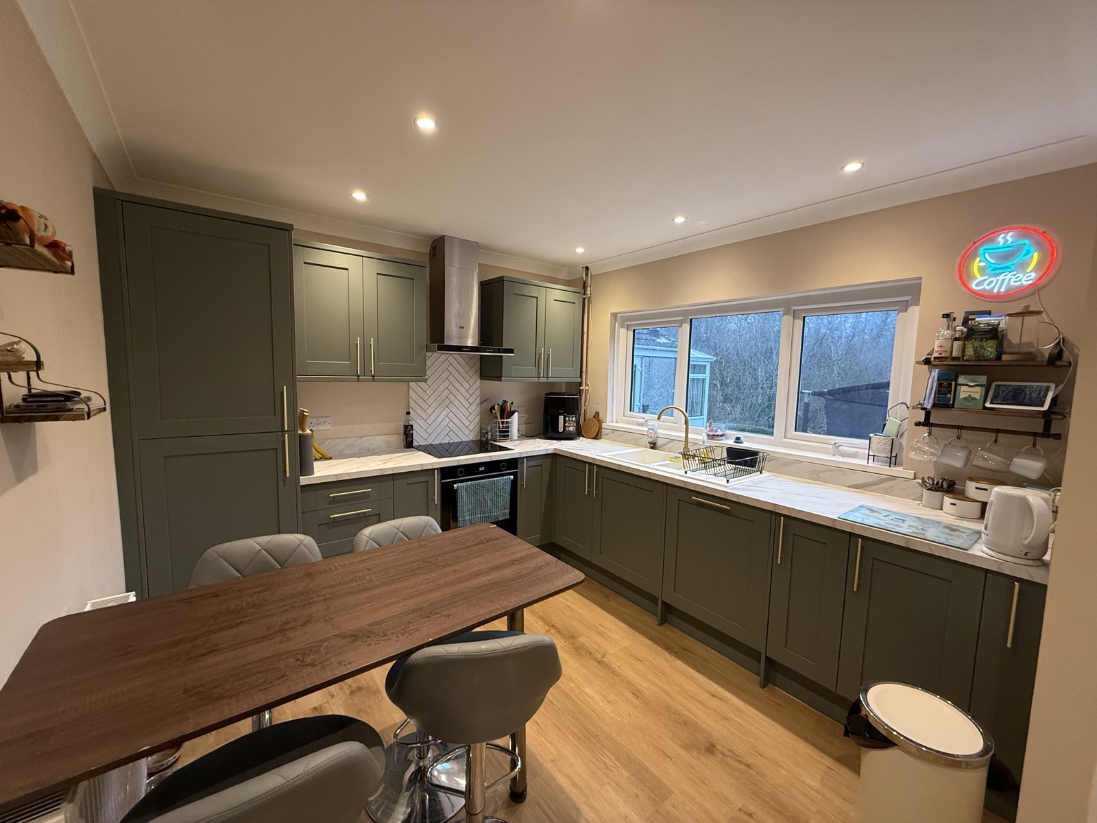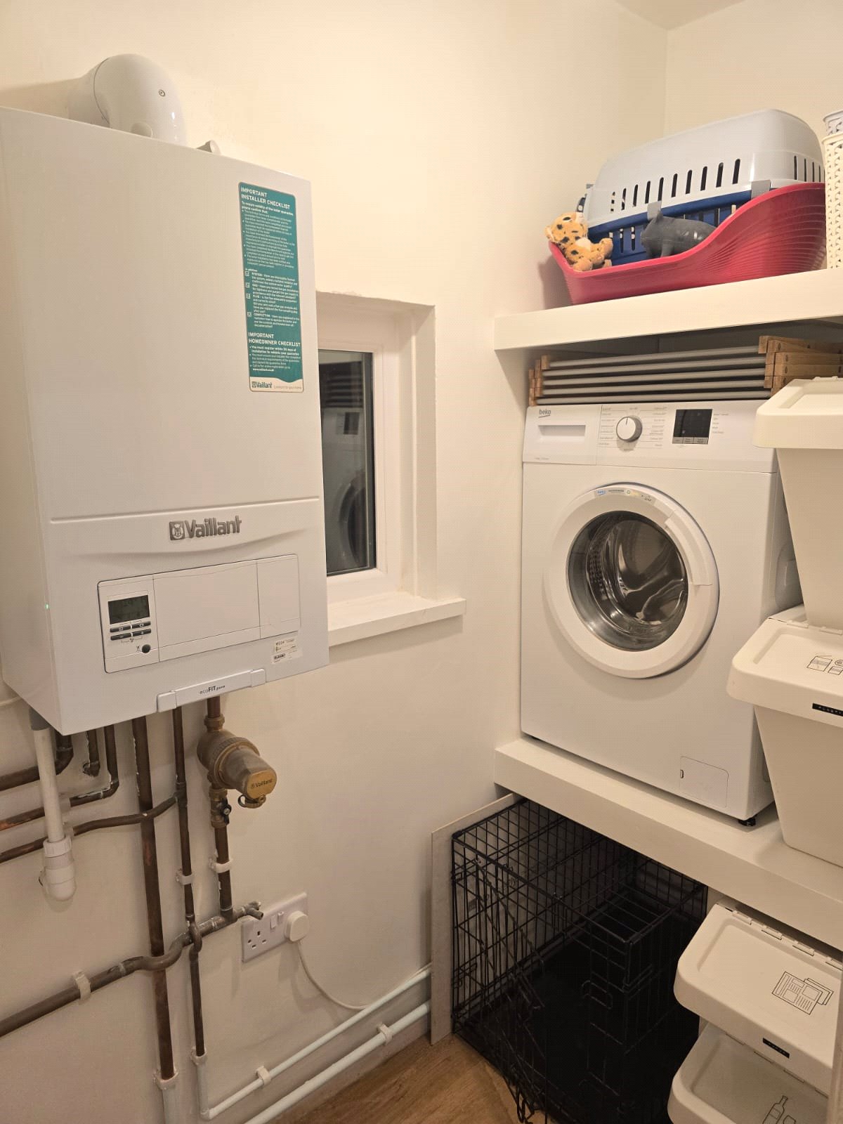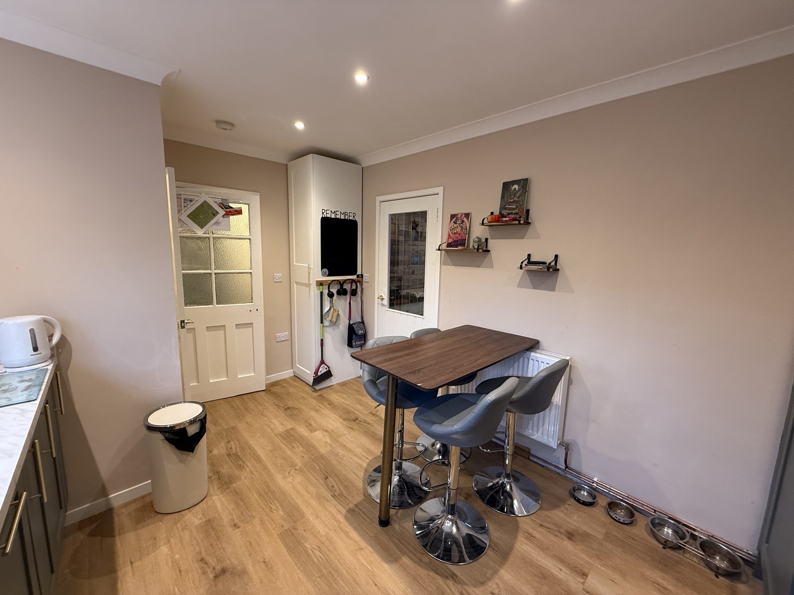 Flooring laid to laminate, kitchen units along the wall, double glazed window looking over the rear garden, radiator on wall under breakfast bar, also a storage cupboard for the washing machine and tumble dryer as well as the boiler.