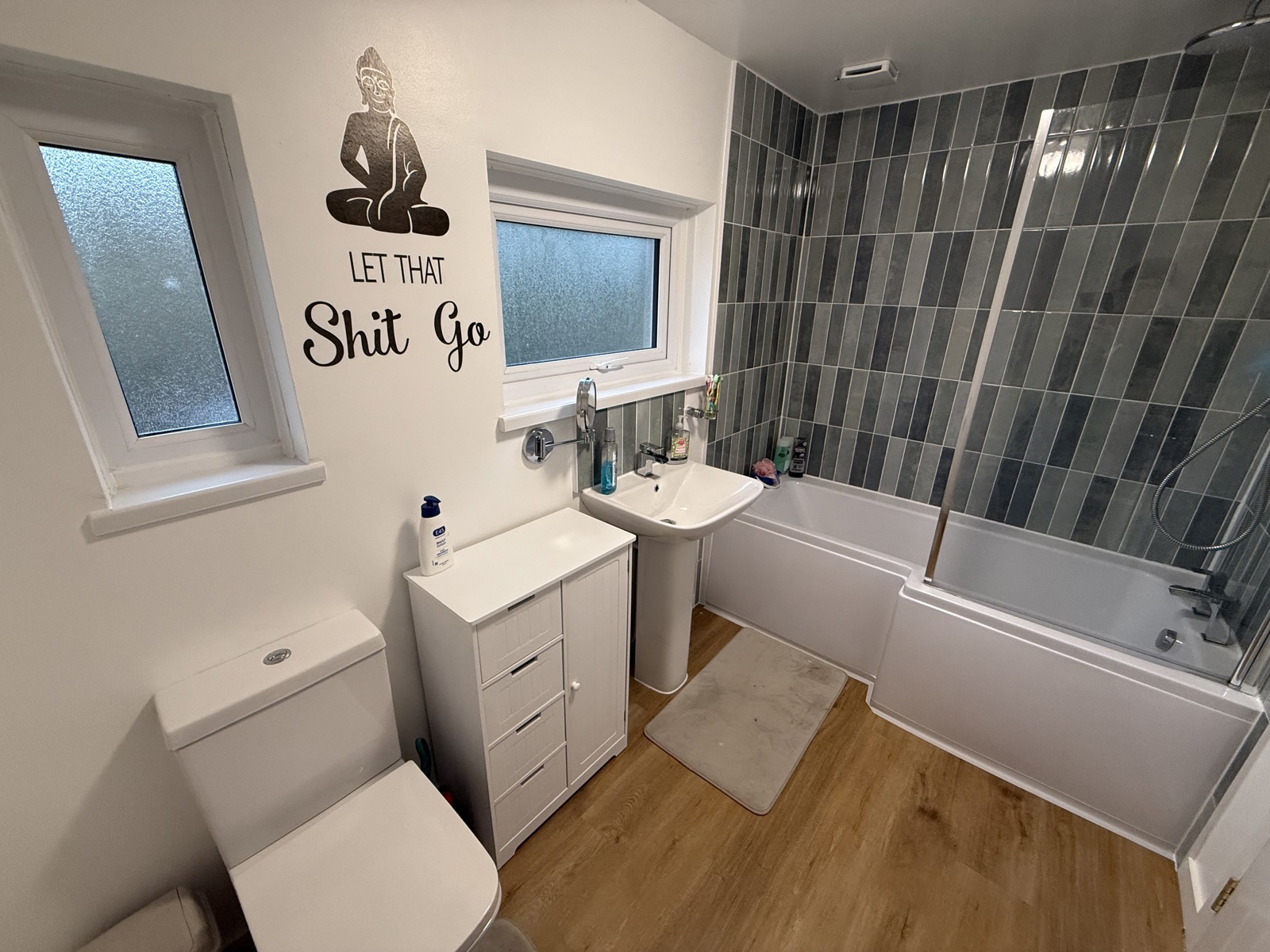 Laminate flooring, two double glazed obscure glass windows, toilet, wash hand basin, bath with shower above.