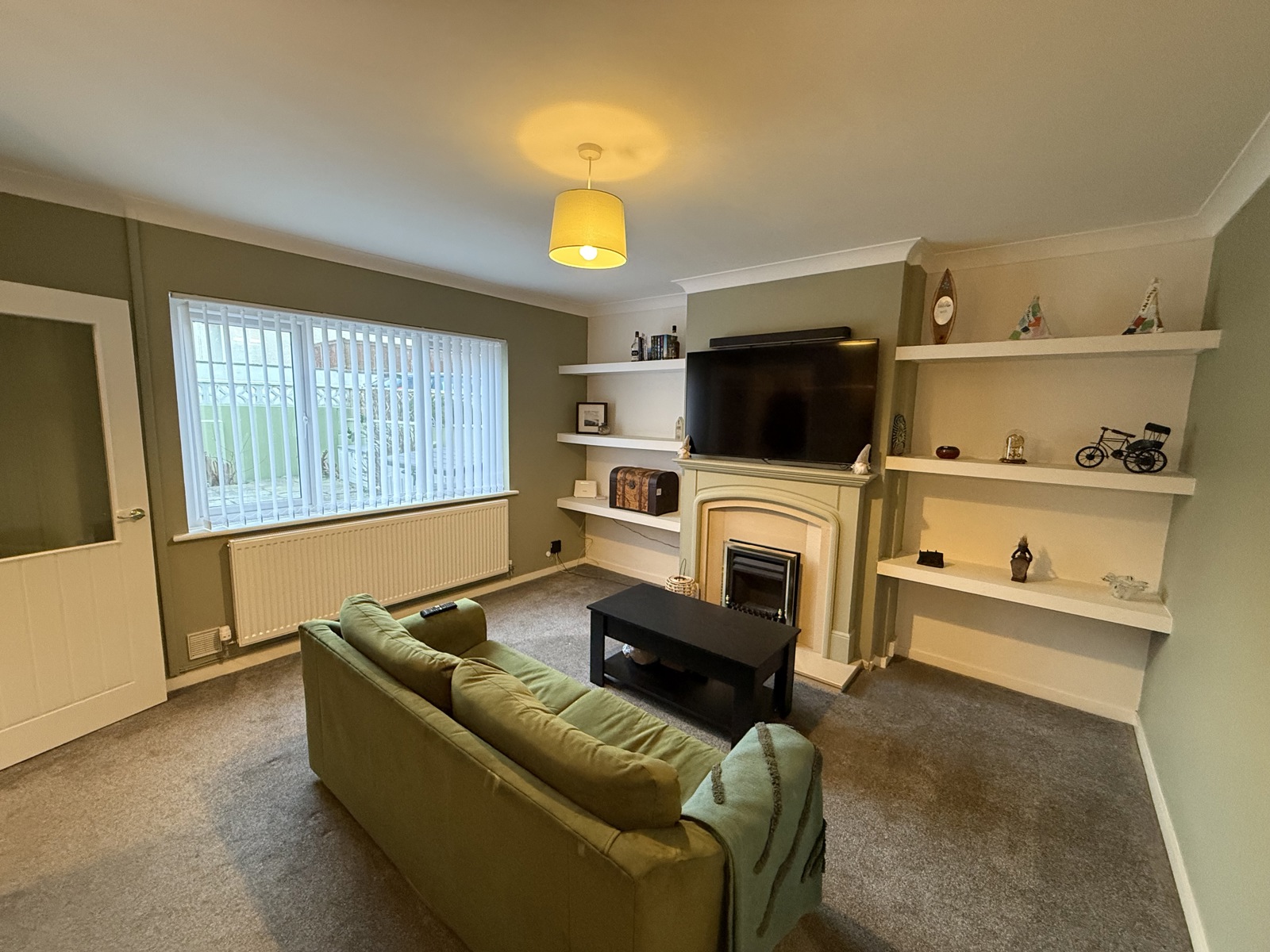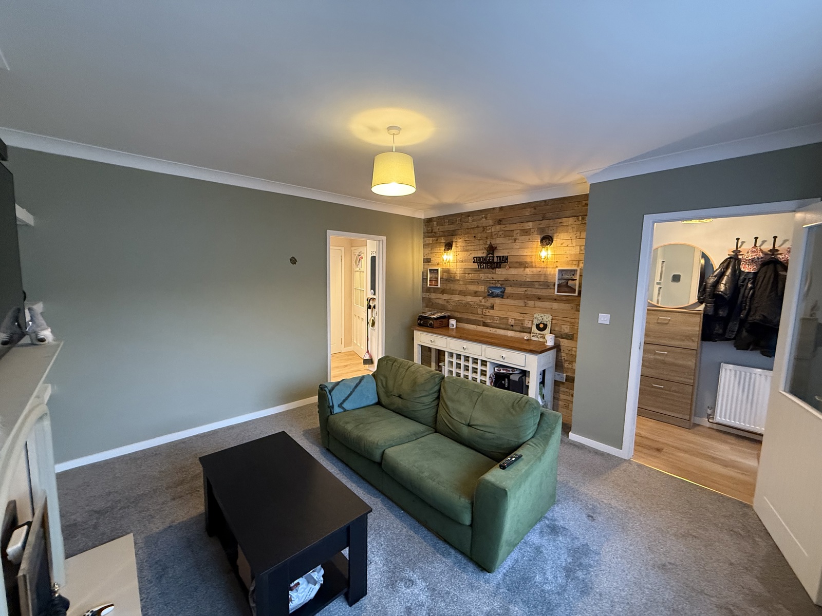 Flooring laid to carpet, double glazed window to the front, fireplace on the side wall and a radiator under the window. Door that leads to;