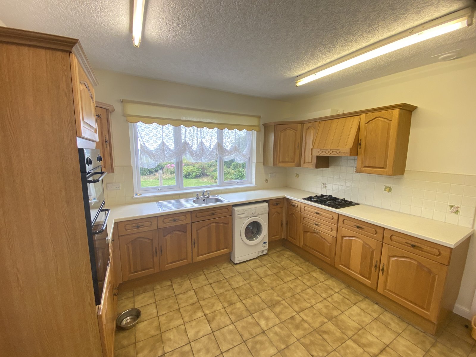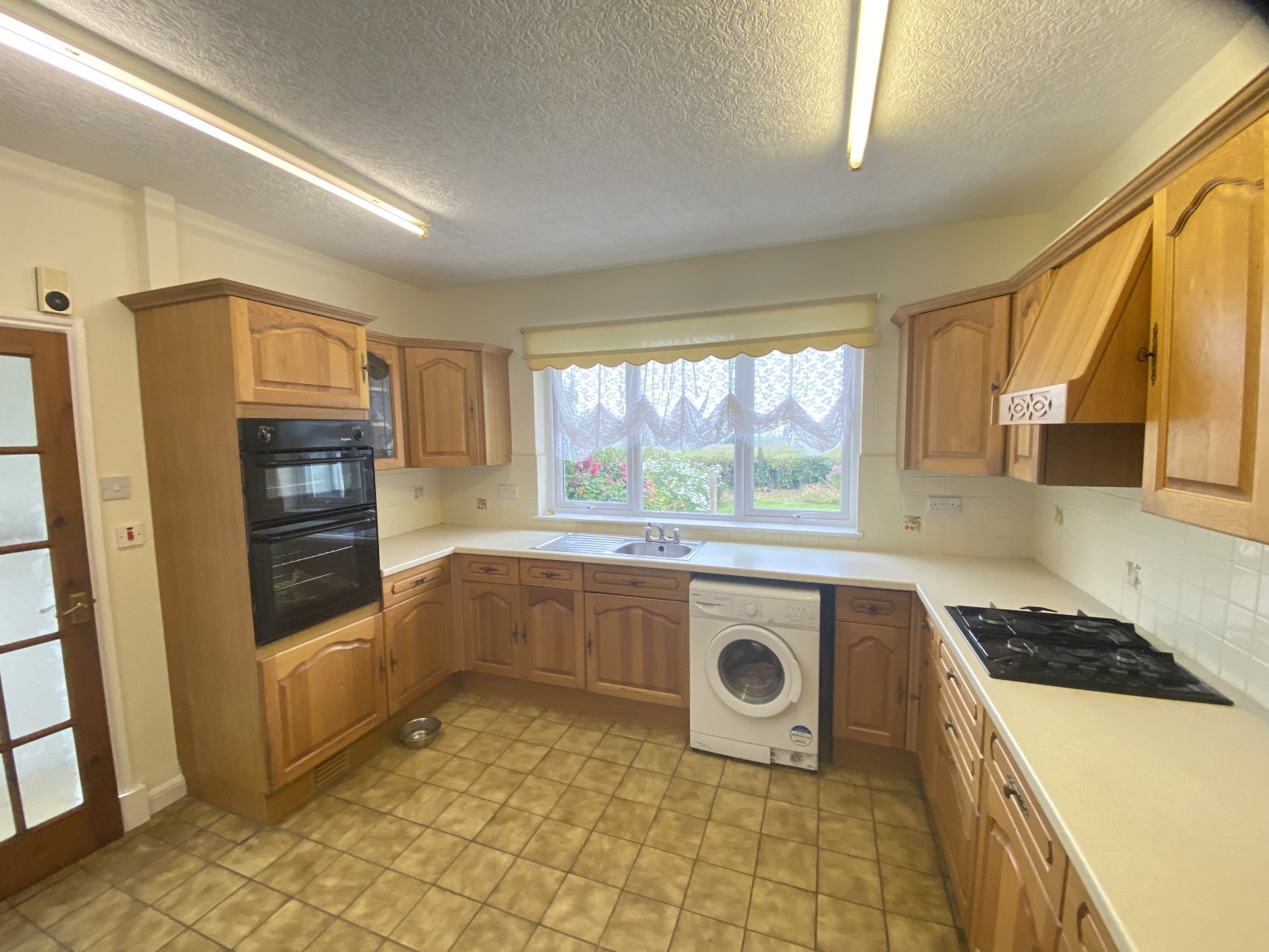 Spacious fitted kitchen, with ample wall & base units. Fitted gas hob & electric oven extractor hood, tiled floor, double glazed window facing garden.