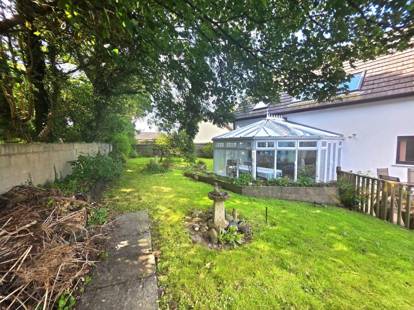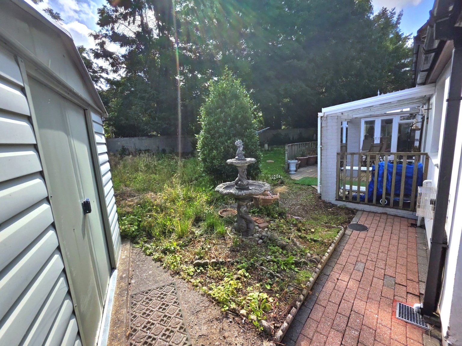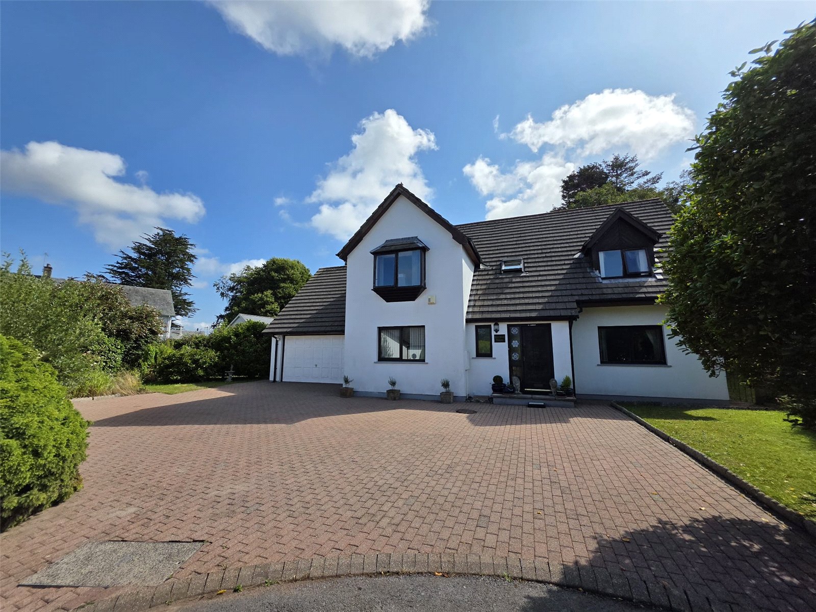 Outside, the property enjoys a broad brick-paved driveway with parking for at least six vehicles, leading to the integral double garage with an up-and-over door and internal access to the house. The front garden is attractively landscaped with lawn and mature planting. To the rear, the established garden is a true highlight β mostly laid to lawn and featuring a variety of ornamental shrubs, mature trees, a timber decked seating area, and a practical garden shed. The garden offers privacy and tranquillity, perfect for children, pets, or simply relaxing outdoors.