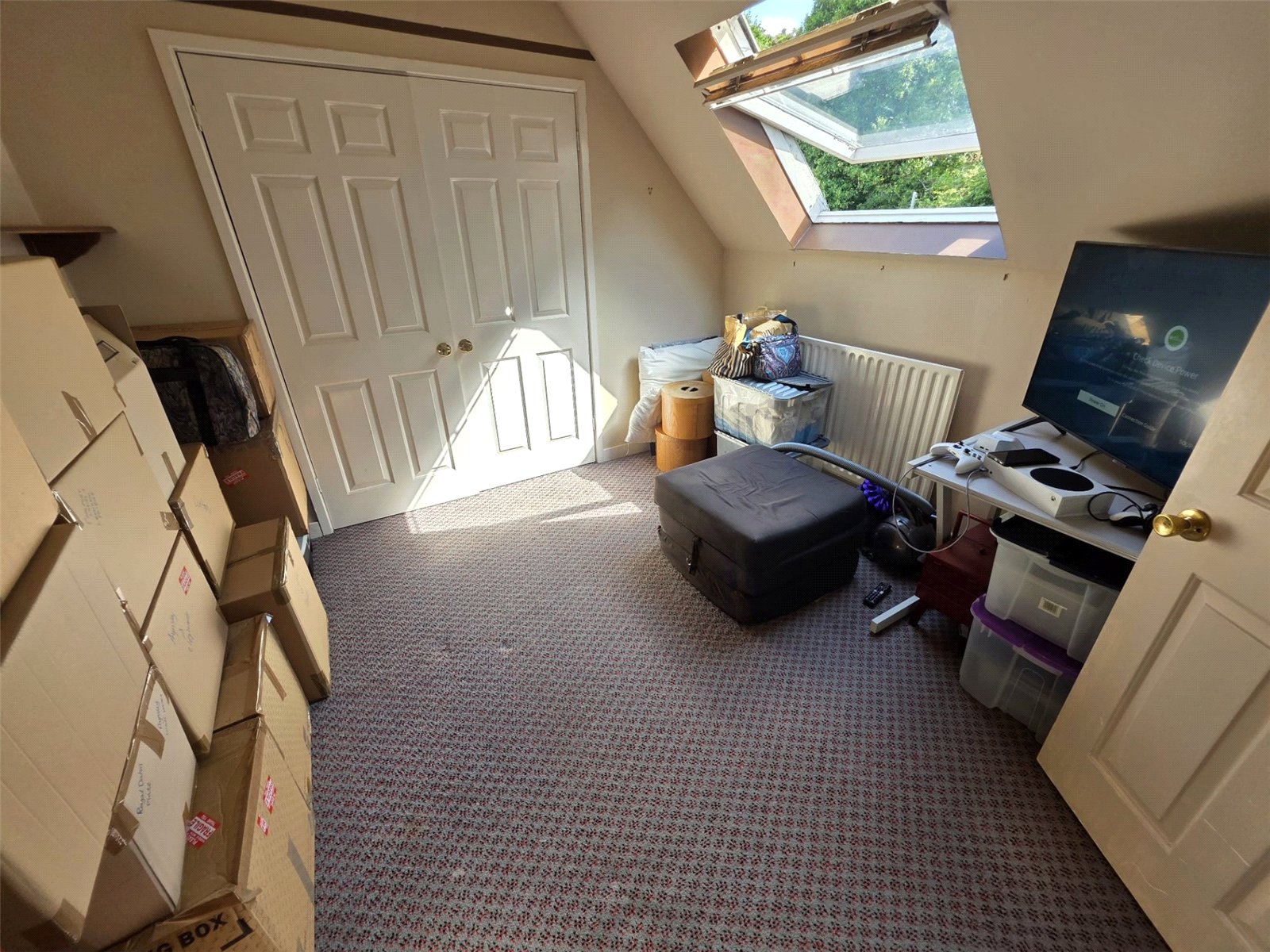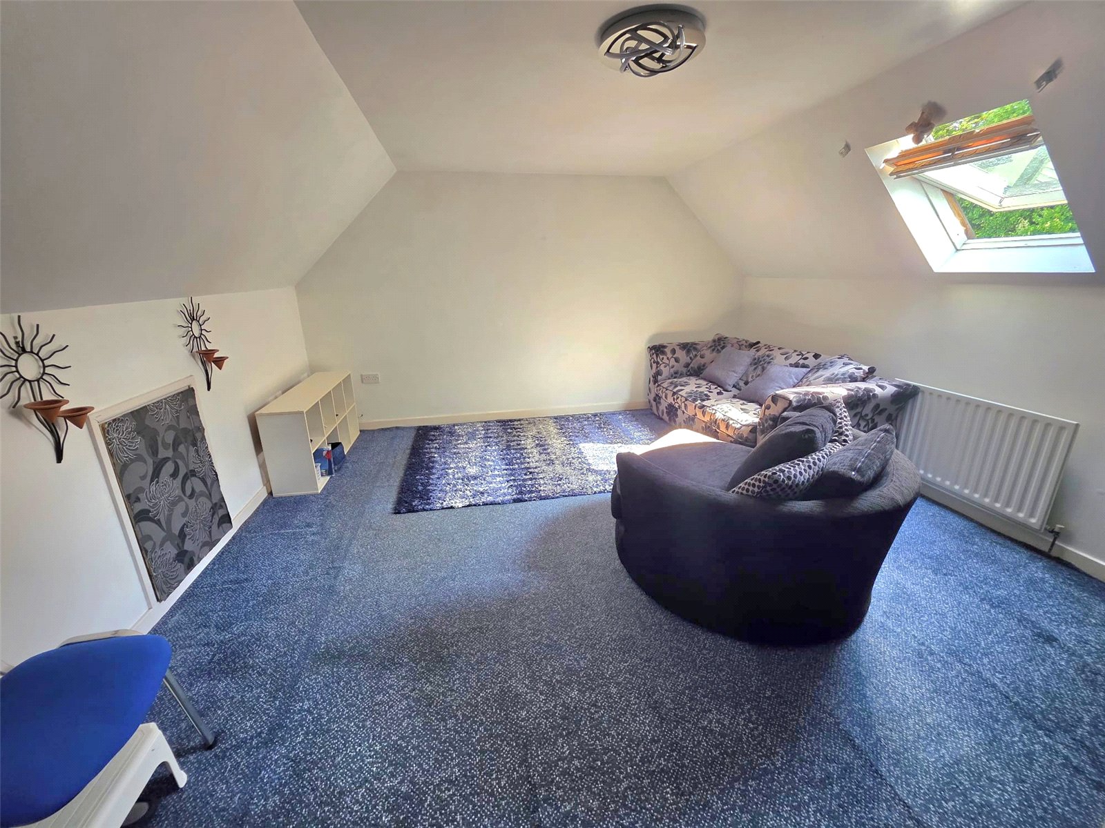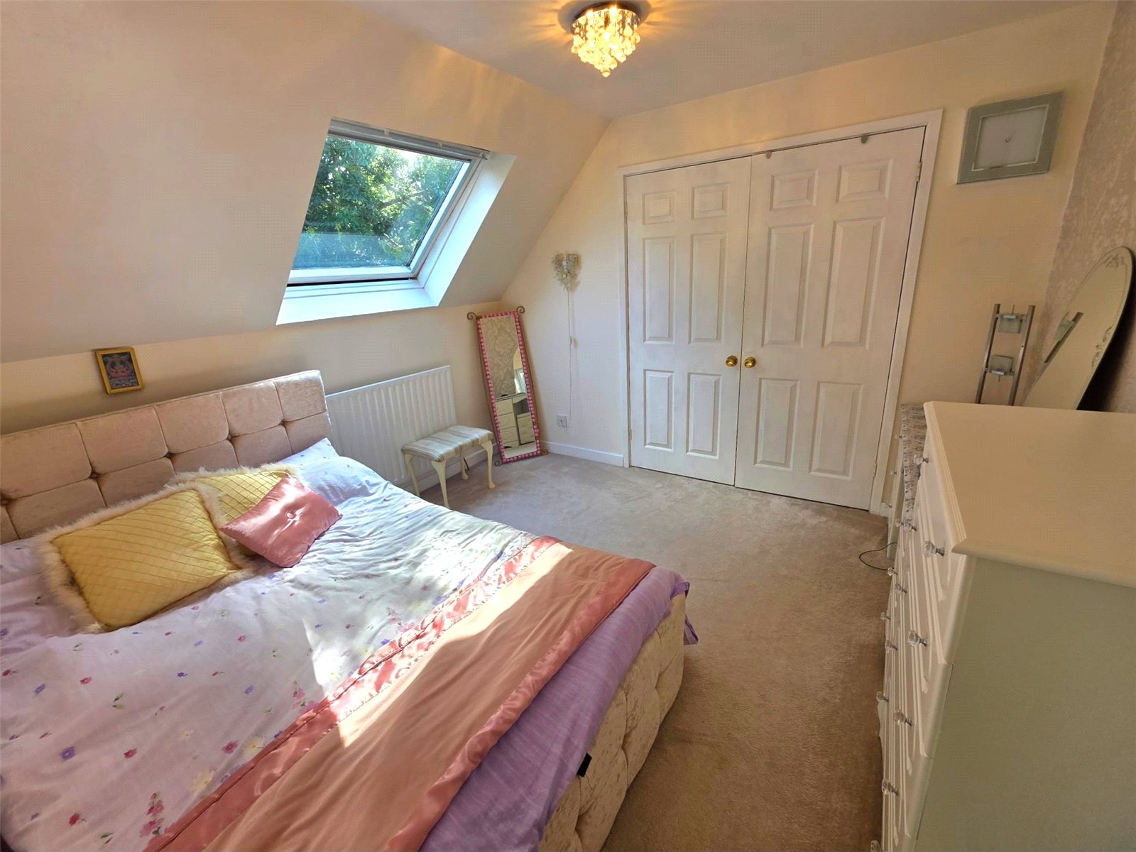 Upstairs, a beautifully bright landing β lit by three large skylights β connects four well-proportioned bedrooms. The principal bedroom includes modern fitted wardrobes and drawers, as well as a contemporary en-suite shower room. From this bedroom, there is direct access to a large playroom or hobby studio located above the garage. This versatile space could serve as a private office, creative studio, teenage retreat, or additional living area.