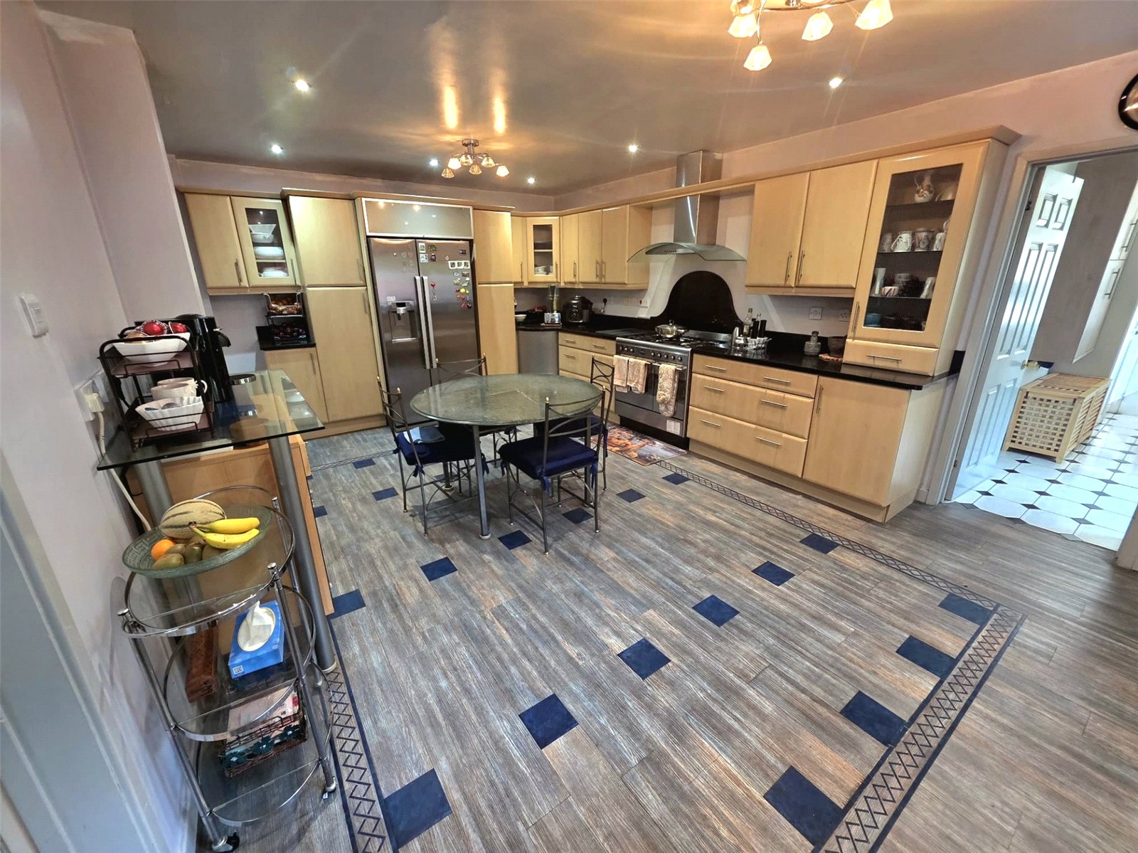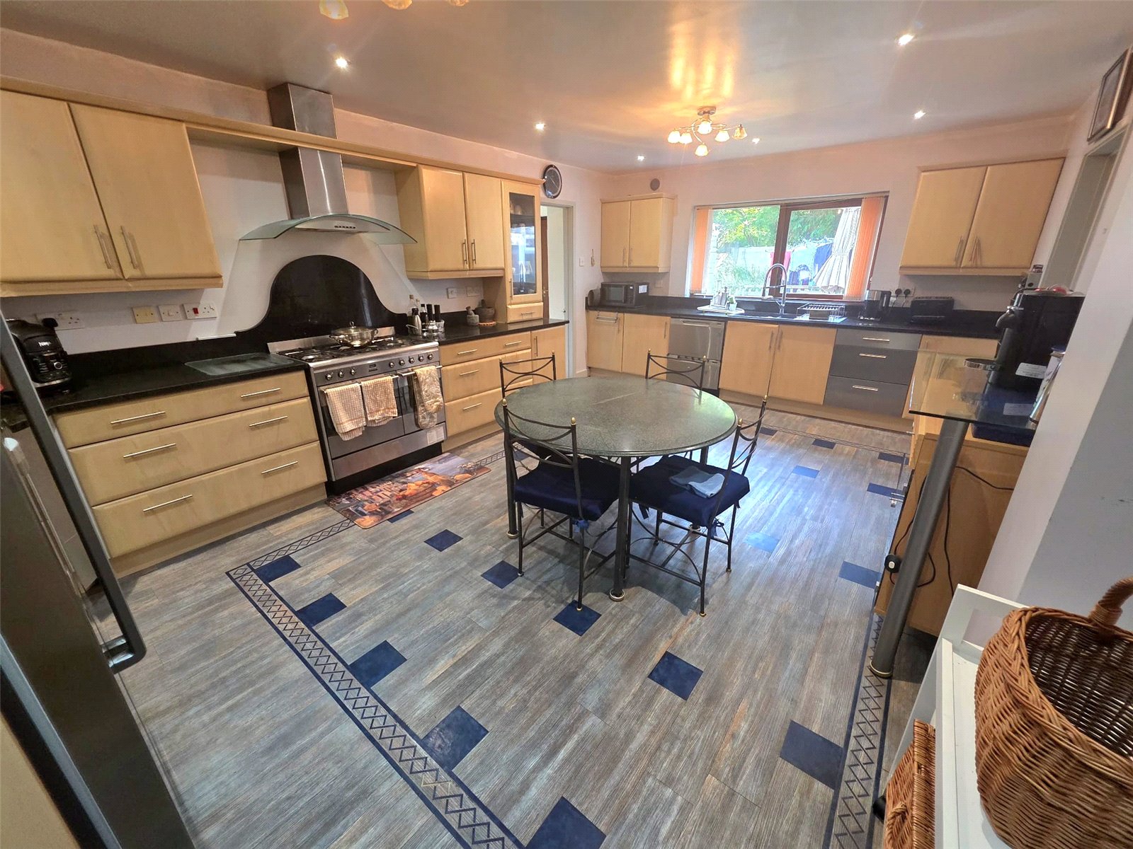 The kitchen and breakfast room is perfect for family life and entertaining. It is fitted with a comprehensive range of wall and base units, a gas-fired cooking range, stainless steel sink, and space for appliances. The adjoining utility room provides further workspace, storage, and plumbing for laundry appliances, along with access to the garden, a walk-in boiler cupboard, and direct entry to the double garage.