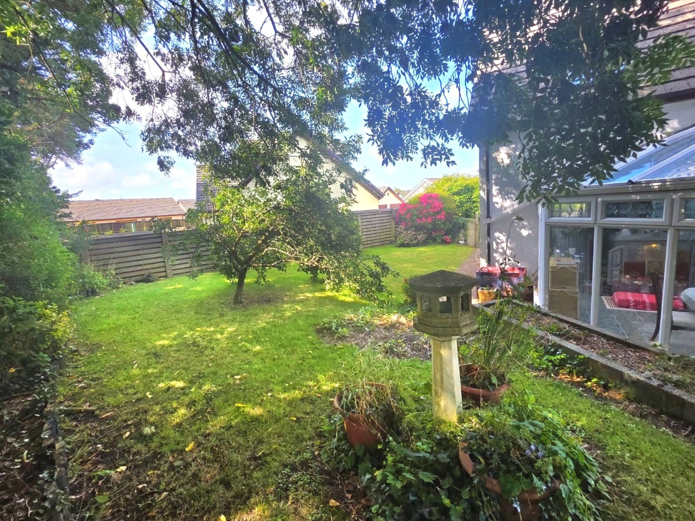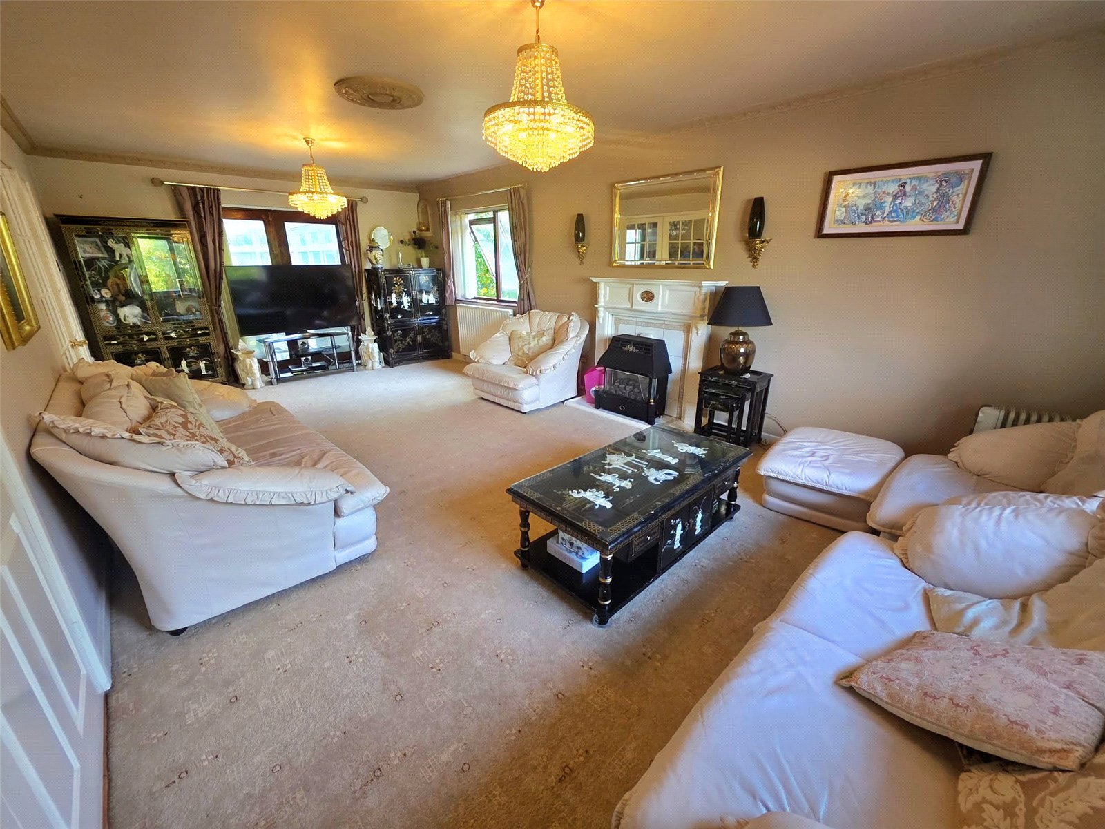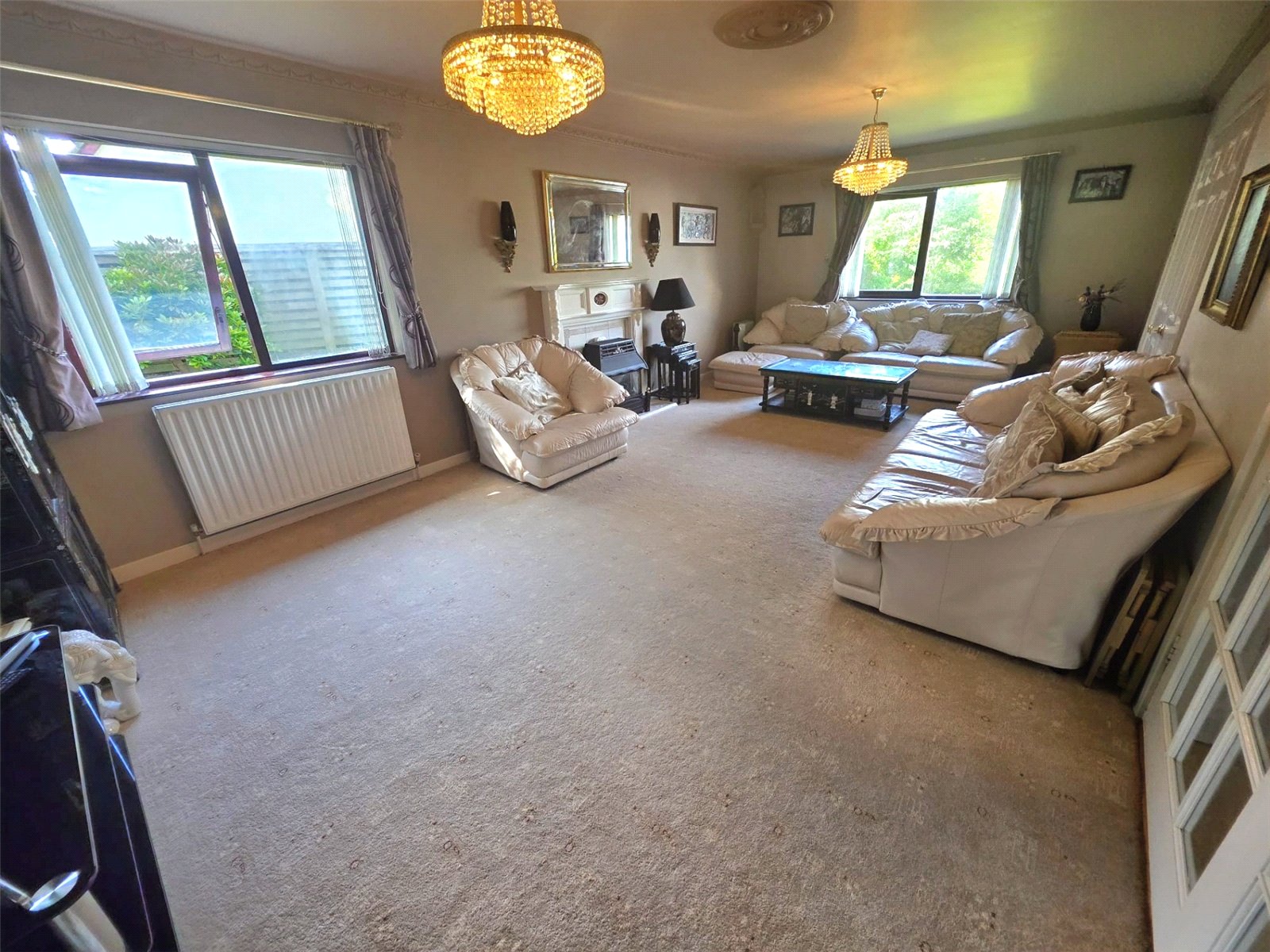 The main lounge is a standout feature β a bright and elegant room with triple aspect windows offering views to the front, side, and rear. A fireplace with a living flame gas fire provides a cosy focal point, and patio doors lead into a large conservatory. This light-filled space offers panoramic views over the garden and direct access outside, making it ideal for year-round enjoyment.