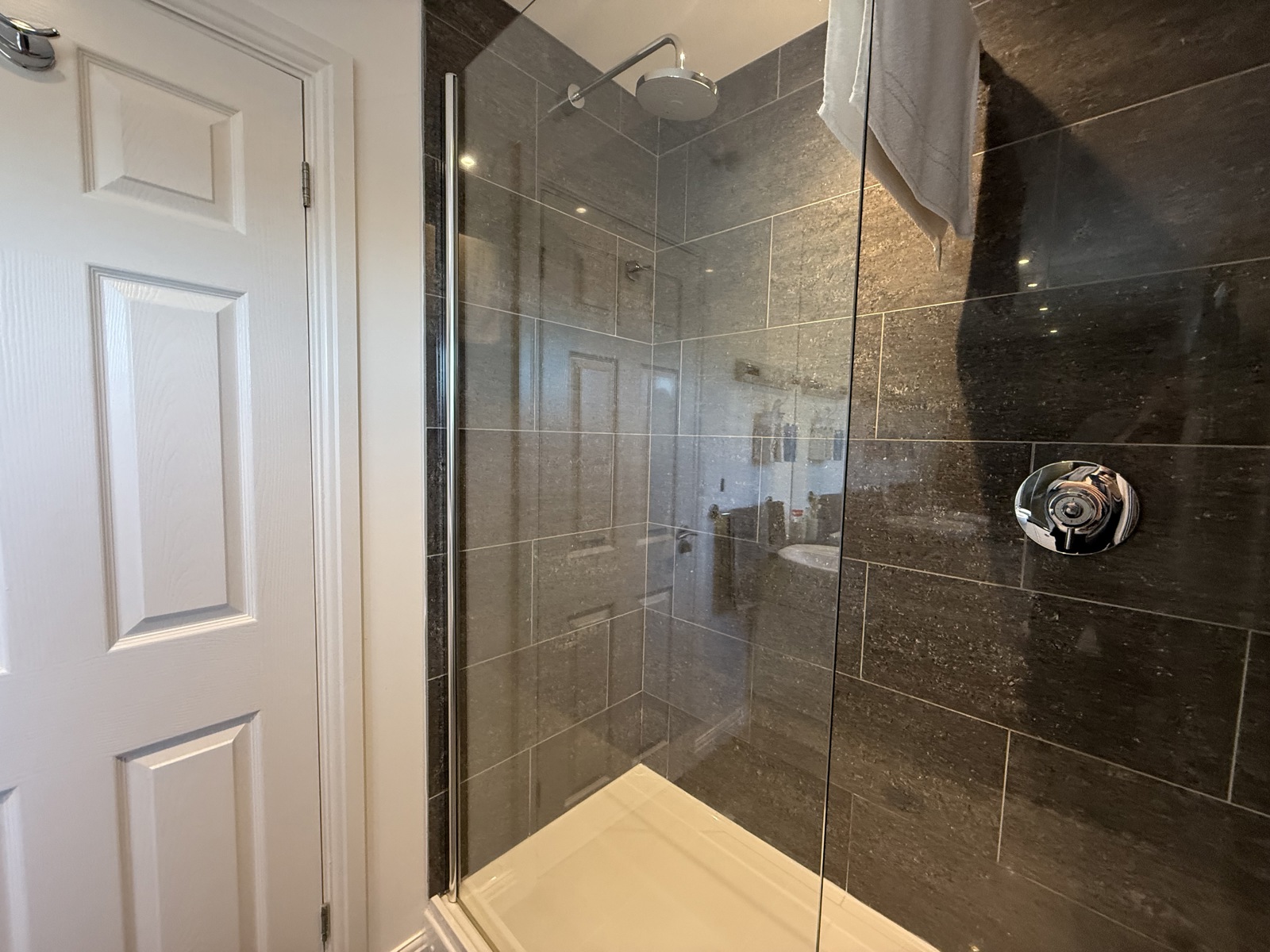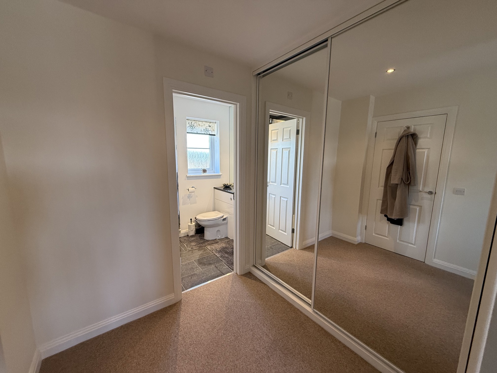 En suite comprising of double walk in shower cubicle, power shower, vanity unit with concealed cistern, wash hand basin, wc, chrome heated towel rail, obscure uPVC double glazed window to rear, spotlighting, extractor fan.