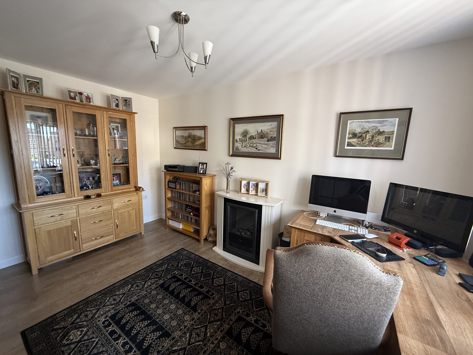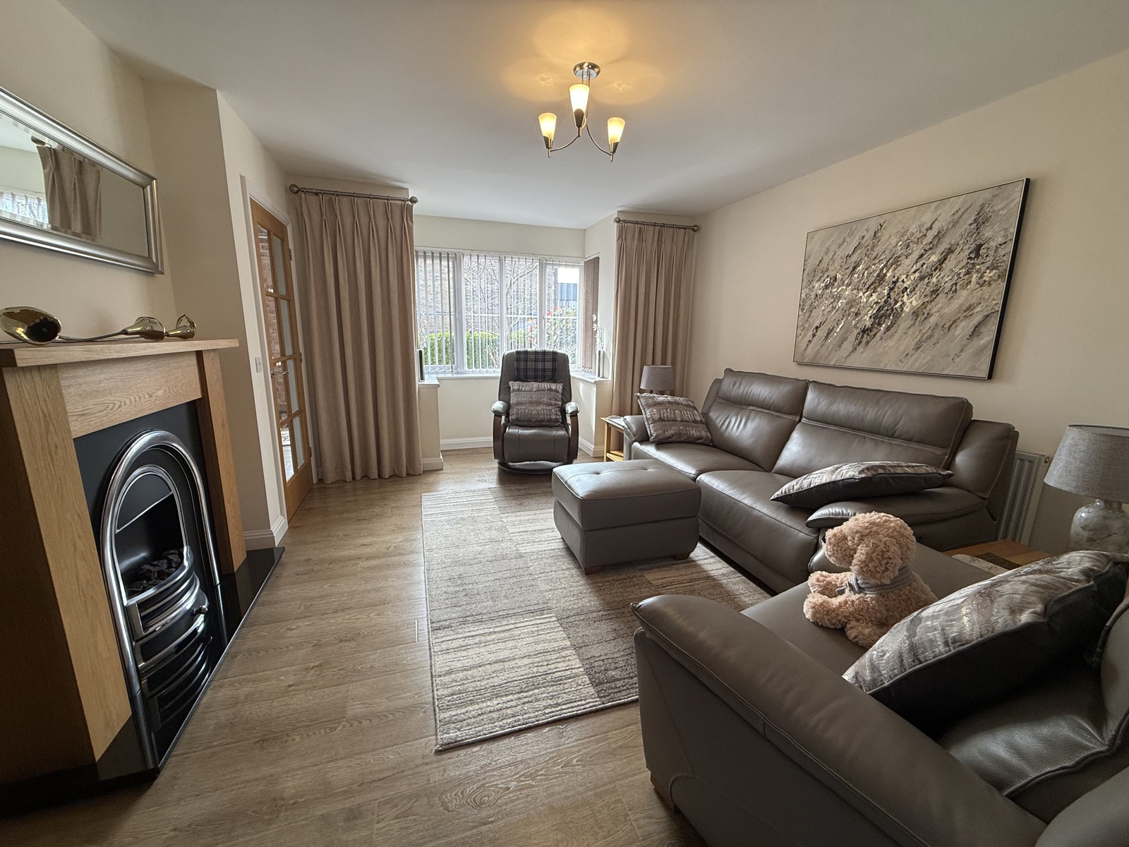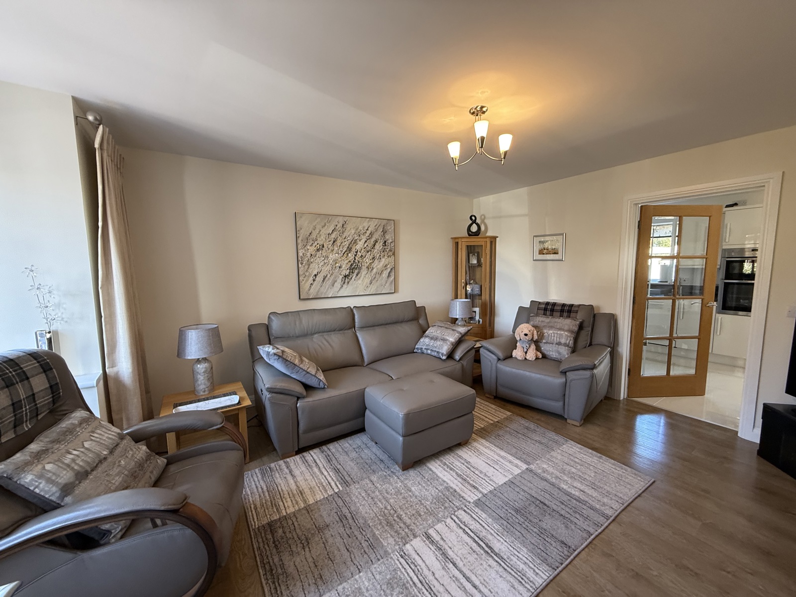Bay uPVC double glazed window to fore, electric fireplace, laminate wood-effect flooring, lighting, radiator, tv, sky and telephone points, door into;