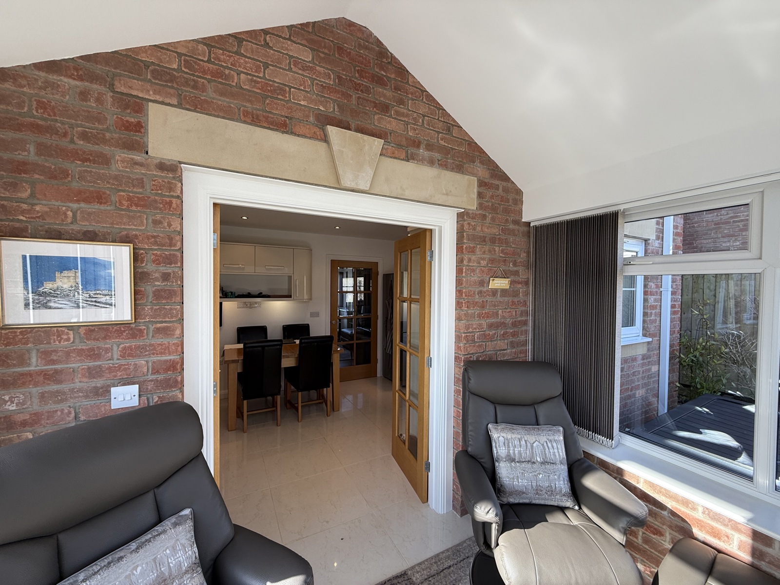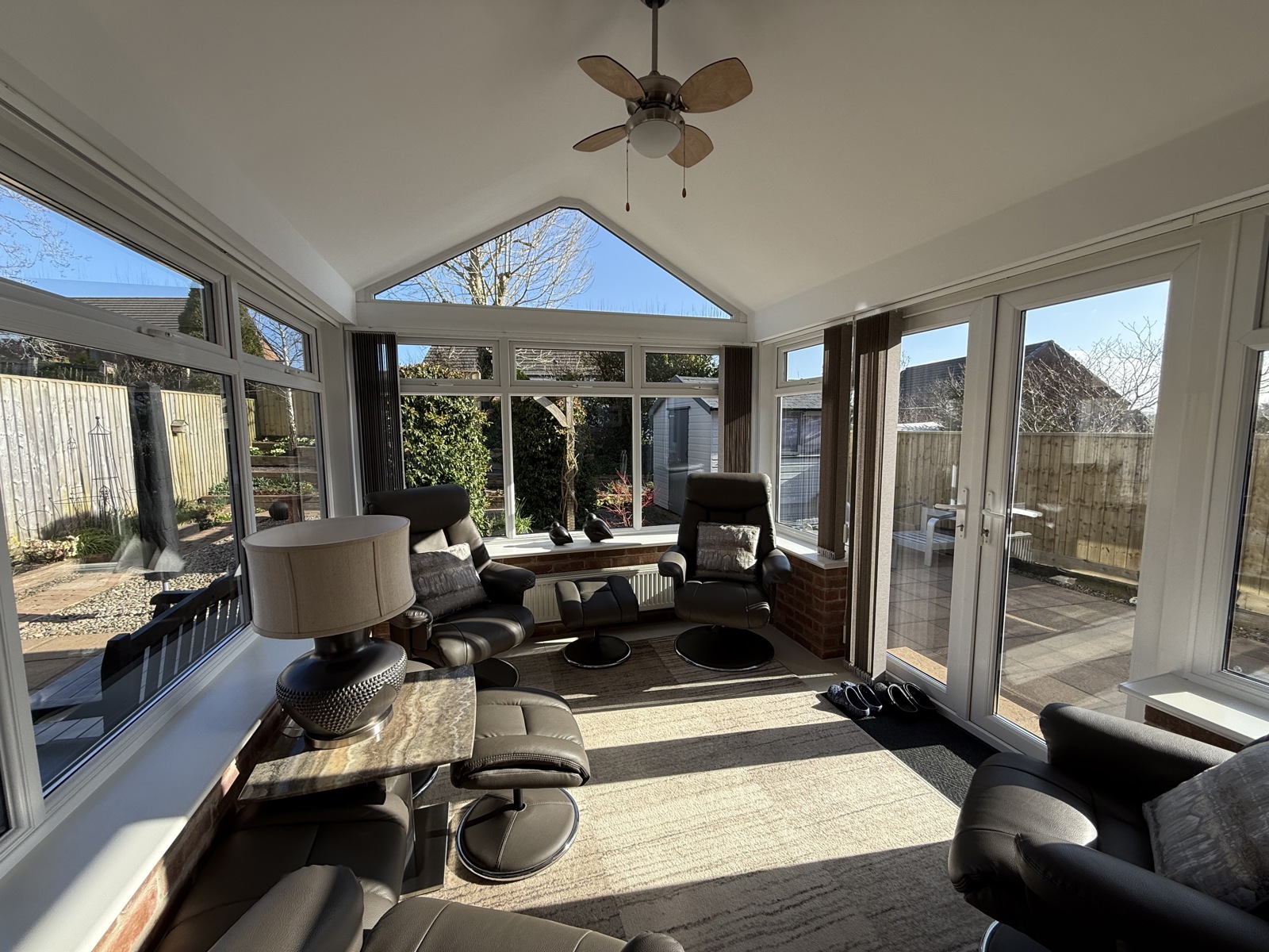 A beautiful room enjoying sun filled light, double doors opening to patio area and gardens, fully double glazed with unique triangular window, ceiling fan with lighting, radiator, power points, polished tiled flooring.