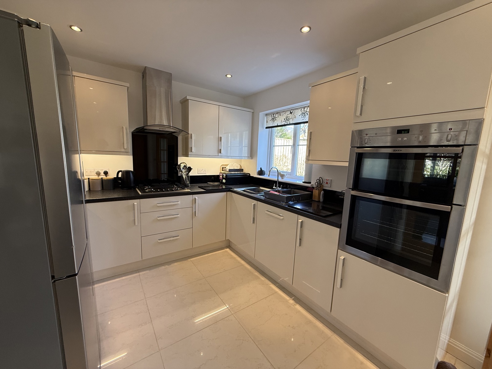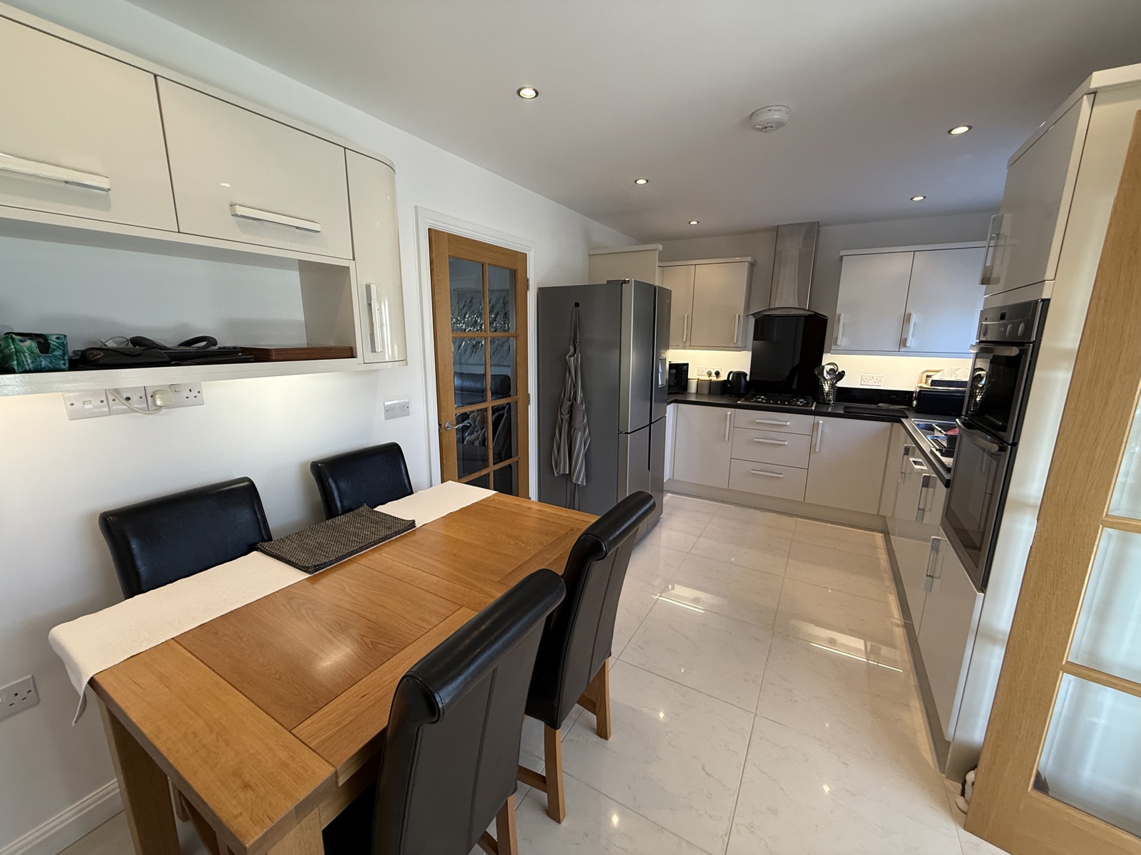Modern kitchen units, wall and floor tiling, uPVC double glazed window to rear, spotlighting, kitchen appliances include stainless steel sink and drainer, 4 ring gas hob with electric oven and grill, extractor hood over, free standing double fridge freezer and dishwasher, space for table and chair set, double doors to;