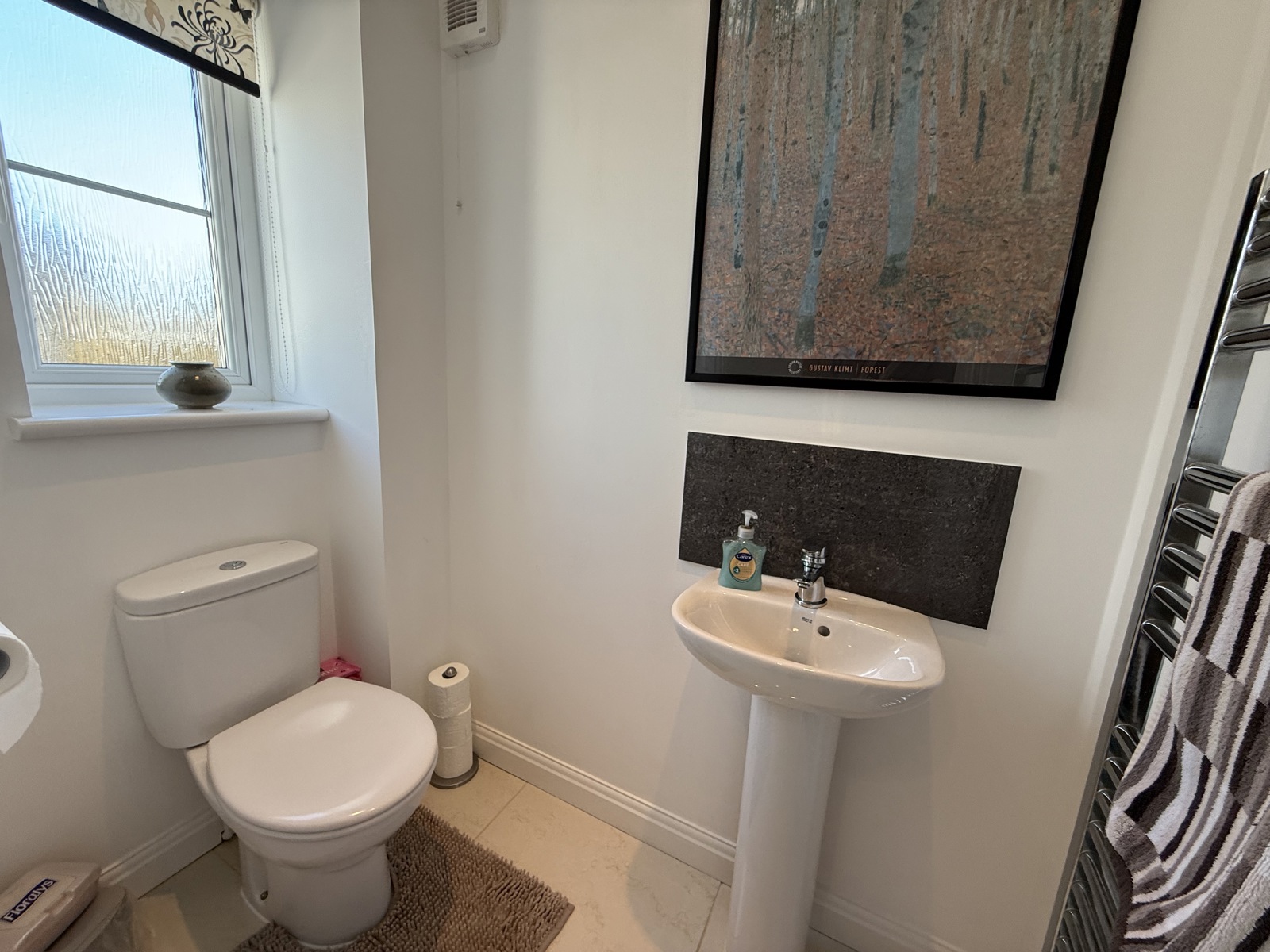 Obscure uPVC double glazed window to rear, wc, pedestal wash hand basin, chrome heated towel rial, spotlighting, tiled floor.