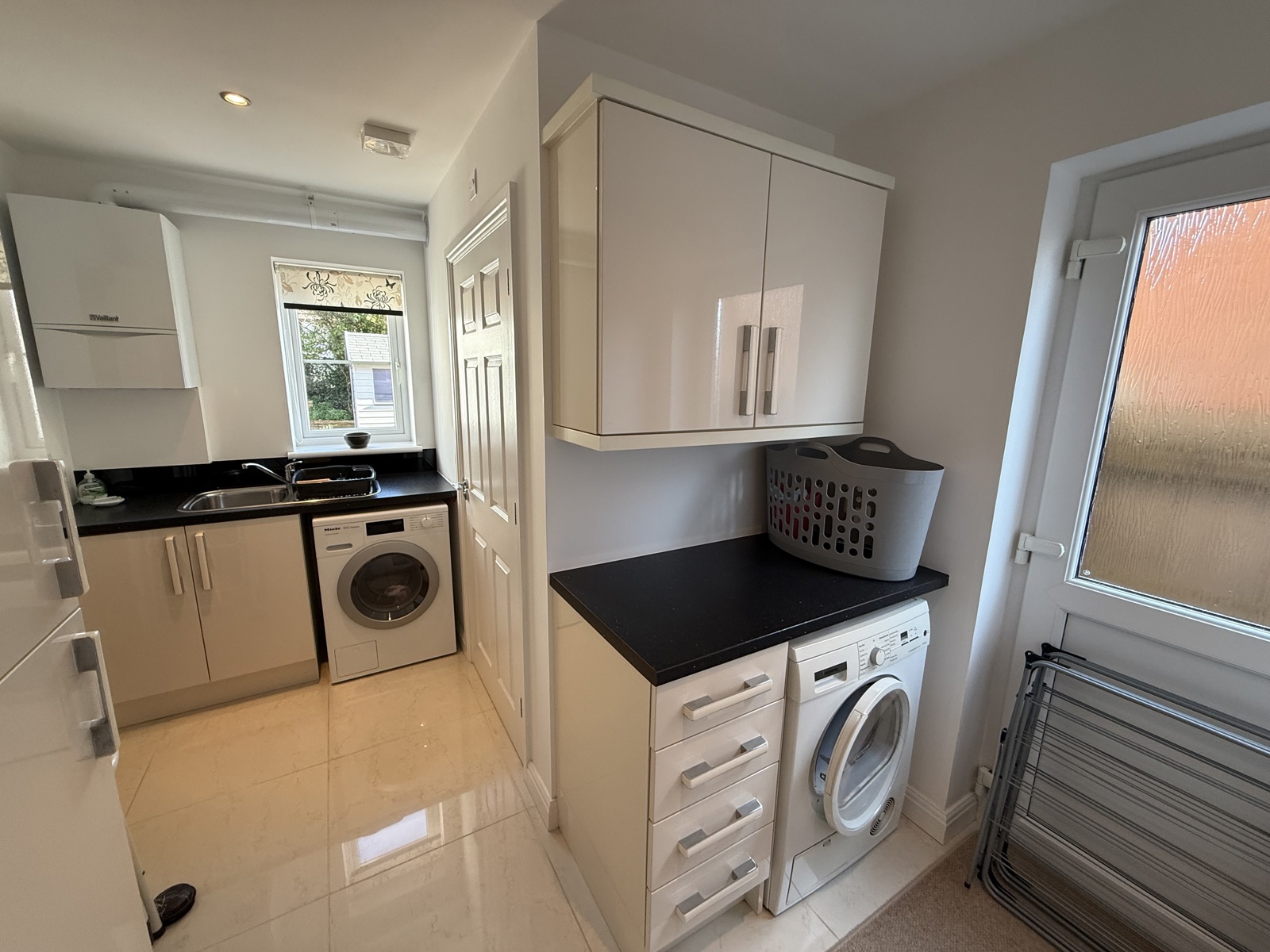 Modern base and wall units, integrated stainless steel sink and drainer, plumbing for washing machine, wall mounted gas combi boiler, spotlighting, uPVC double glazed window to rear and door giving access to exterior, storage cupboard, built in cupboard with freezer, tiled floor. door to: