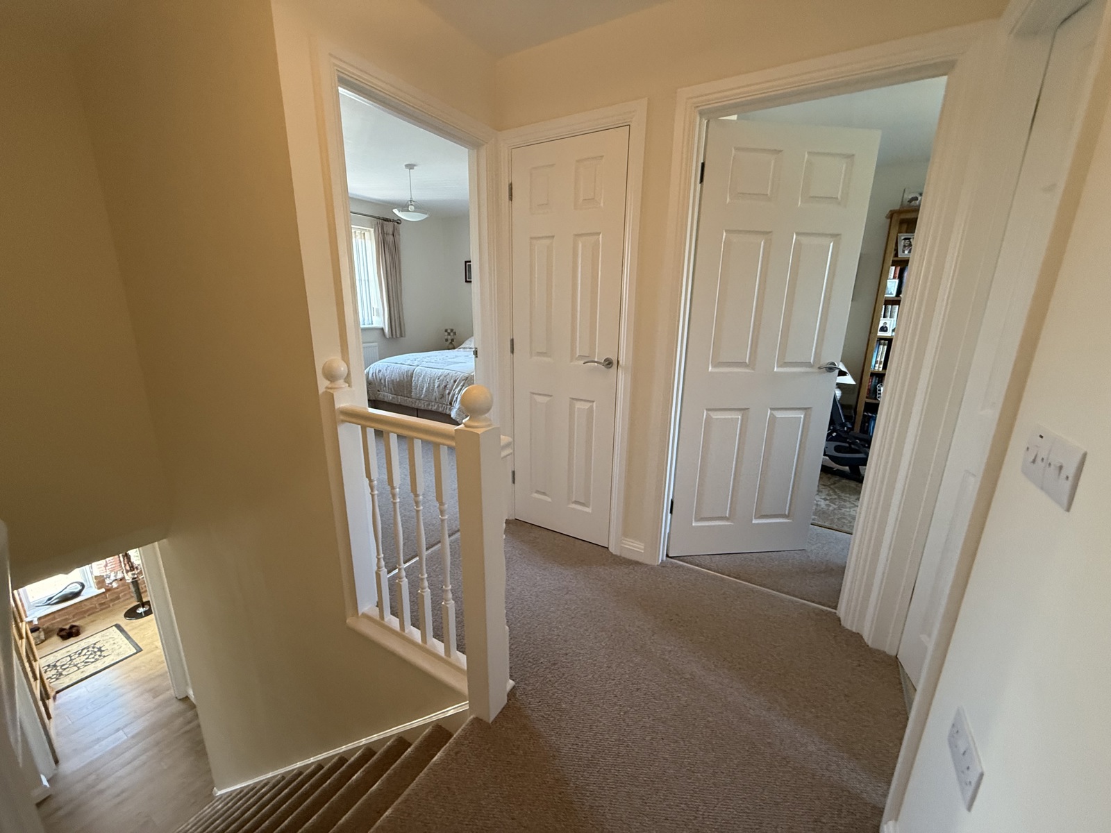 Landing with access to all first floor rooms, lighting, shelved airing cupboard with radiator, loft access. Loft is partially boarded, light fitting and ladder.