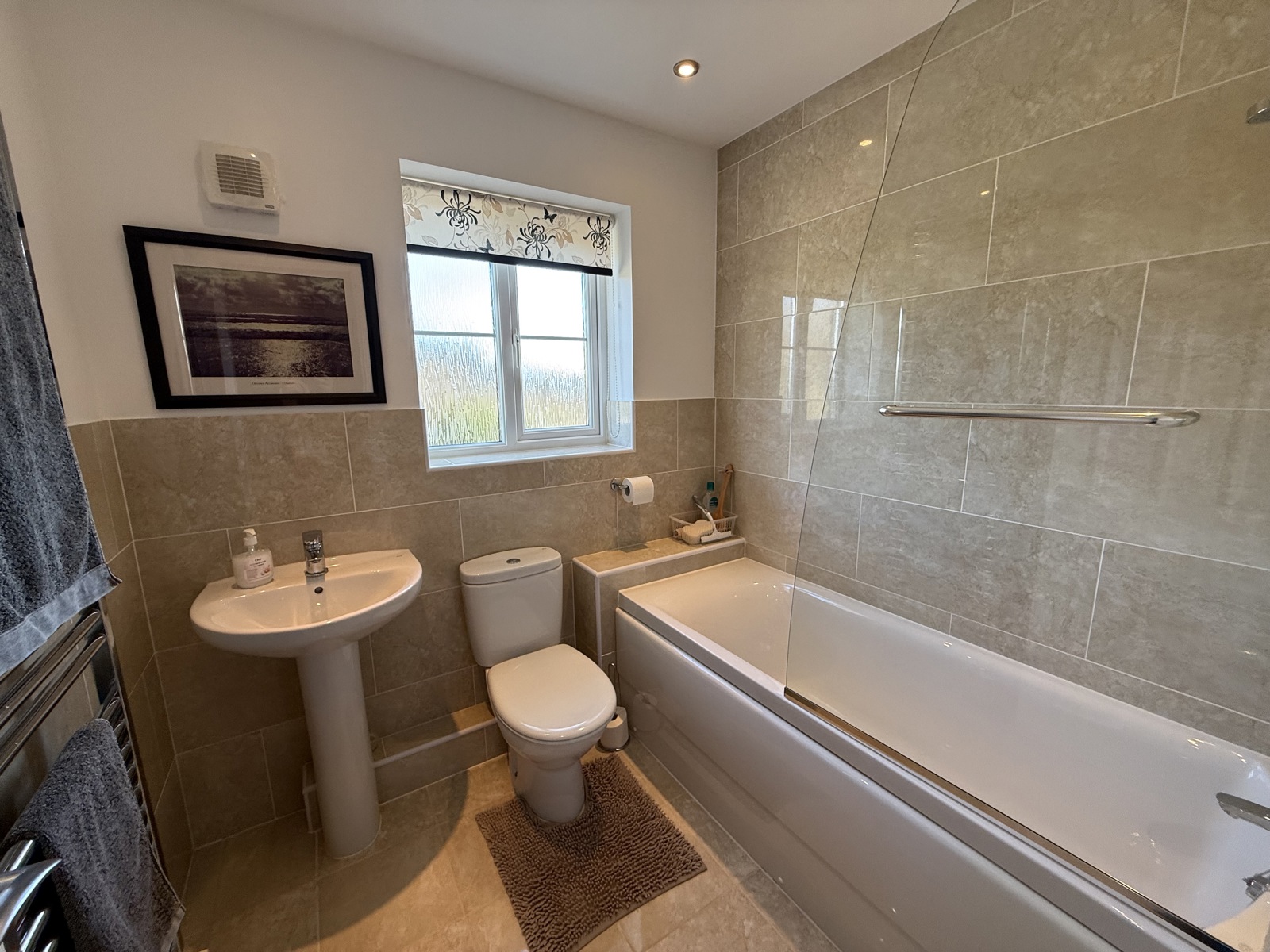 Panelled bath with shower over, pedestal wash hand basin, wc, chrome heated towel rail, obscure uPVC double glazed window to rear, spotlighting, tiled walls and flooring.