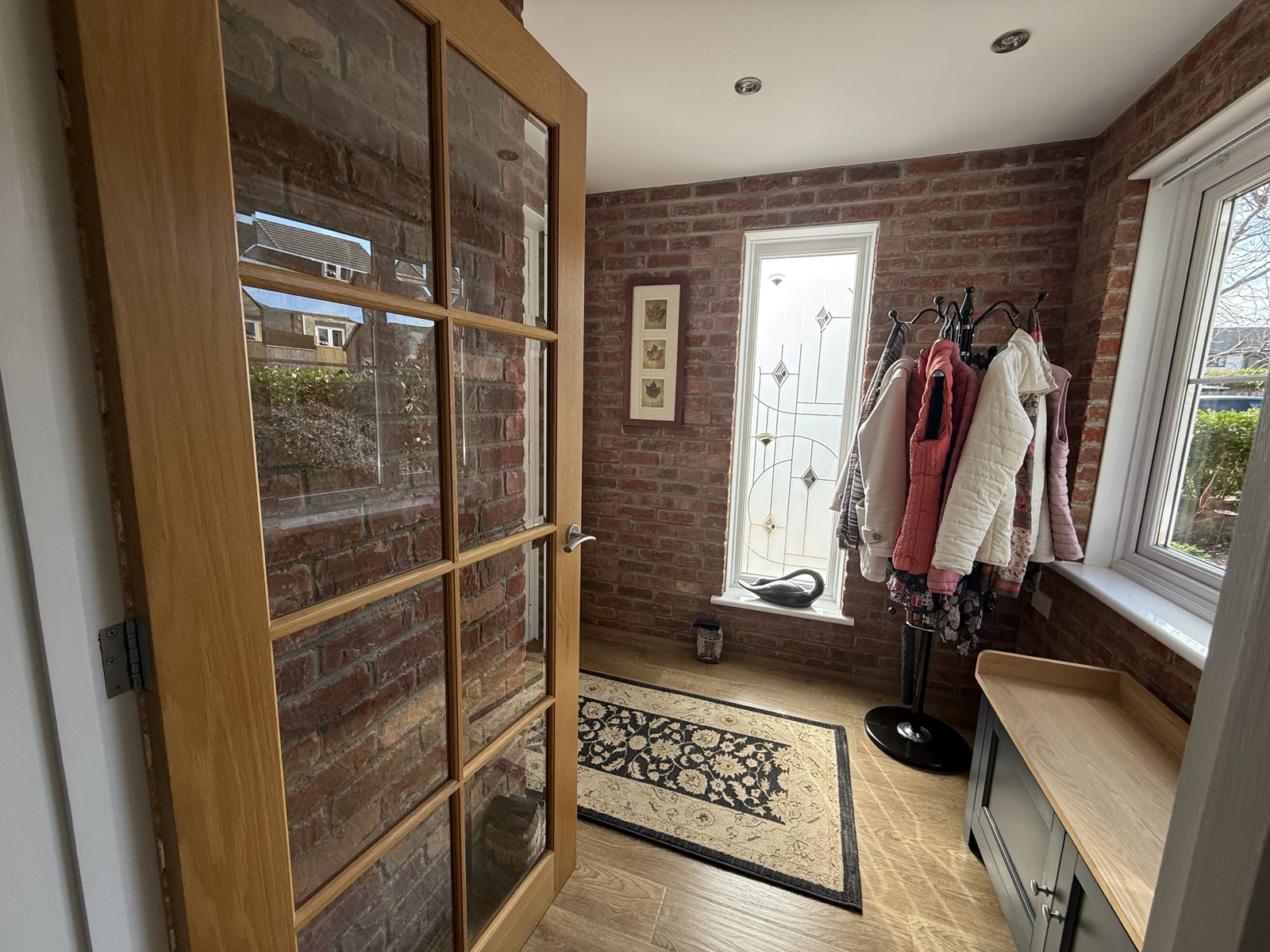 Front entrance porch comprising stunning stained glass window, uPVC double glazed window to the side, wood-effect laminate flooring, stylish brickwork walls, spotlighting and door to: