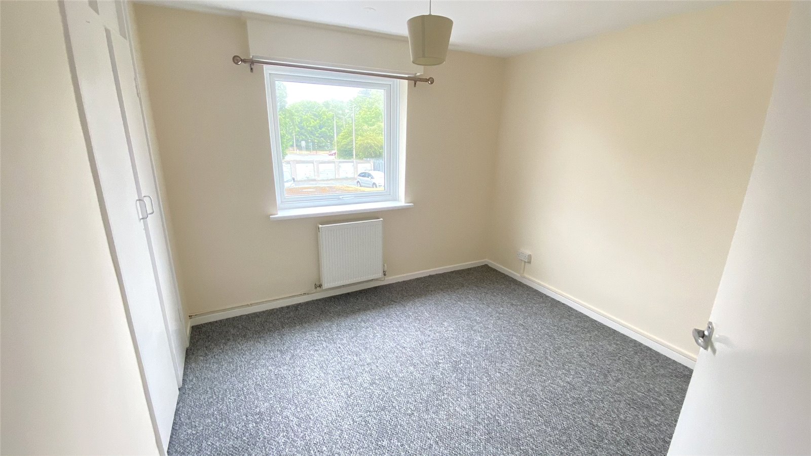Double bedroom, comprising of carpeted flooring, uPVC double-glazed window, radiator, light fitting and recessed closet.