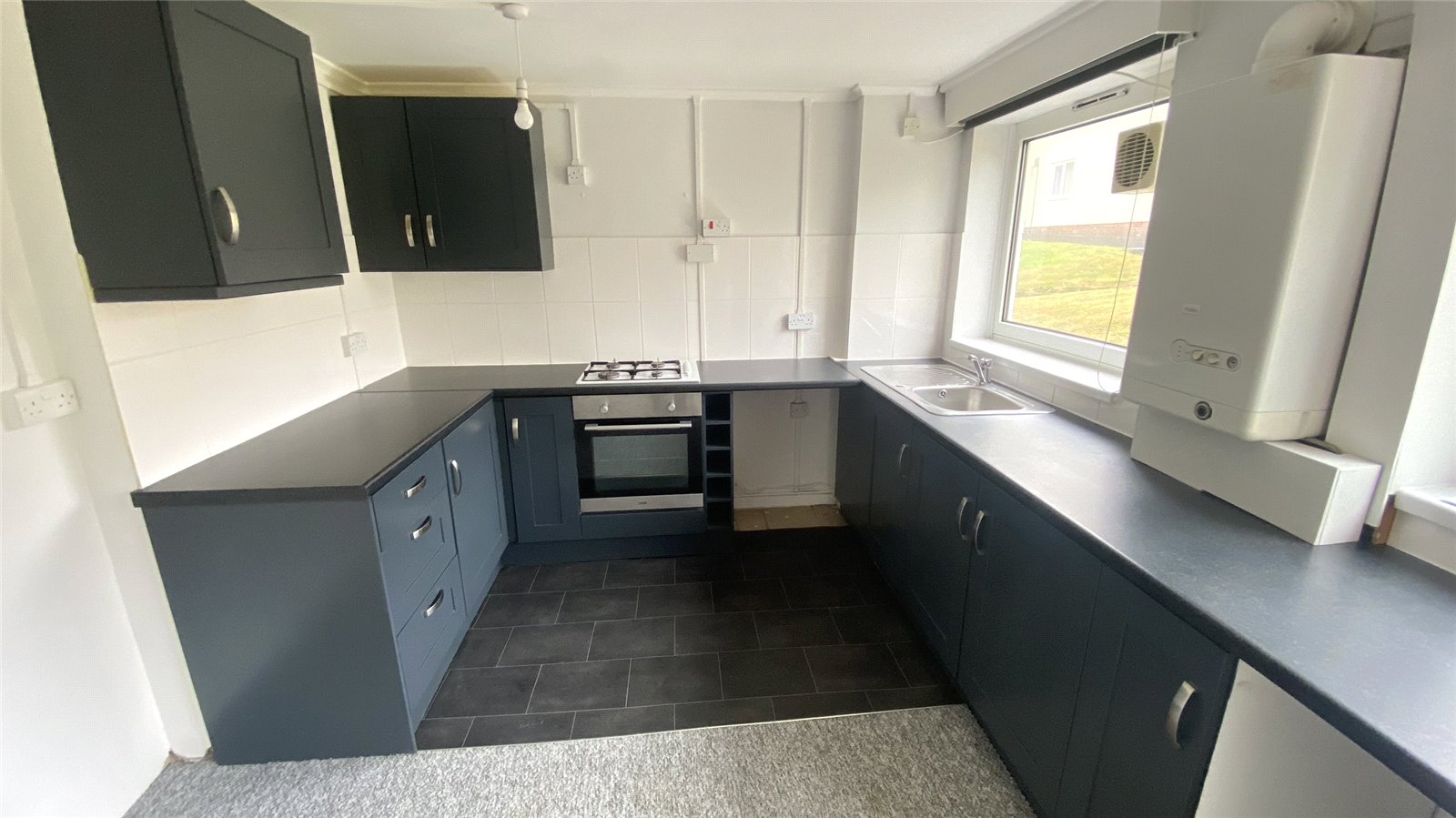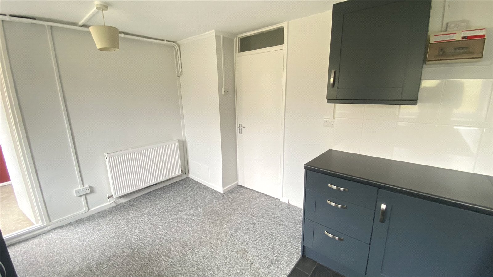 Modern kitchen/diner, comprising of modern base & wall kitchen units, integrated electric oven, gas hob, sink with mixer tap and drainer. uPVC double-glazed windows to the rear, and ample space for dining area. Linoleum flooring to kitchen and carpeted to diner area. Light fitting, radiator and gas combi boiler.