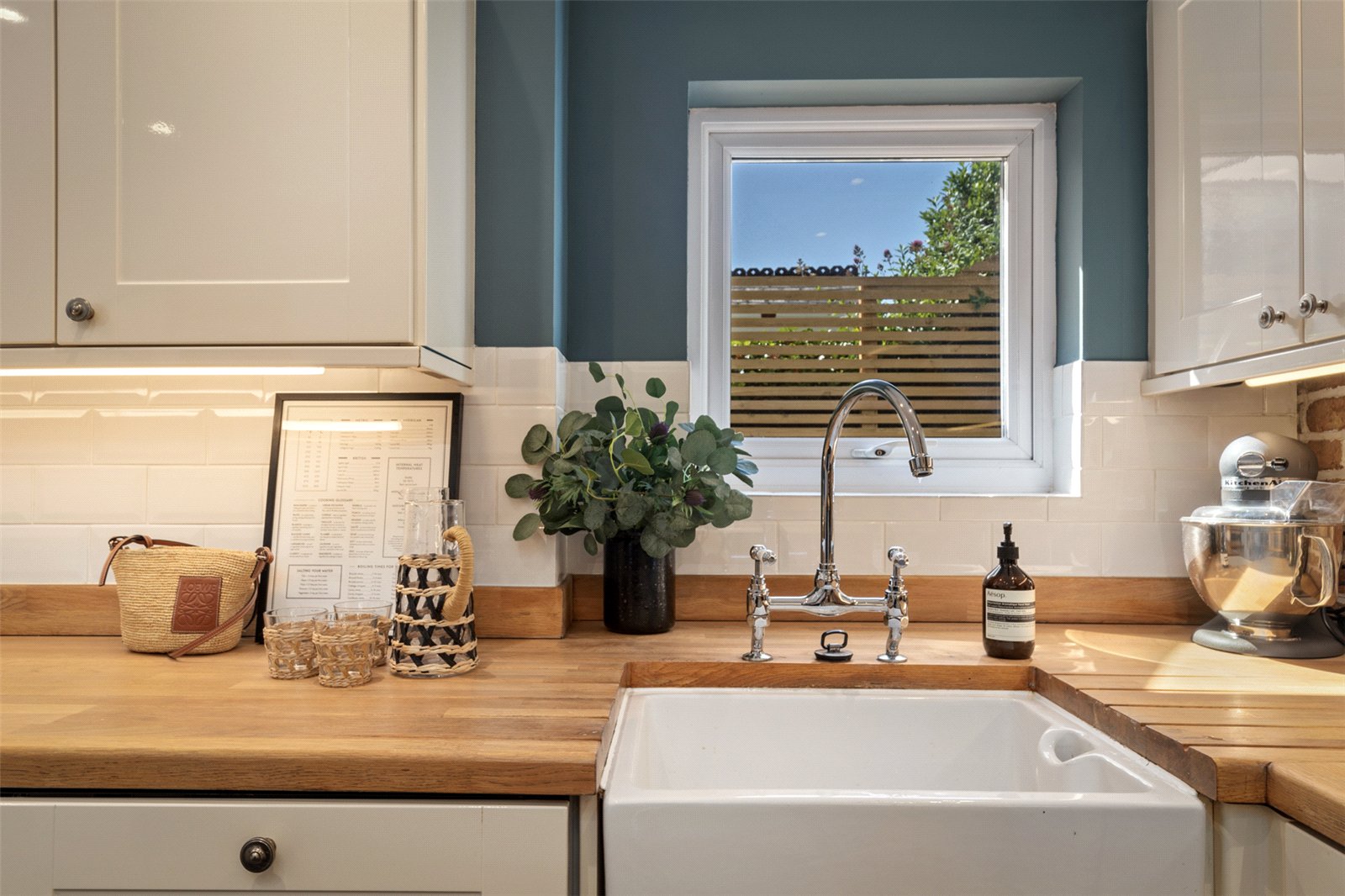 Contempary barnhouse style kitchen, comprising of a range of wall and base cabinets and wooden worktops