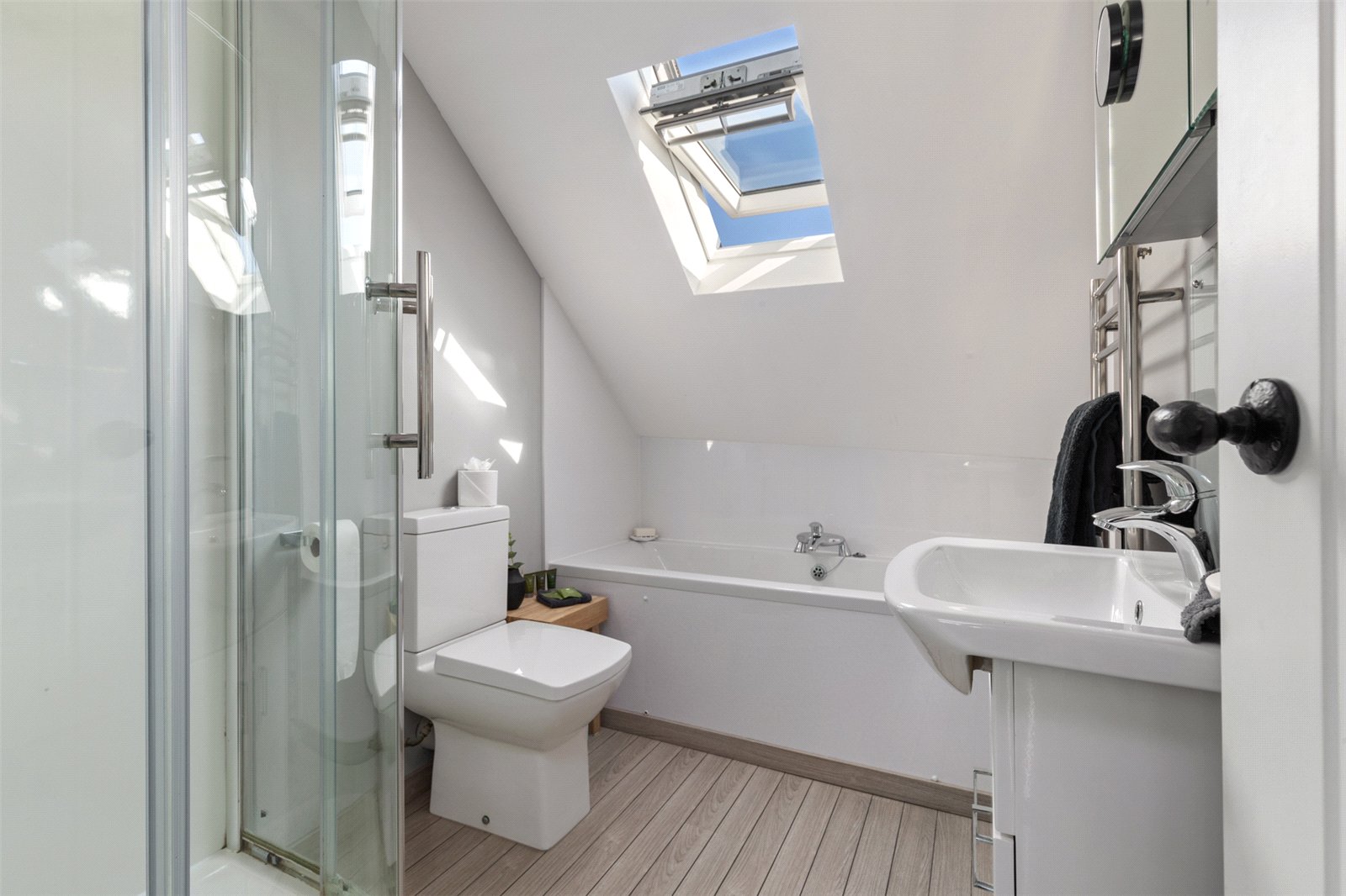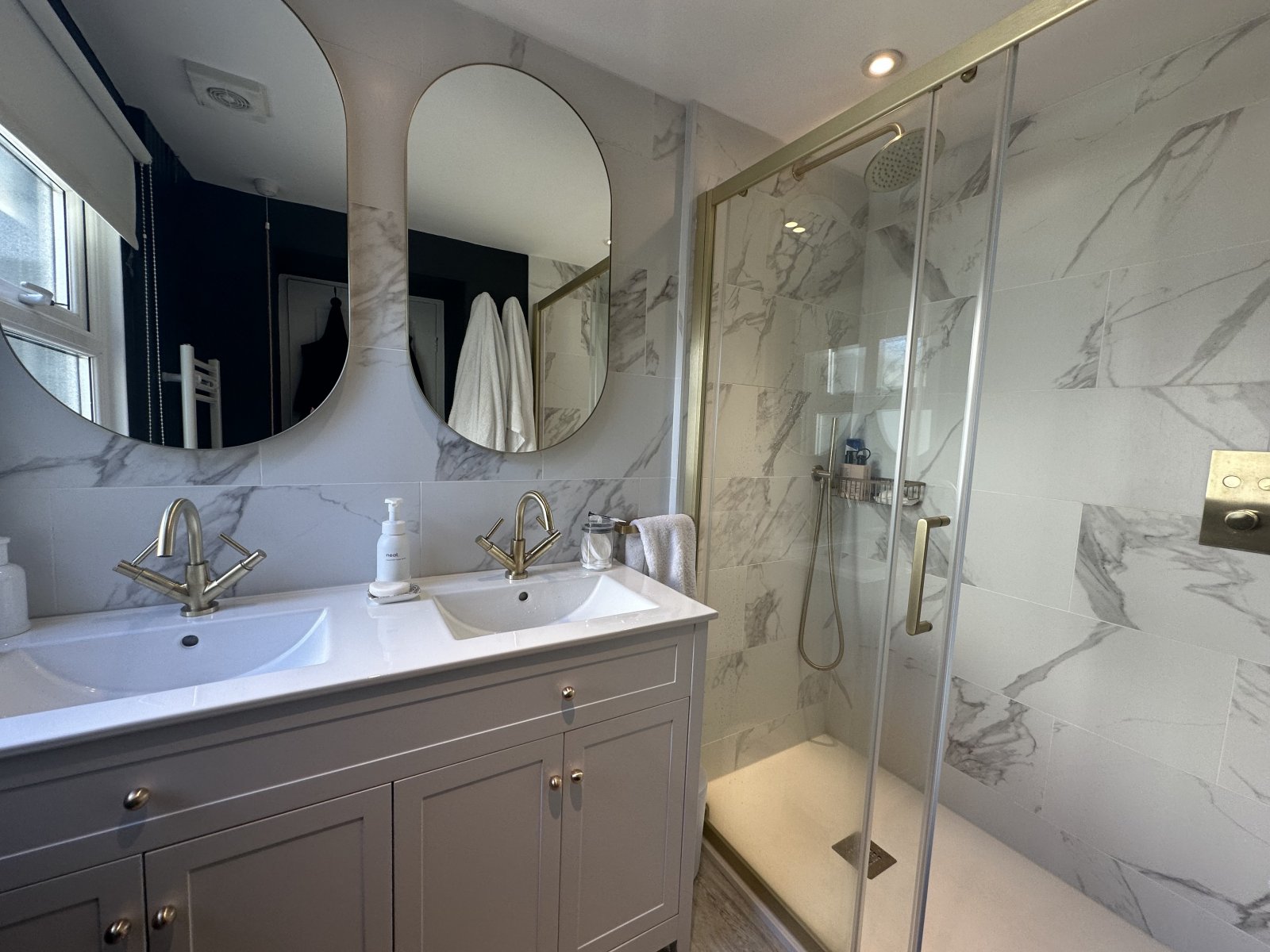 White bathroom suite with vanity wash basin and mixer taps, vanity mirror.