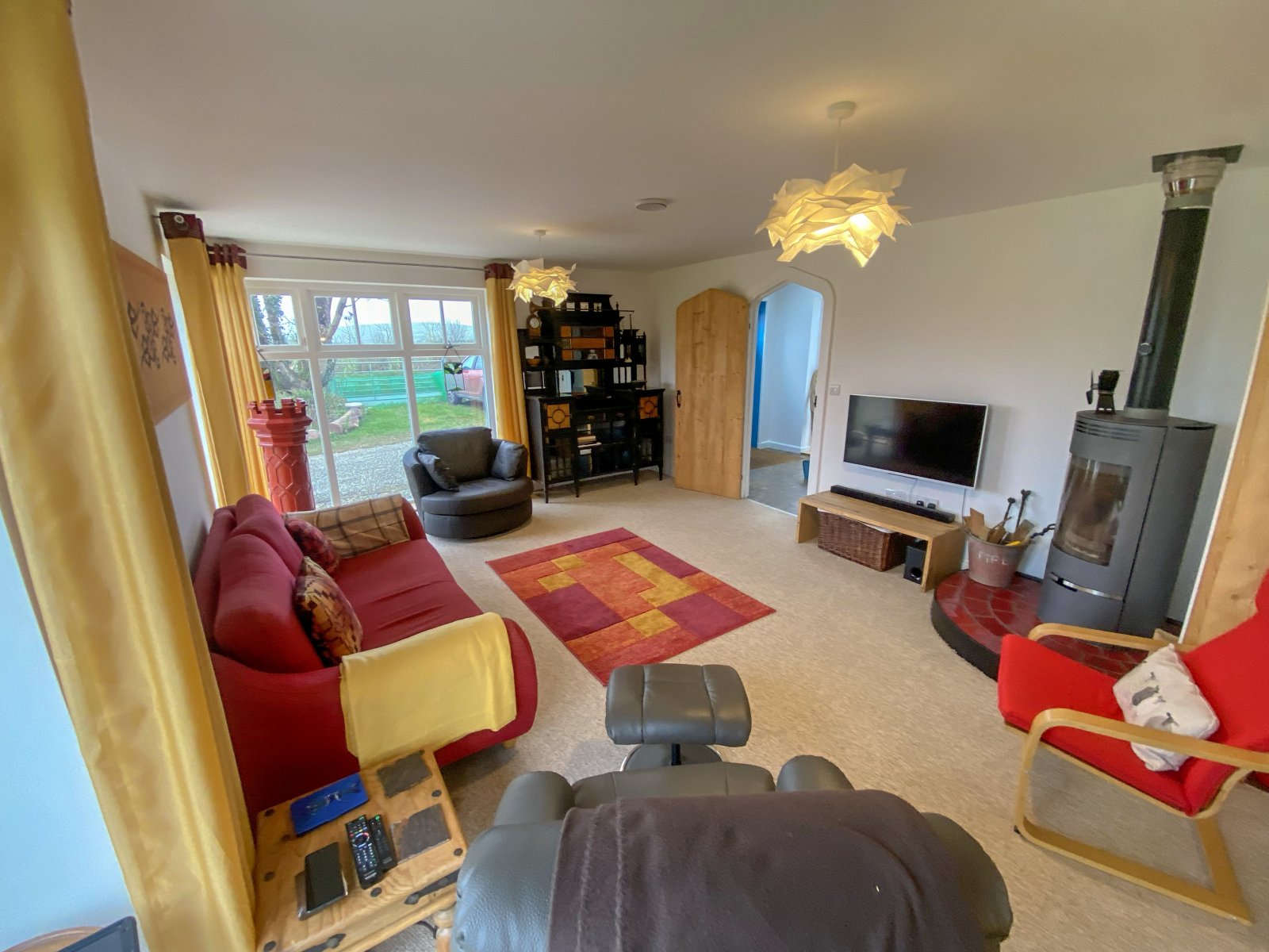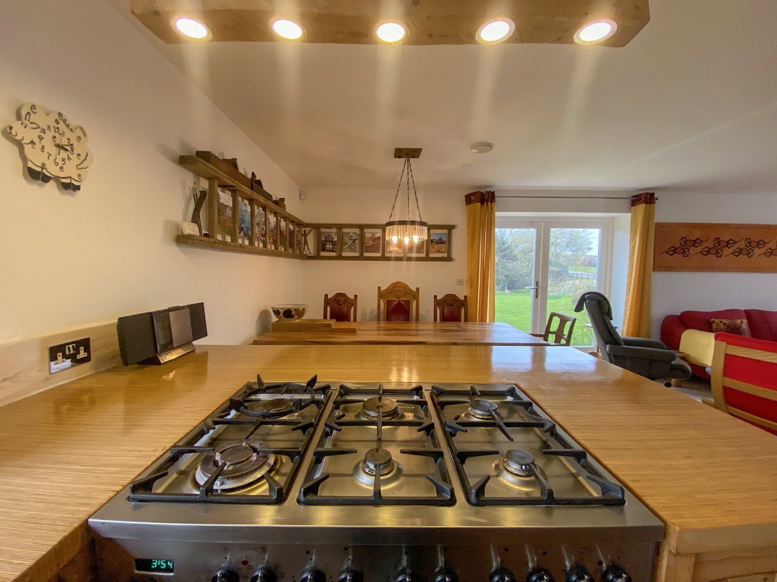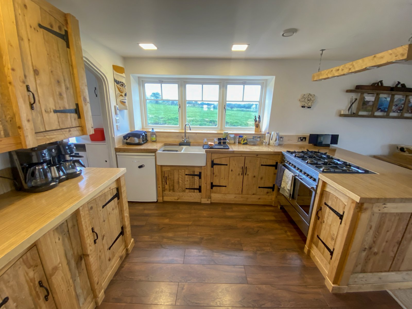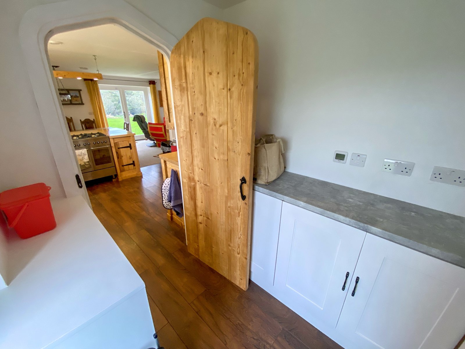 Sizeable kitchen area, comprising of solid pine base & wall units, with integral Belfast sink, double oven and 6-ring gas hob. Also benefitting from triple-glazed rear aspect windows overlooking Plumstone Mountain, as well as low-energy LED lighting and access to;