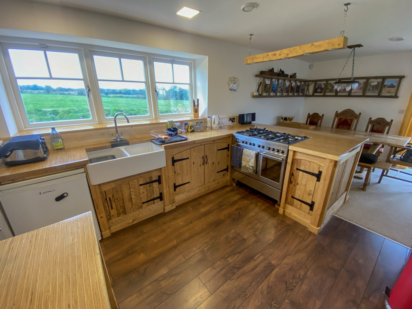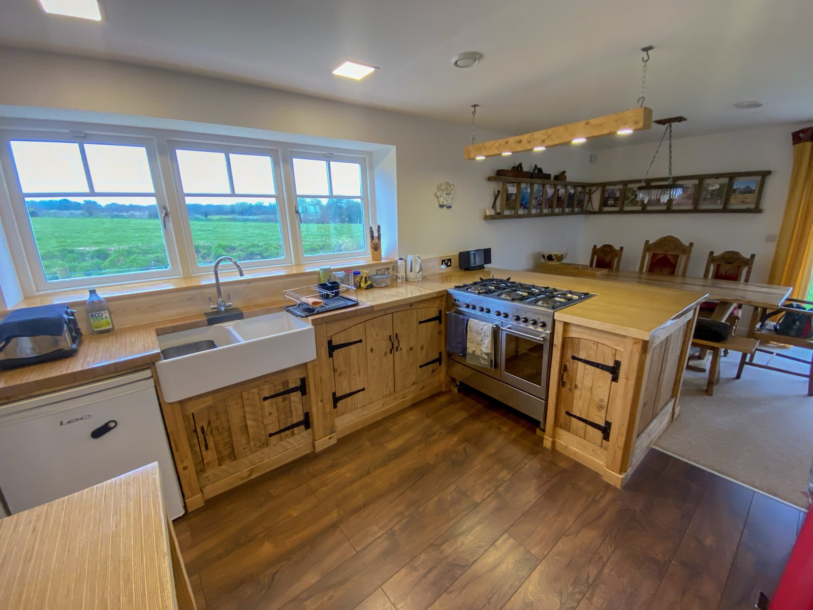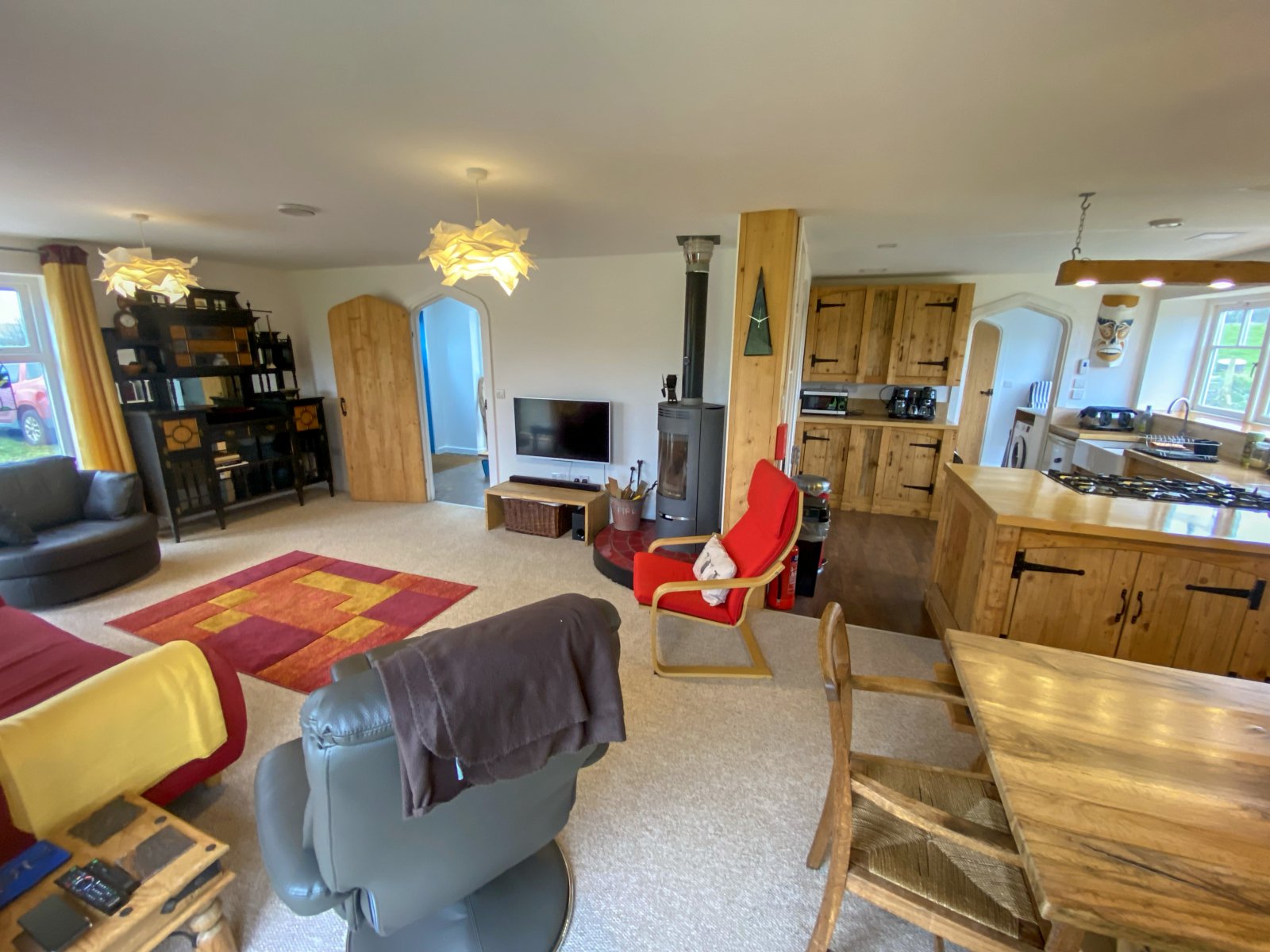 Through a Douglas Fir solid pine door to the open-plan L-shaped lounge/diner/kitchen. Benefitting from triple-glazed front & side aspect, windows and side access French doors, carpeted flooring, drop lighting over dining table, pendant lights x 2, solid-fuel burner and open-plan access to;