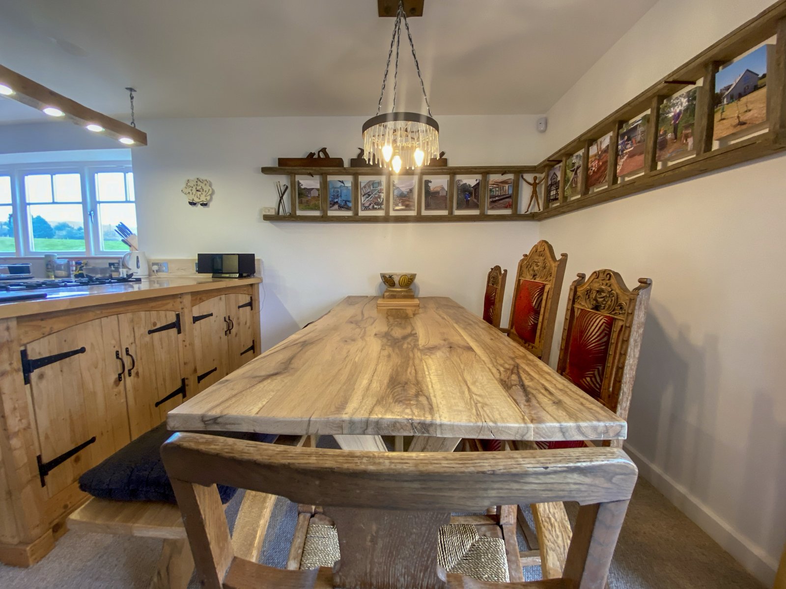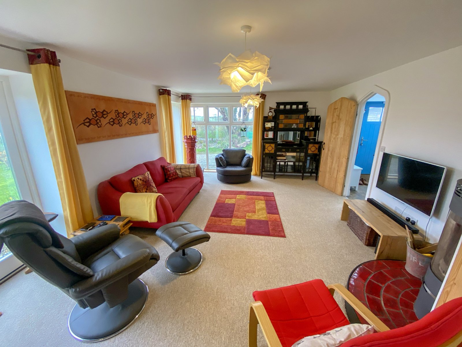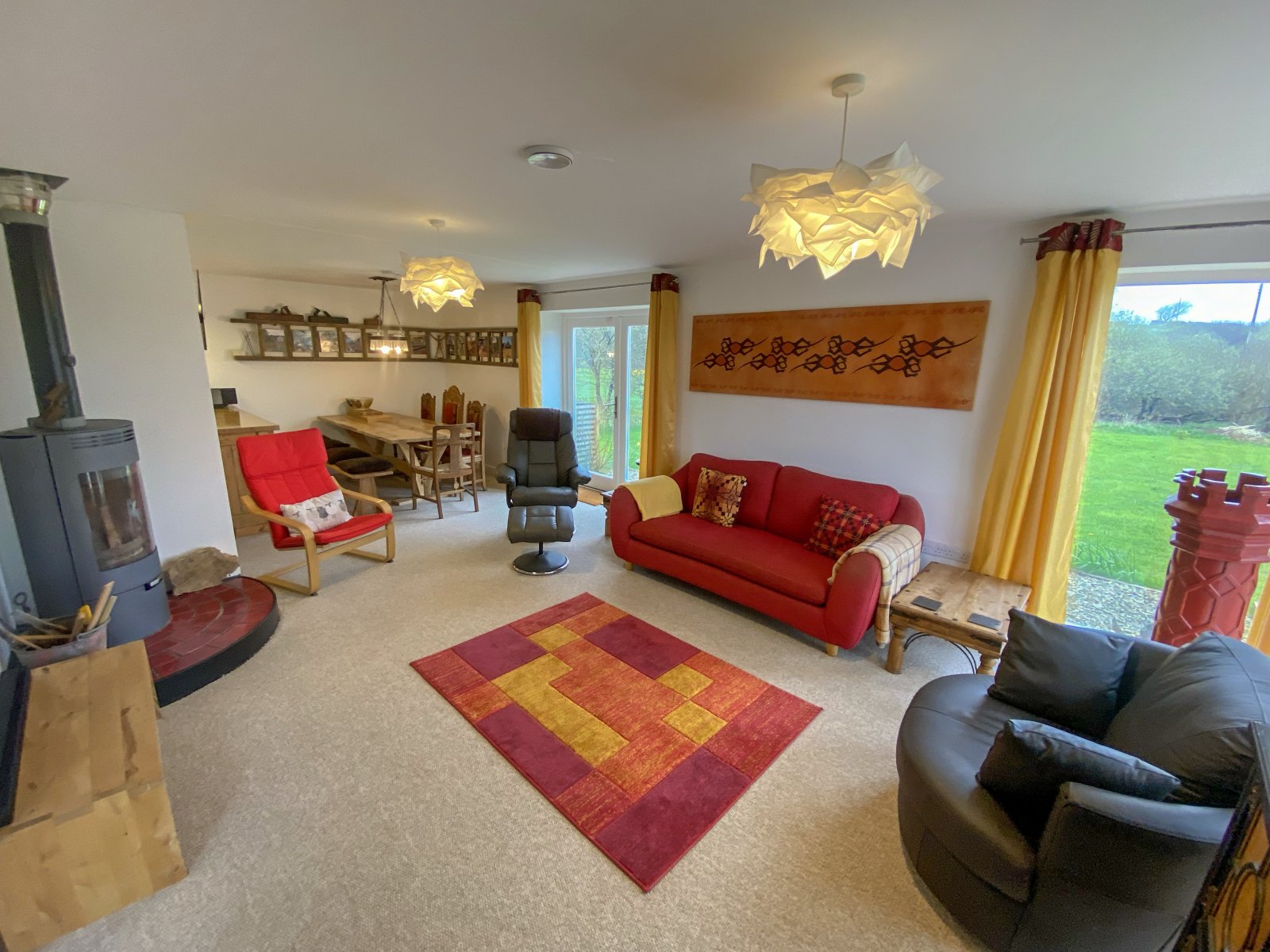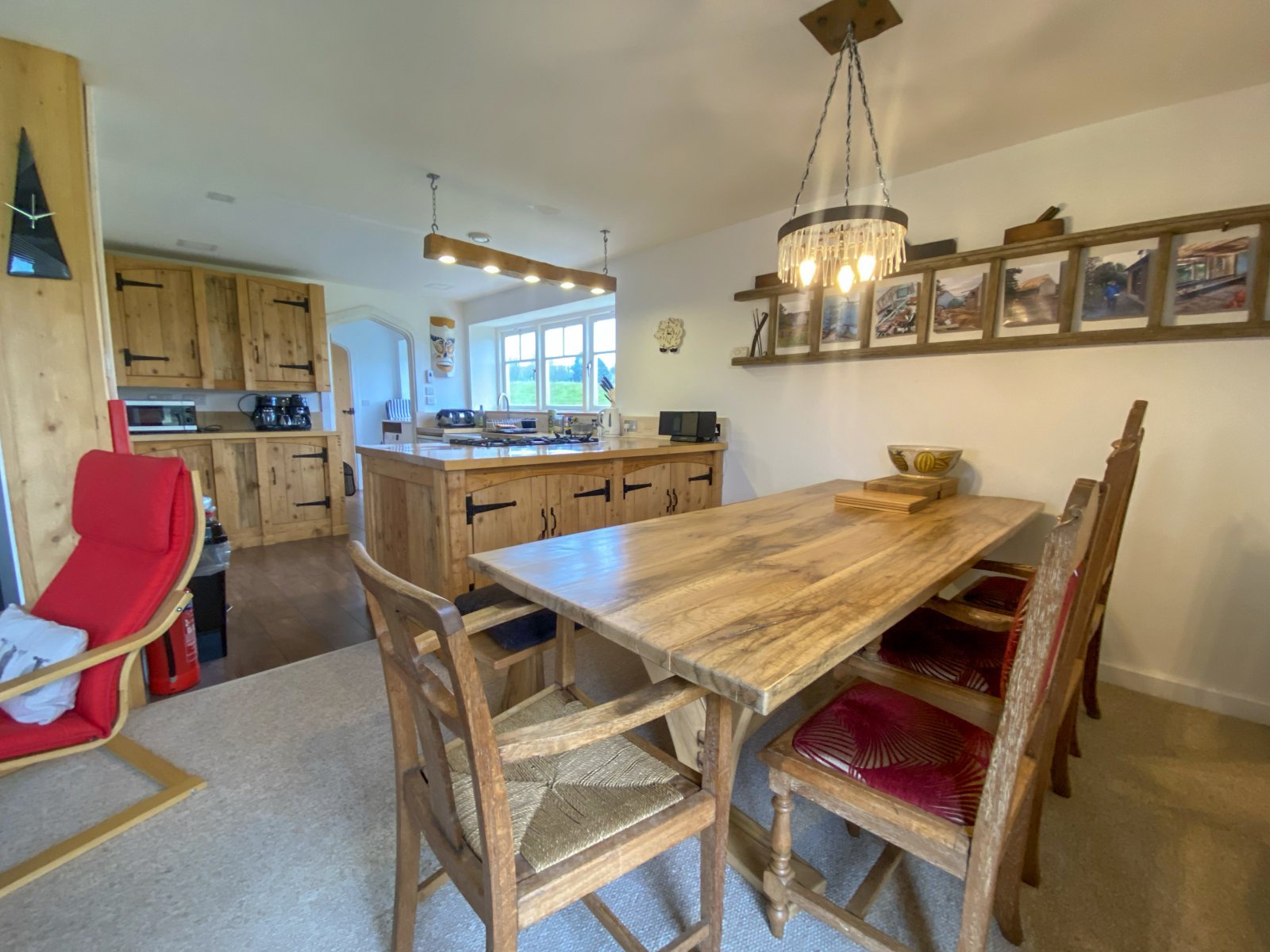 Through a Douglas Fir solid pine door to the open-plan L-shaped lounge/diner/kitchen. Benefitting from triple-glazed front & side aspect, windows and side access French doors, carpeted flooring, drop lighting over dining table, pendant lights x 2, solid-fuel burner and open-plan access to;