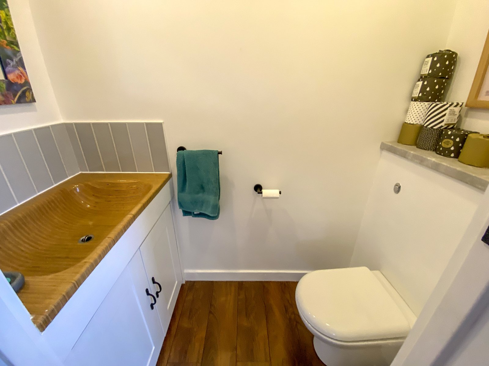 Ground floor WC with integrated loo, vanity unit with bespoke wood wash basin. LED lighting.