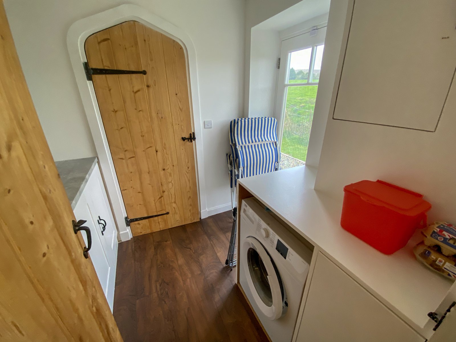 Hnady utility space, benefitting from laminate flooring, rear access door, base units with plumbing for washing machine, low-energy LED lighting and access to;