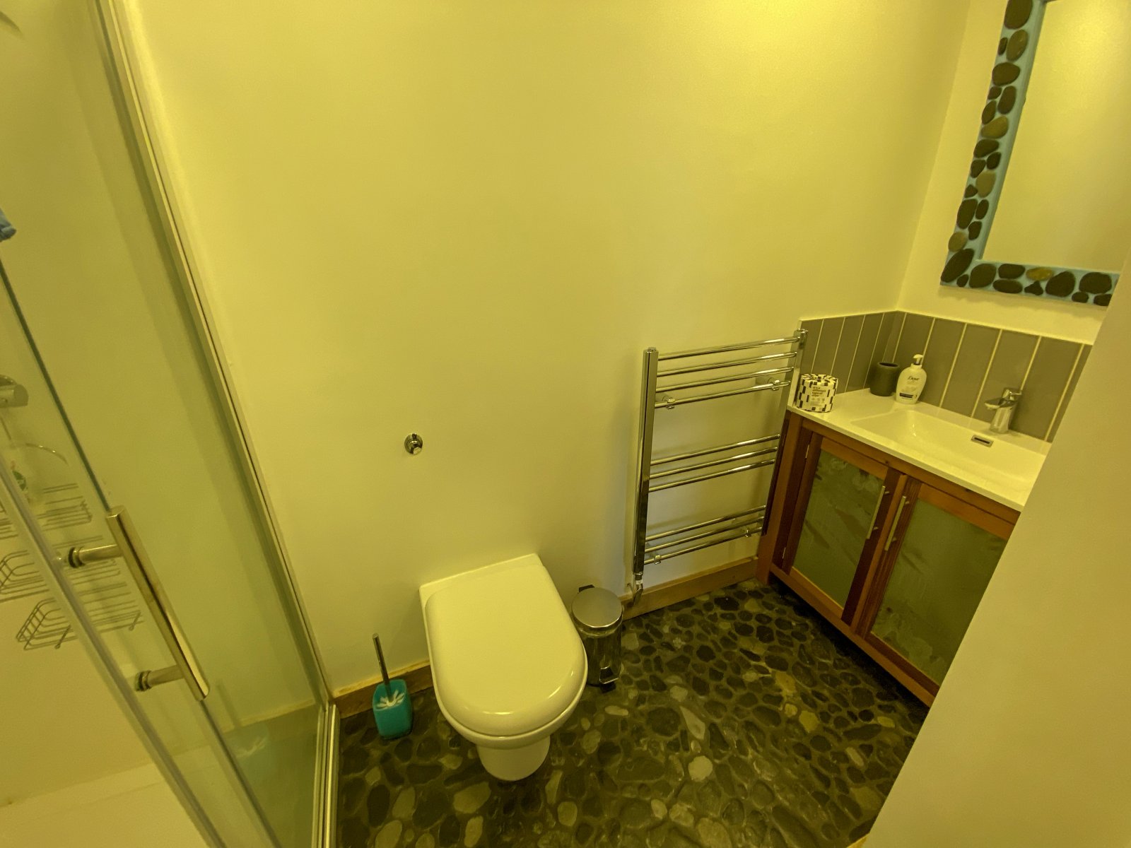 Quirky en suite bathroom comprising of bespoke pebble set flooring with underfloor heating, vanity wash basin, double shower unit and WC.
