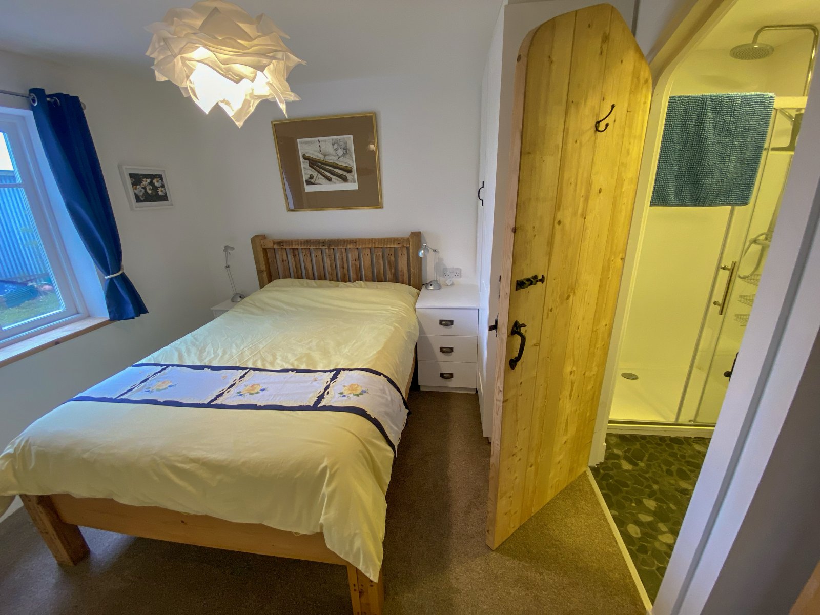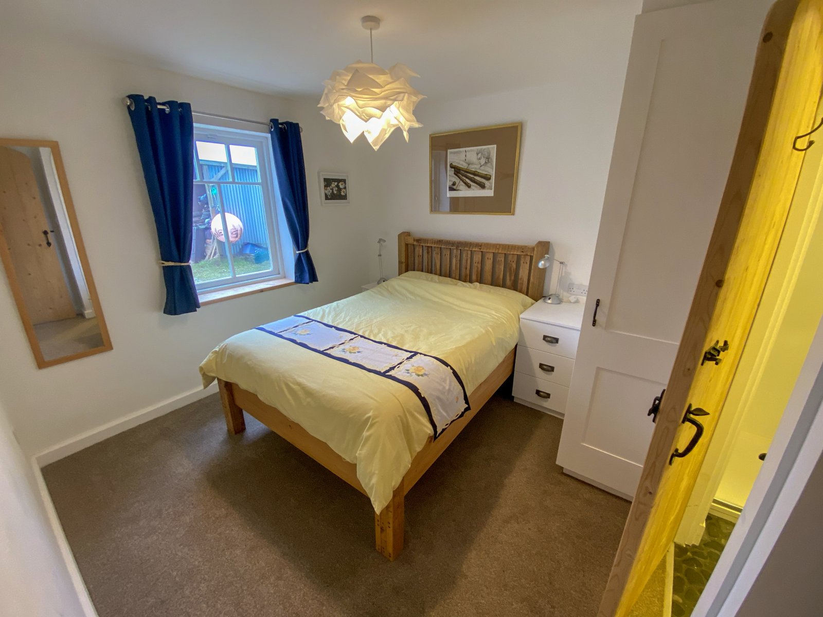 Cosy double-bedroom space, benefitting from carpeted flooring, bay window with triple glazed glass, pendant light, integrated storage.